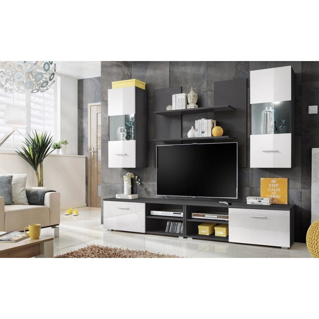 Obývací stěna v bílém lesku a s korpusem v šedé matné barvě KN1112
