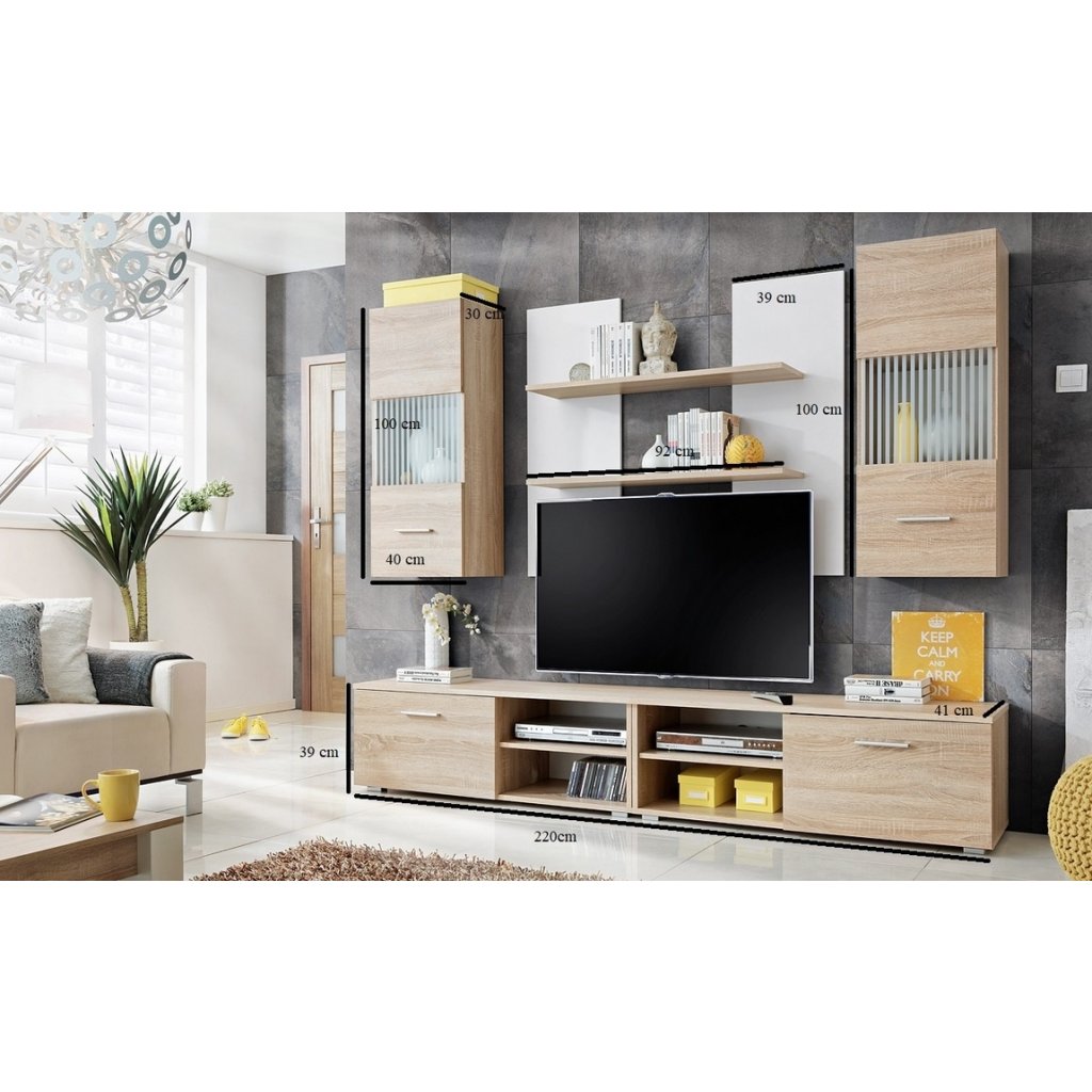 Obývací stěna je navržena v jednoduchém provedení, které působí moderním dojmem a každému obývacímu pokoji dodá stylový nádech. Velmi oblíbená barevná kombinace šedé a bílé barvy dělají z obývací stěny elegantní kousek, který nevyjde nikdy z módy. Sestava se skládá z (šířka/hloubka/výška v cm): TV stolek (220x39x41), 2x prosklená závěsná vitrína (40x100x30), panel s policemi (šíře police 92 cm a deska na zadní stěnu 39x100). Celkové rozměry sestavy jsou 220 cm x 185 cm x 41 cm. Doporučujeme do vitrín dokoupit LED osvětlení, které ve večerních hodinách vytvoří příjemnou útulnou atmosféru. Čela dvířek jsou vyrobeny z kvalitní MDF v bílém lesku. Korpusy jsou vyrobeny z kvalitního lamina (16 mm) v šedé matné barvě. Úchytky jsou plastové. Obývací stěna se prodává vcelku, jednotlivé díly nelze koupit zvlášť. Pokud vás nezaujalo toto barevné provedení, tak v naší nabídce naleznete stěnu i v jiné barvě.