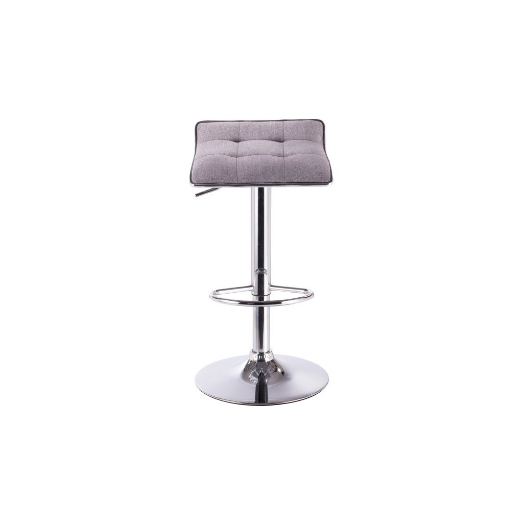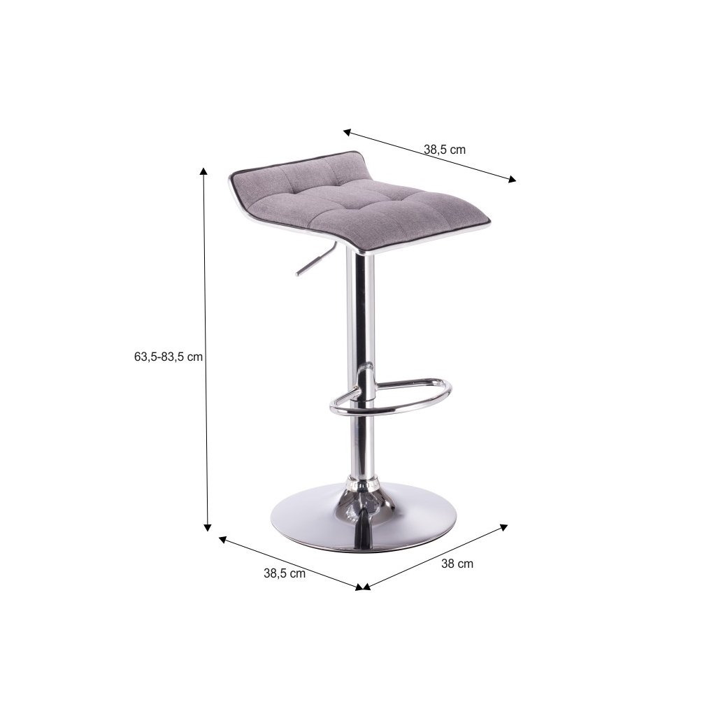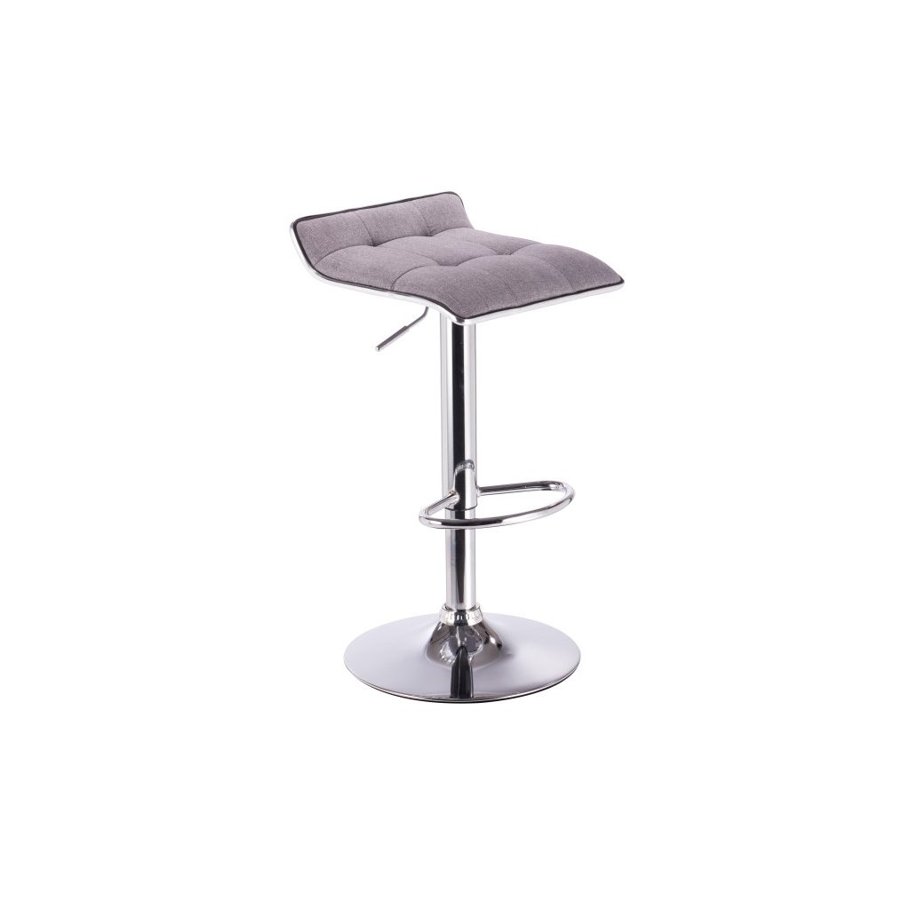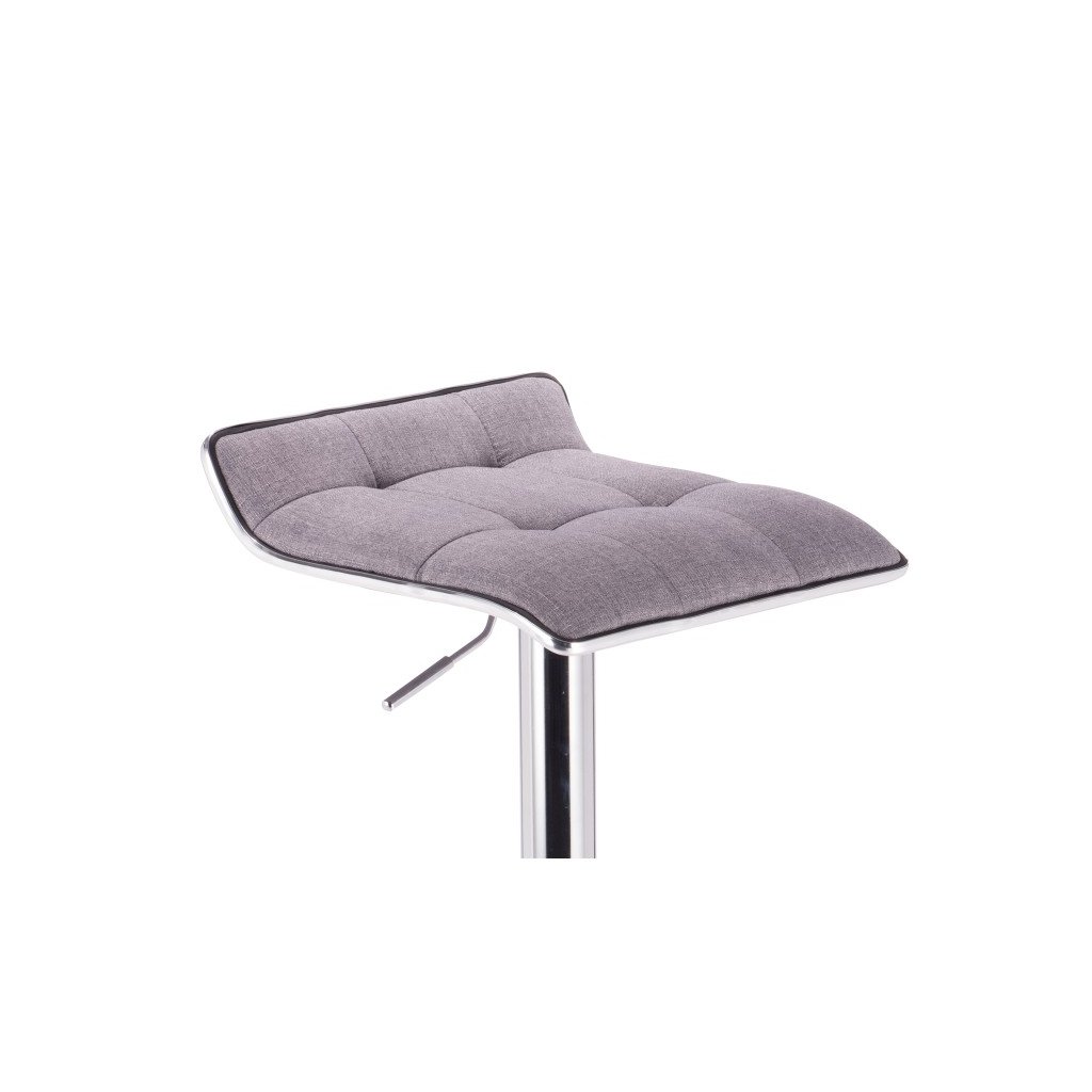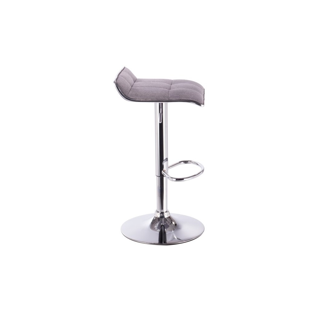 Otočná a výškově nastavitelná barová židle s čalouněným sedákem v šedé barvě.