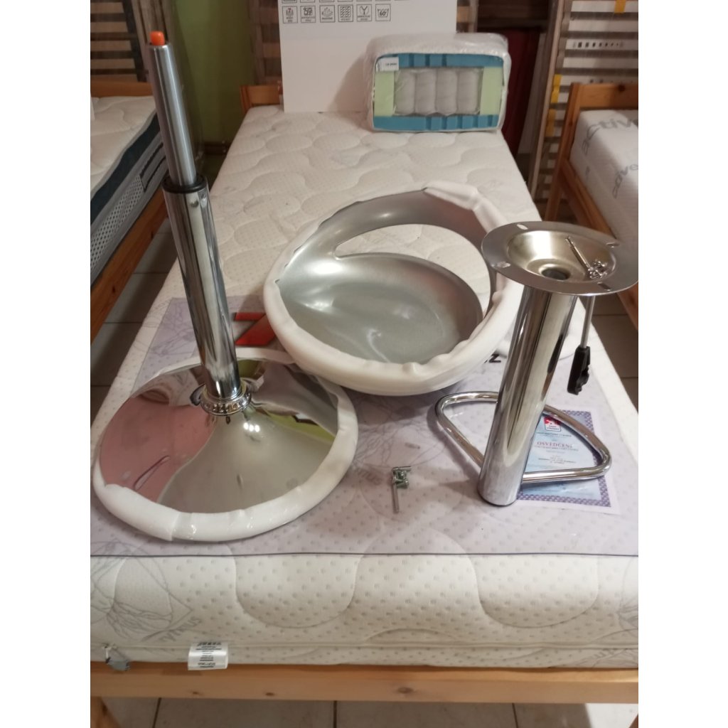 Jedná se o II. jakost - drobné důlky na spodním chromovém talíři. Důlky vykazují lehkou rez. Židle částečně smontována - píst umístění ve spodním podstavci židle. Vše na fotografiích ve fotogalerii.