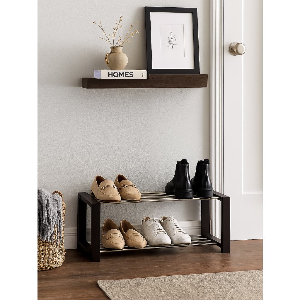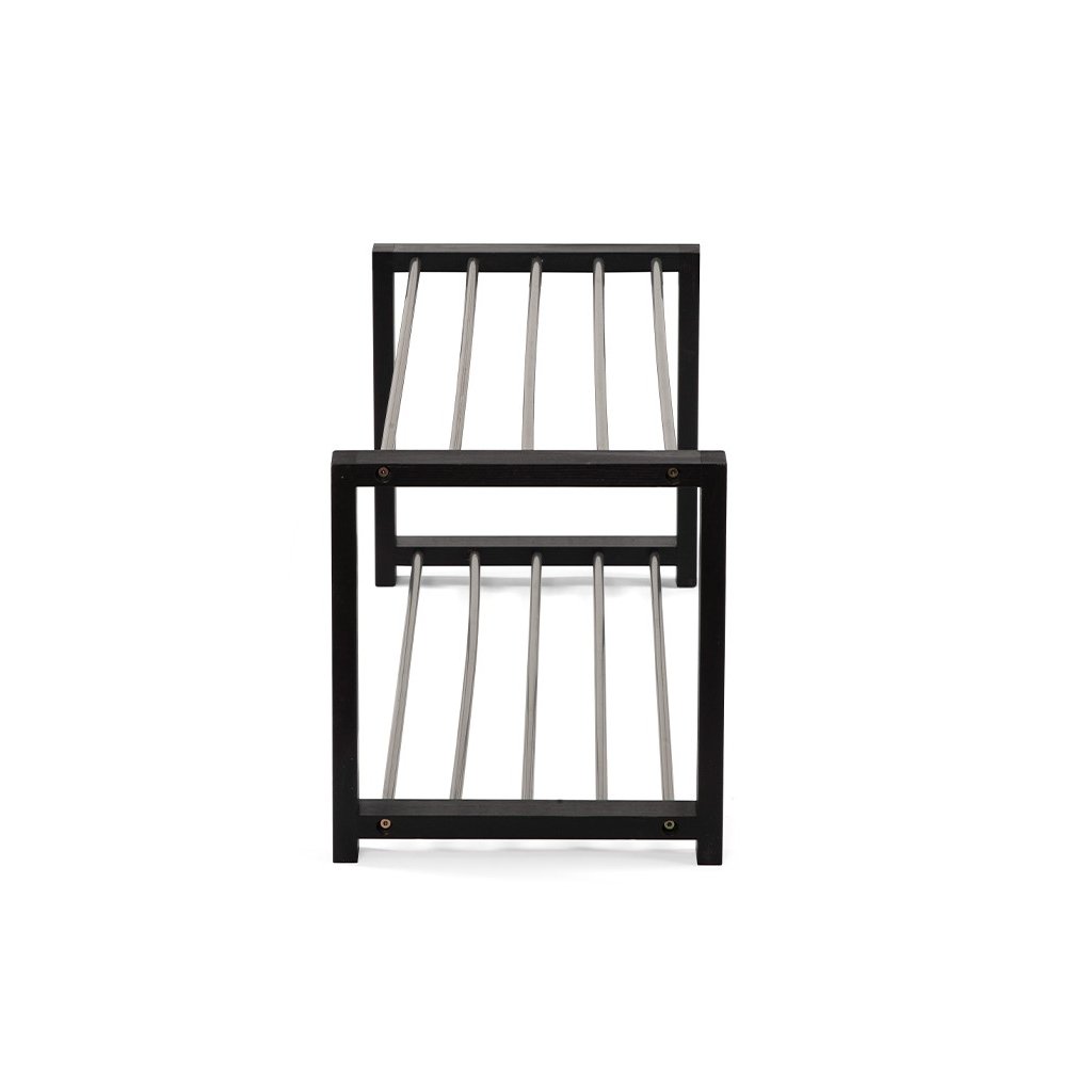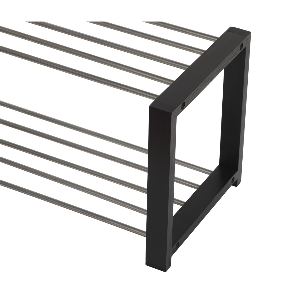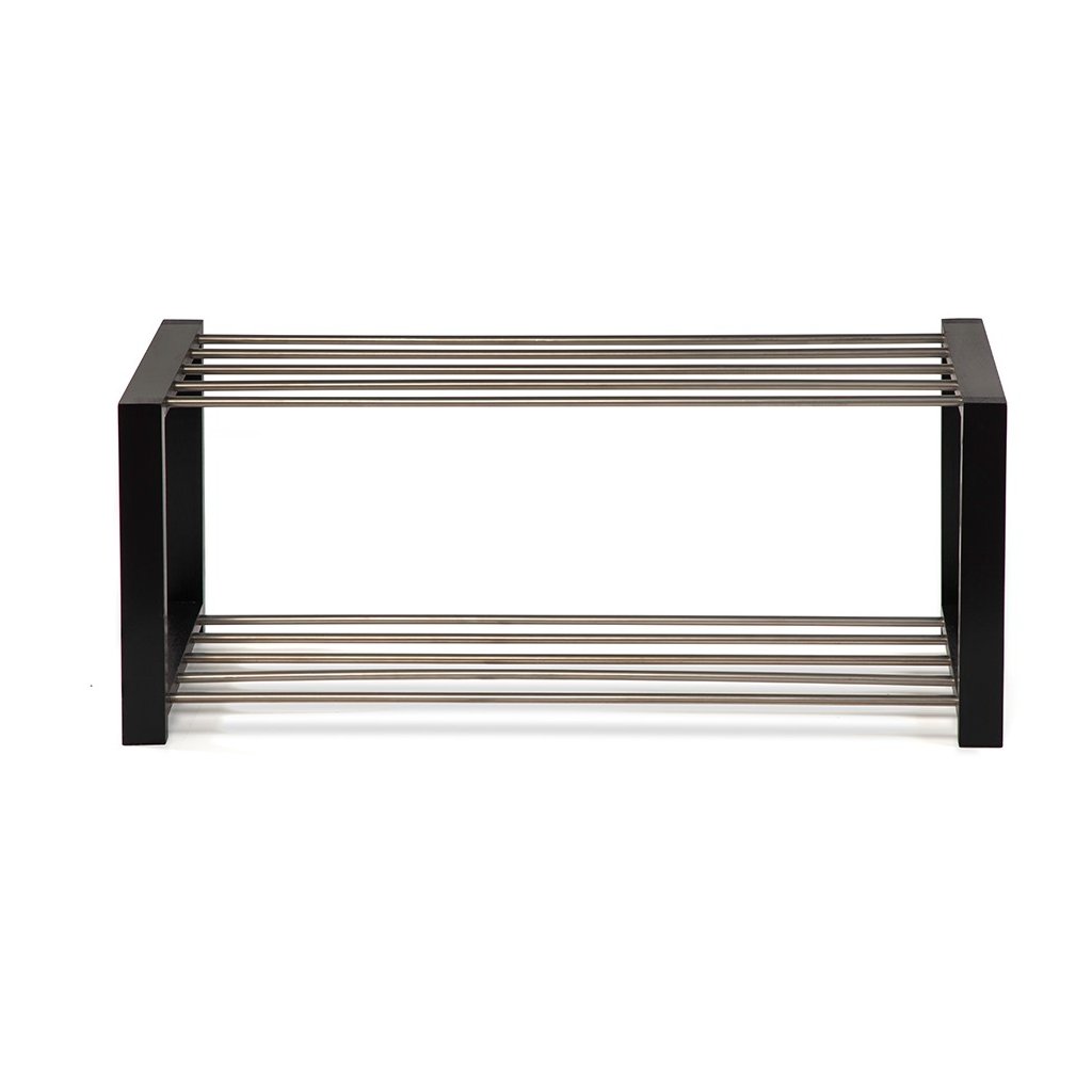 Jednoduchý a praktický botník se dvěma patry pro úsporu místa. Konstrukce z pevných kovových trubek zajišťuje stabilitu a dlouhou životnost. Boční dřevěné rámy poskytují pevnou oporu a zároveň elegantní vzhled. Otevřený design umožňuje dobré větrání obuvi a snadný přístup. Vhodný do předsíně, chodby nebo šatny pro každodenní použití.