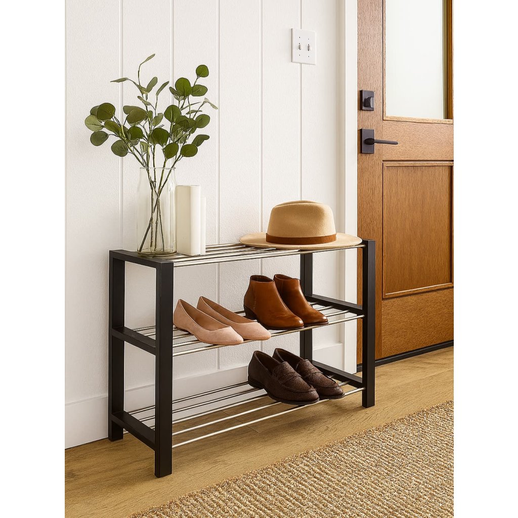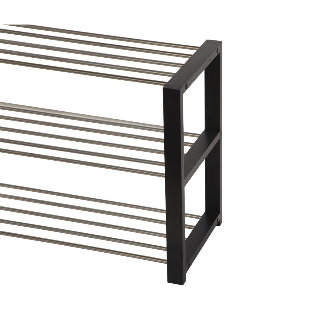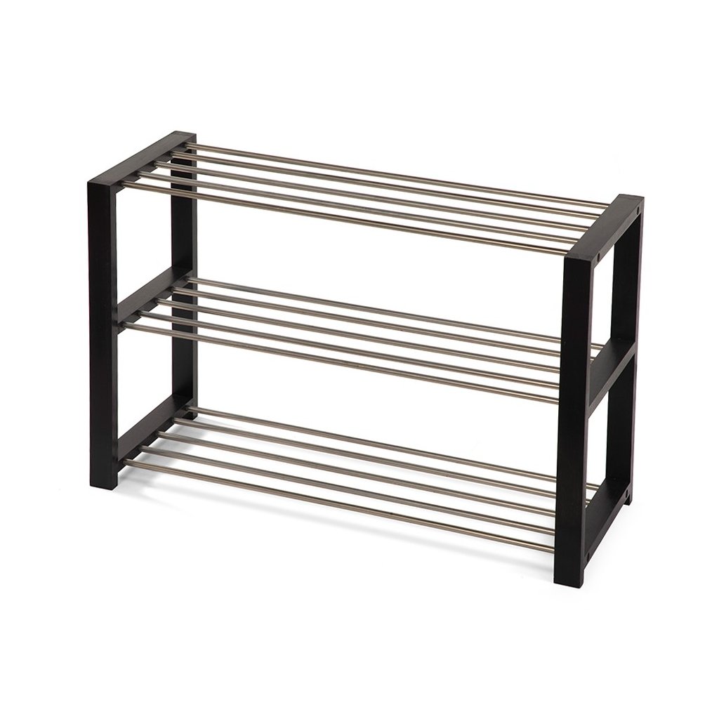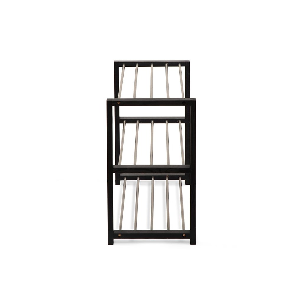 Jednoduchý a praktický botník se dvěma patry pro úsporu místa. Konstrukce z pevných kovových trubek zajišťuje stabilitu a dlouhou životnost. Boční dřevěné rámy poskytují pevnou oporu a zároveň elegantní vzhled. Otevřený design umožňuje dobré větrání obuvi a snadný přístup. Vhodný do předsíně, chodby nebo šatny pro každodenní použití.