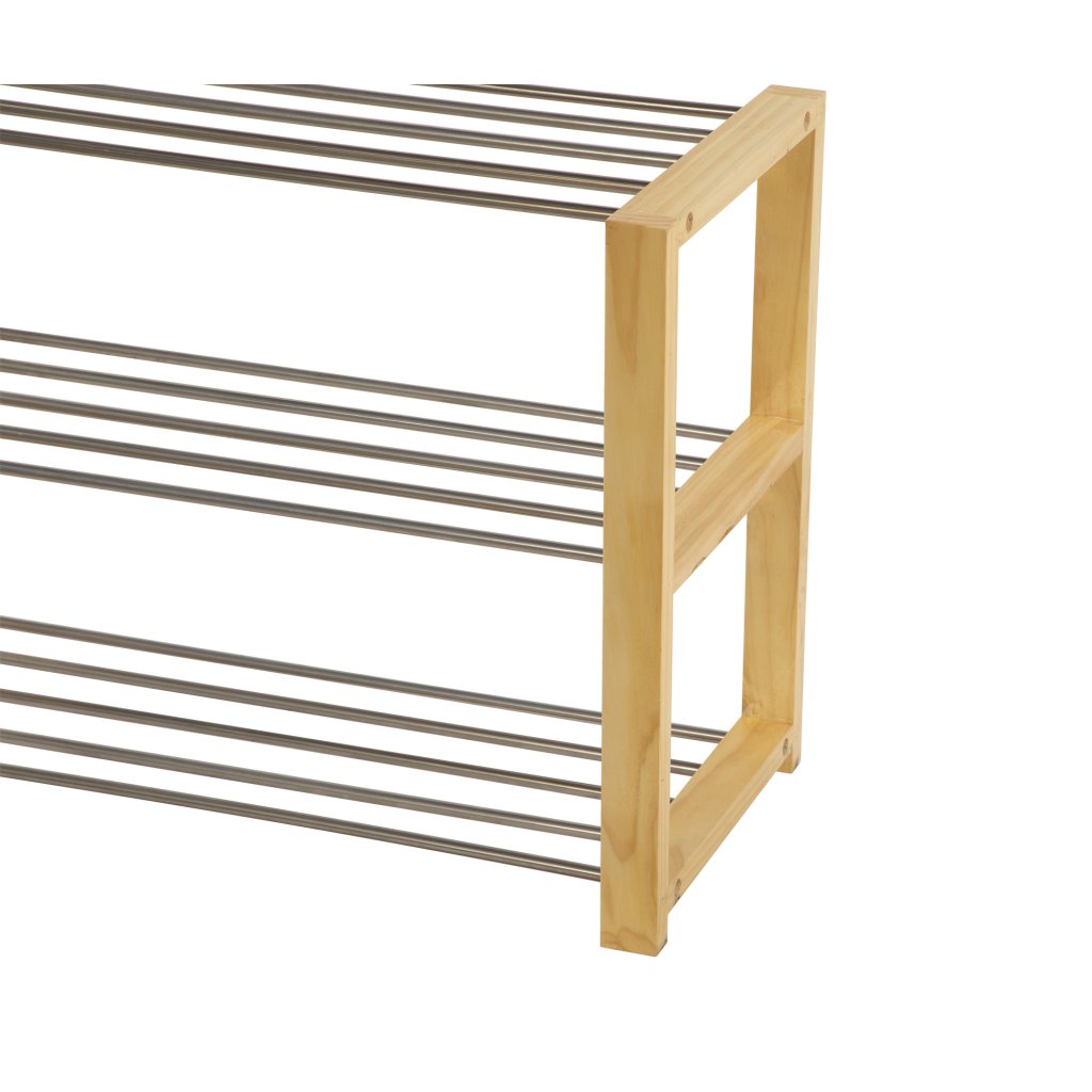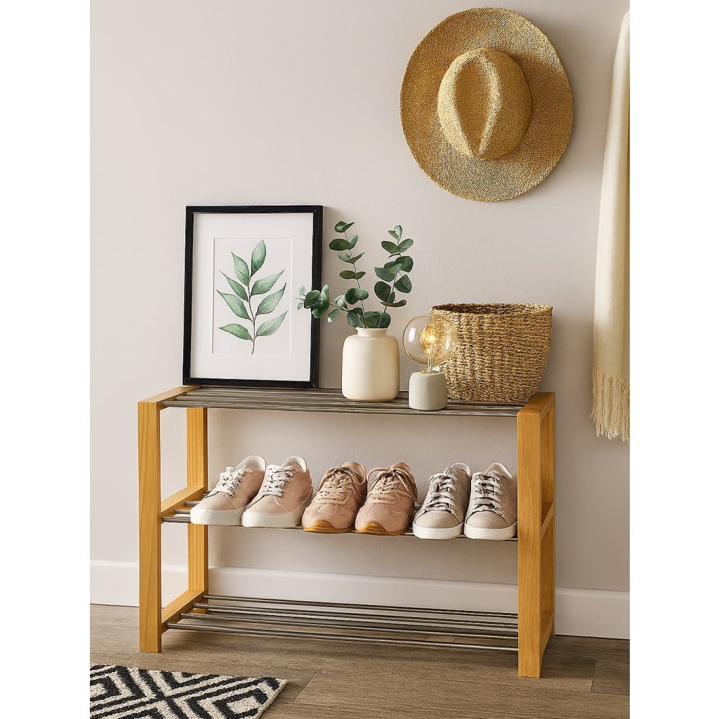 Jednoduchý a praktický botník se dvěma patry pro úsporu místa. Konstrukce z pevných kovových trubek zajišťuje stabilitu a dlouhou životnost. Boční dřevěné rámy poskytují pevnou oporu a zároveň elegantní vzhled. Otevřený design umožňuje dobré větrání obuvi a snadný přístup. Vhodný do předsíně, chodby nebo šatny pro každodenní použití.