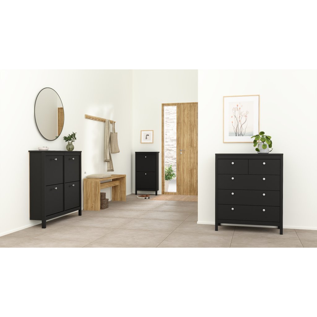 Užijte si svěží a moderní vzhled série Madrid, která zdůrazňuje čisté linie a současnou eleganci. Sortiment obsahuje širokou škálu nábytku pro kteroukoliv místnost ve vaší domácnosti. Každý kus je promyšleně vytvořen tak, aby hladce zapadl do vašeho stávajícího interiéru. Nábytek je k dispozici v moderní černé a nadčasové bílé barvě a nabízí dvě varianty úchytek: stylovou kůži nebo konzervativní úchytku pro osobitý styl v každém pokoji.