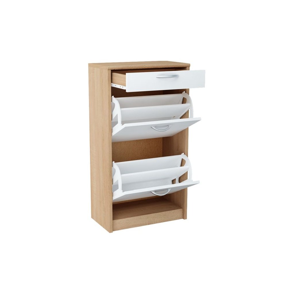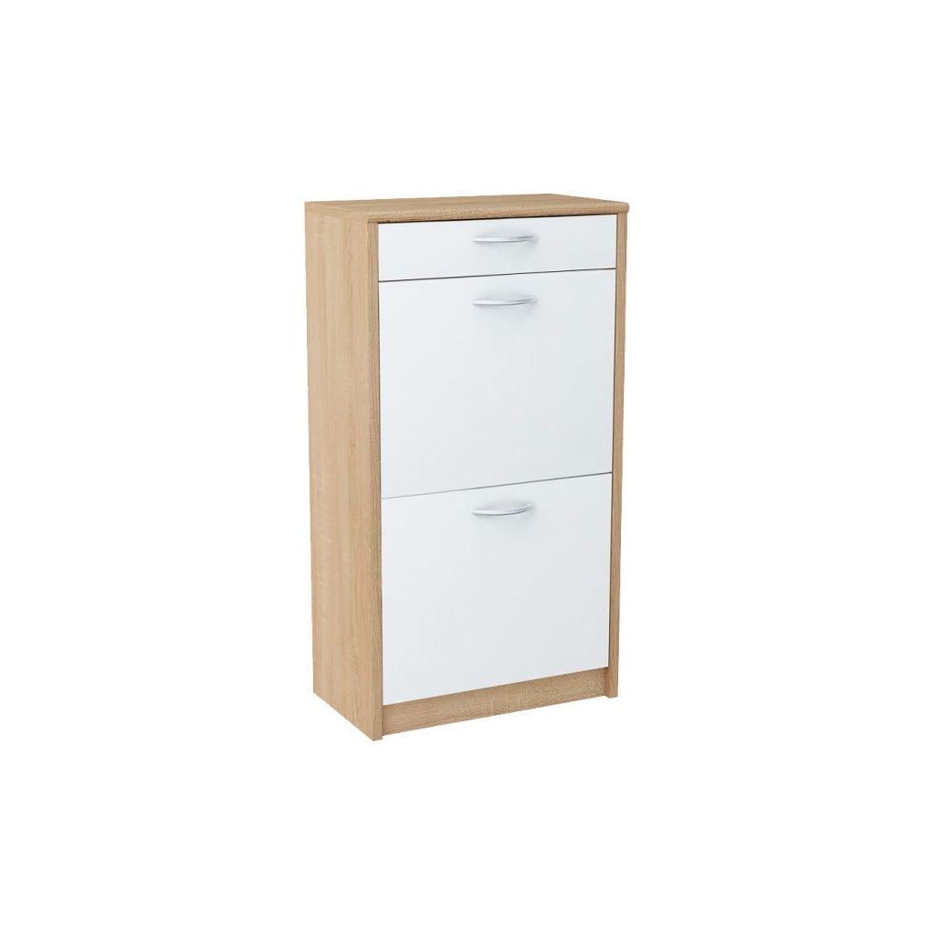 Dvoudveřový botník s 1 zásuvkou v moderním provedení. Korpus i dvířka jsou z kvalitní LTD, korpus v barvě dub sonoma a dvířka v barvě bílá mat. Lamino je odolné vůči vysokým teplotám, poškrábání a nárazům, hraněné ABS páskou. Jasně viditelná struktura dřeva. Pojezdy v zásuvce jsou kovové s plastovými kolečky. Dodáváme v demontovaném stavu.Doplňkové parametry