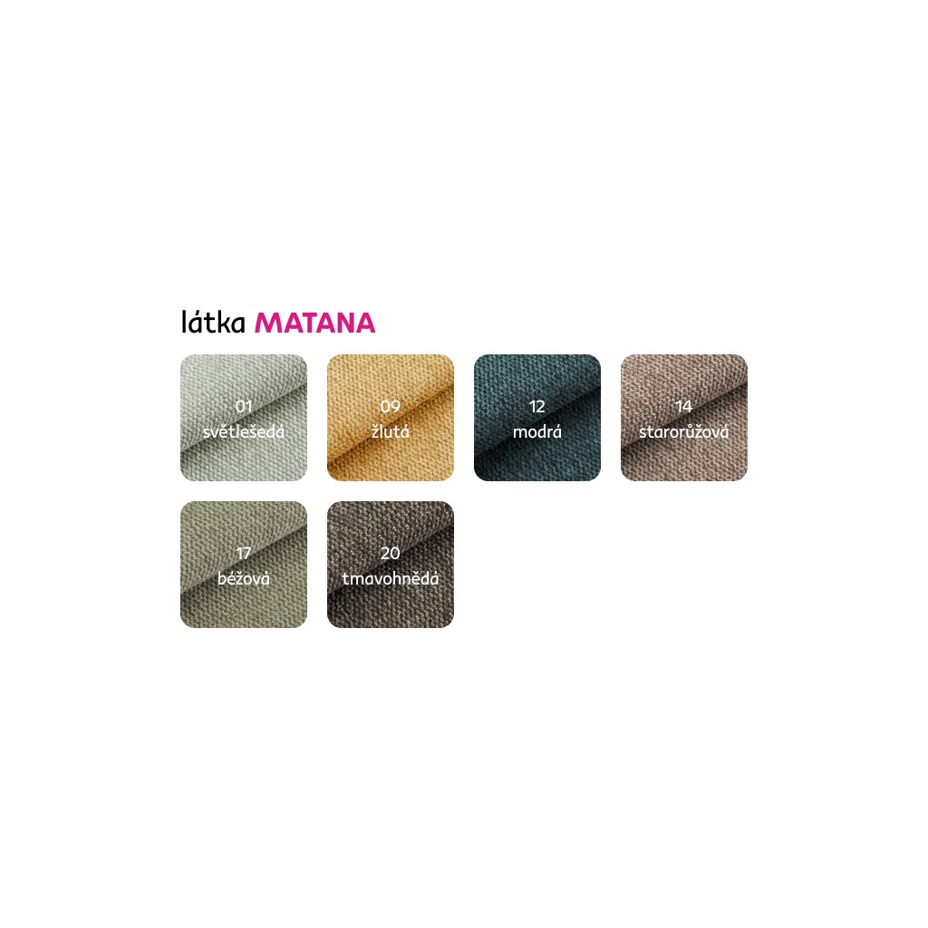 Možnost objednání v 6 barevných provedeních látky Matana v ceně 4.550 Kč. Při individuální objednávce je třeba zaplatit 20% zálohu z dané částky. Po uhrazení zálohy bude Váš požadavek zadán do výroby. Doba dodání 6-8 týdnů.