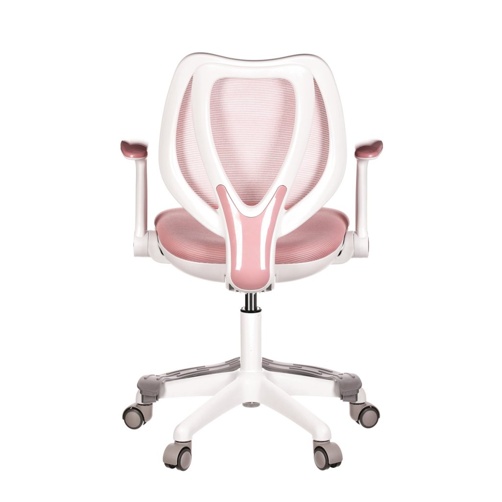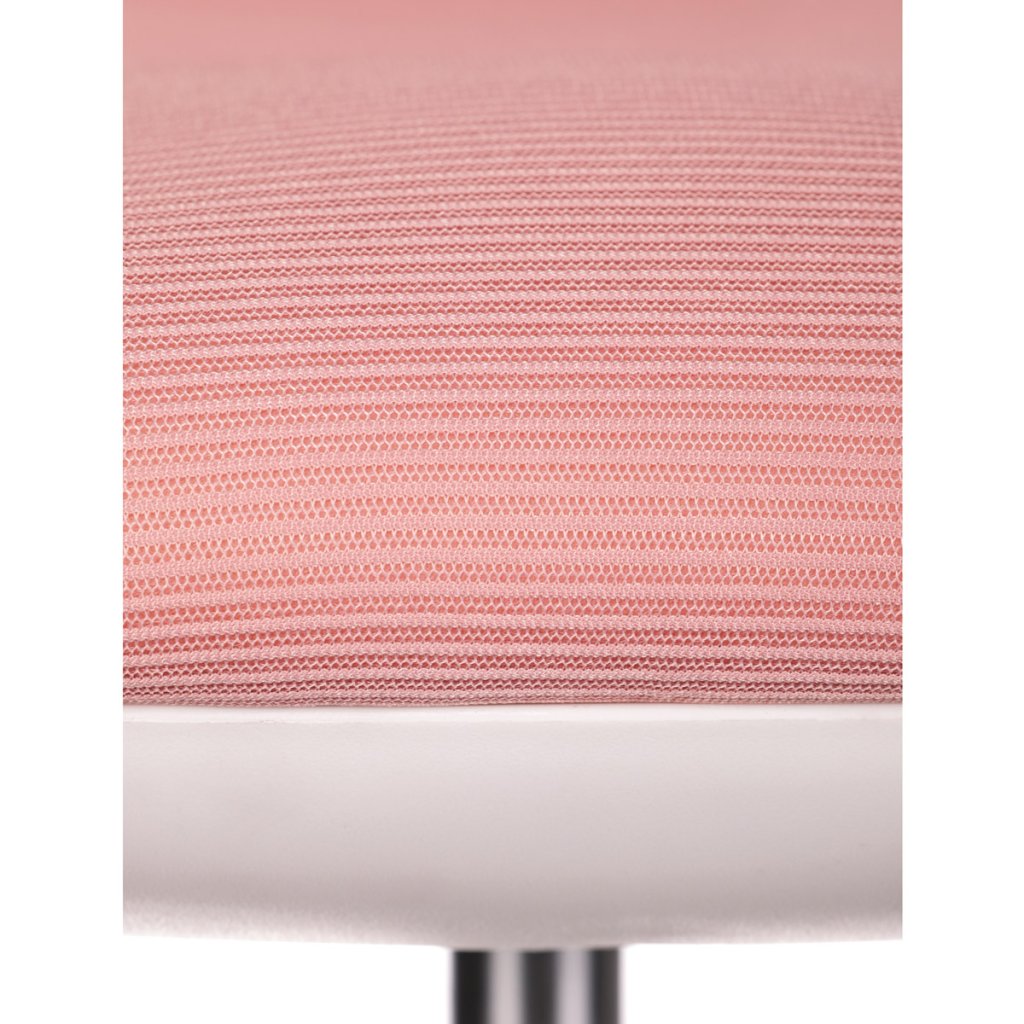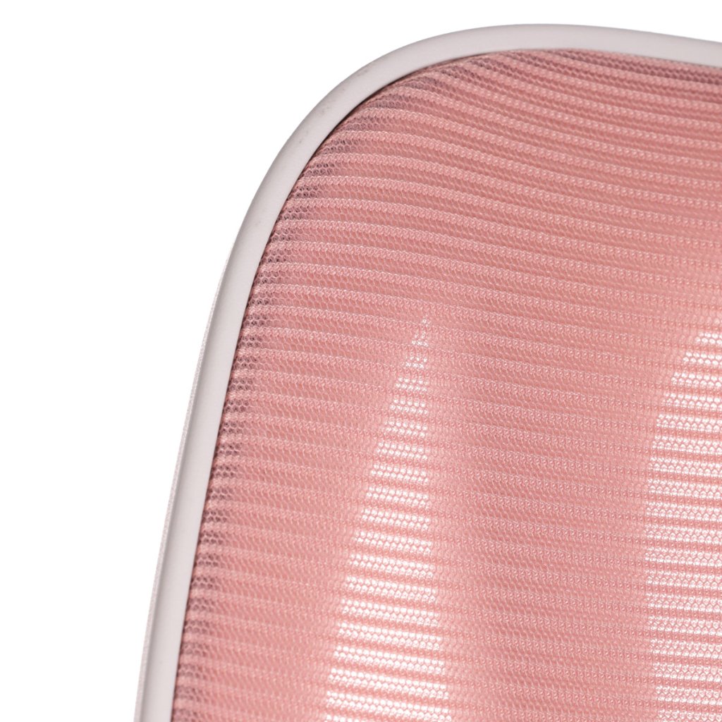Dětská židle, růžová síťovina, bílý plastový kříž, kolečka na tvrdé podlahy, podpěrka nohou AKZ101M. Dětská židle v příjemných pastelových barvách spolu s bílou kostrou nabízí jednoduchý a elegantní design. Židle má pevný opěrák potažený prodyšným síť...