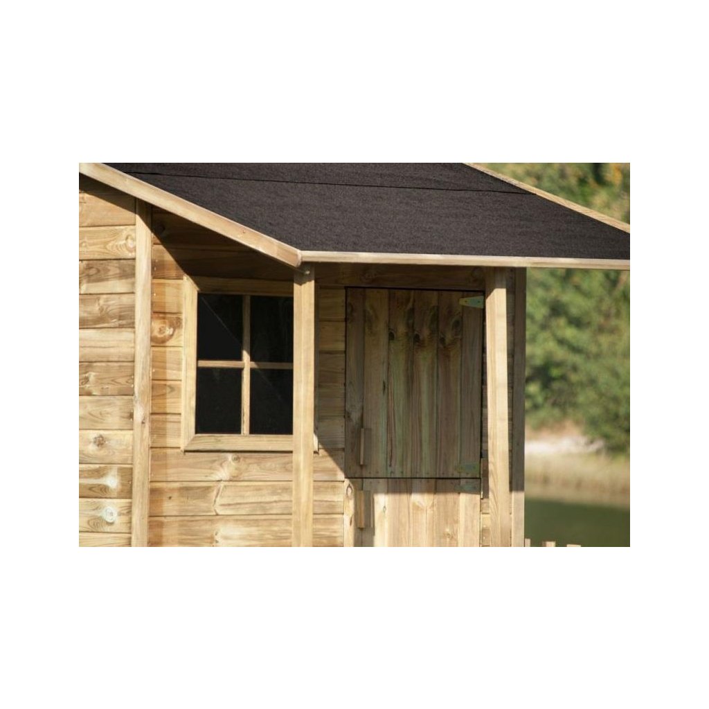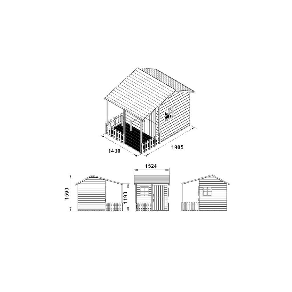 - Vybavení domku: dvoudílné dveře s oknem, 2 okna vyplněné průhledným plexisklem, lavička, zastřešená terasa, střešní krytina, sada montážních šroubů a spojovacího materiálu dle návodu.