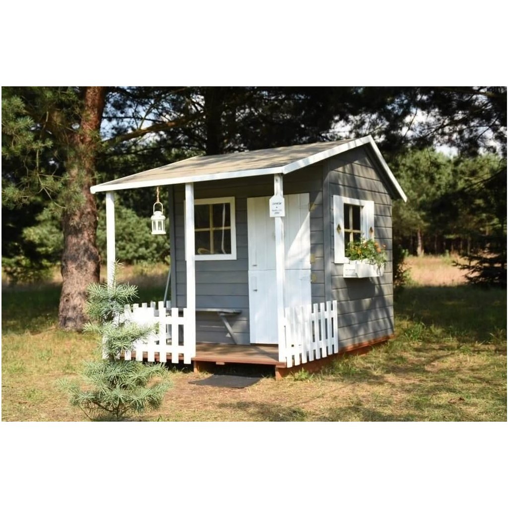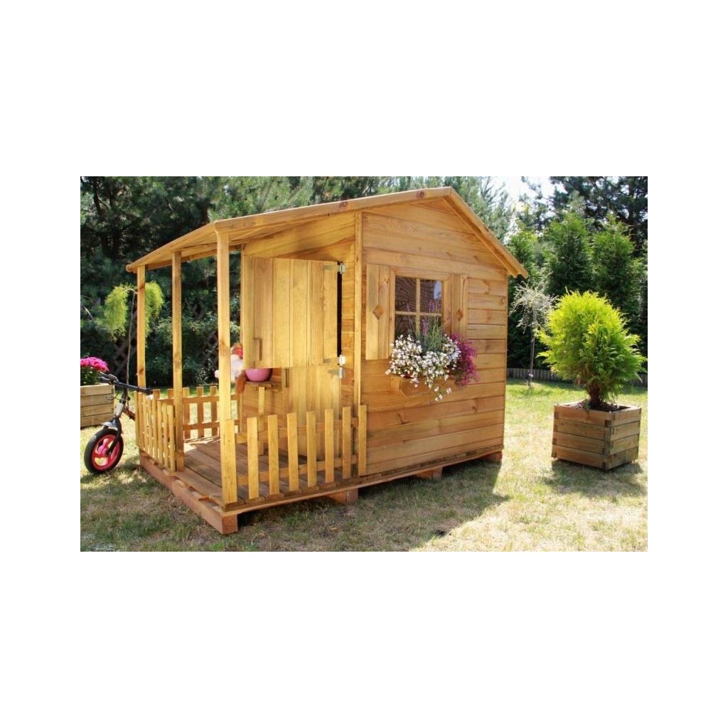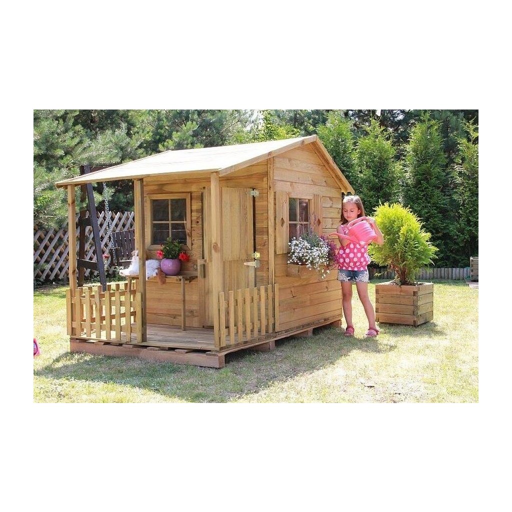 Dětský domek s teráskou je dodáván včetně podlahy a střešní krytiny. Borovicové dřevo, ošetřené zelenou tlakovou impregnací proti nepříznivým vlivům počasí a stárnutí, může být nedokonale začištěné díky strojovému opracování (nebrání však plnohodnotnému využití). Pokud bude dřevo vystavené nějaký čas povětrnostním vlivům, zelené zabarvení zcela zmizí a dřevo získá šedou patinu. Domečky a hřiště doporučujeme natřít oblíbenou barvou Vašeho dítěte.