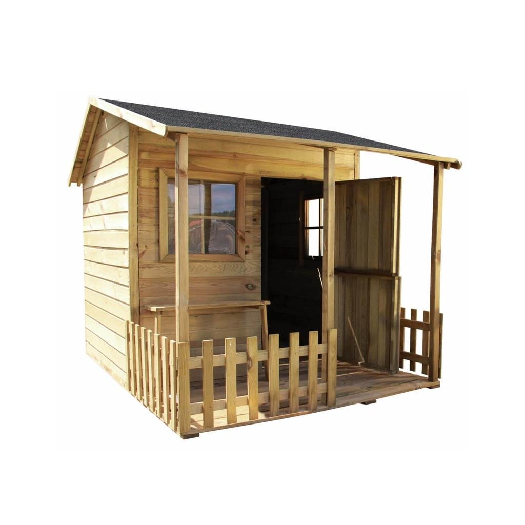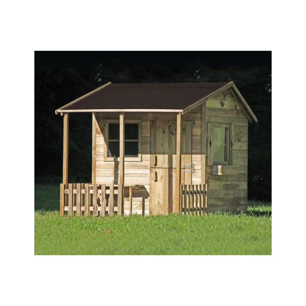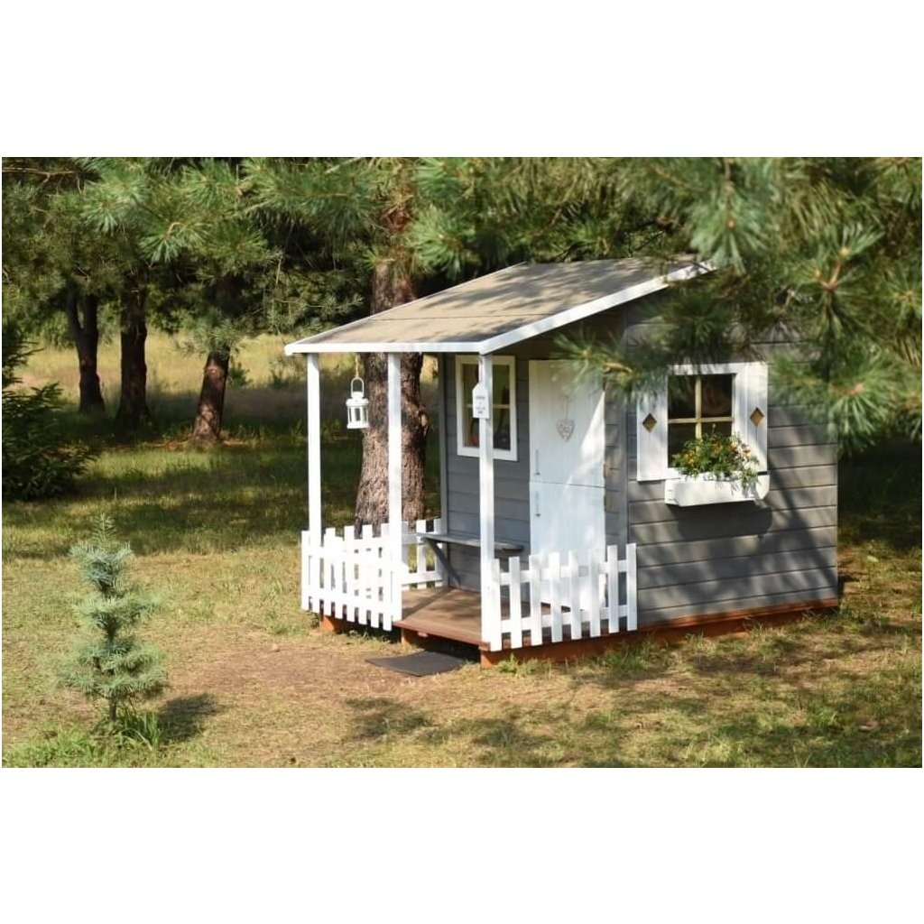 Dětský domek s teráskou je dodáván včetně podlahy a střešní krytiny. Borovicové dřevo, ošetřené zelenou tlakovou impregnací proti nepříznivým vlivům počasí a stárnutí, může být nedokonale začištěné díky strojovému opracování (nebrání však plnohodnotnému využití). Pokud bude dřevo vystavené nějaký čas povětrnostním vlivům, zelené zabarvení zcela zmizí a dřevo získá šedou patinu. Domečky a hřiště doporučujeme natřít oblíbenou barvou Vašeho dítěte.