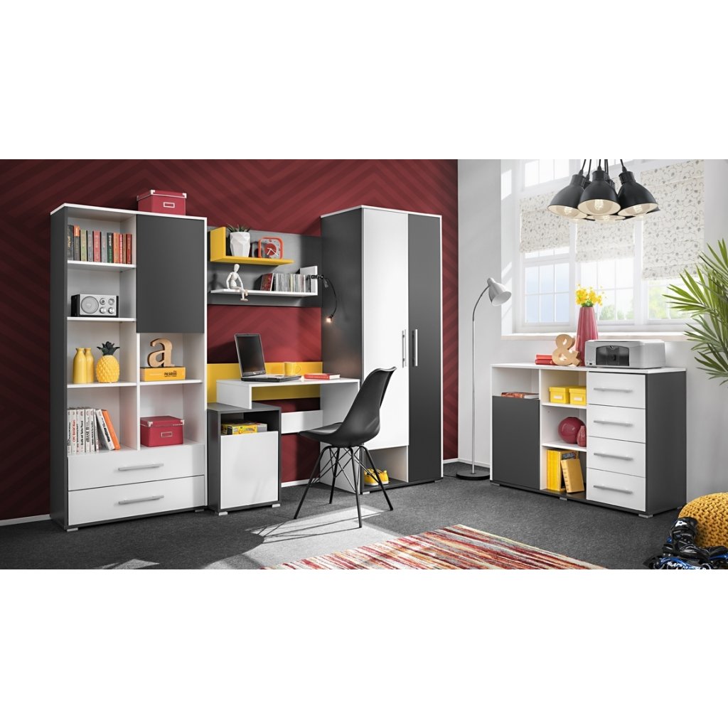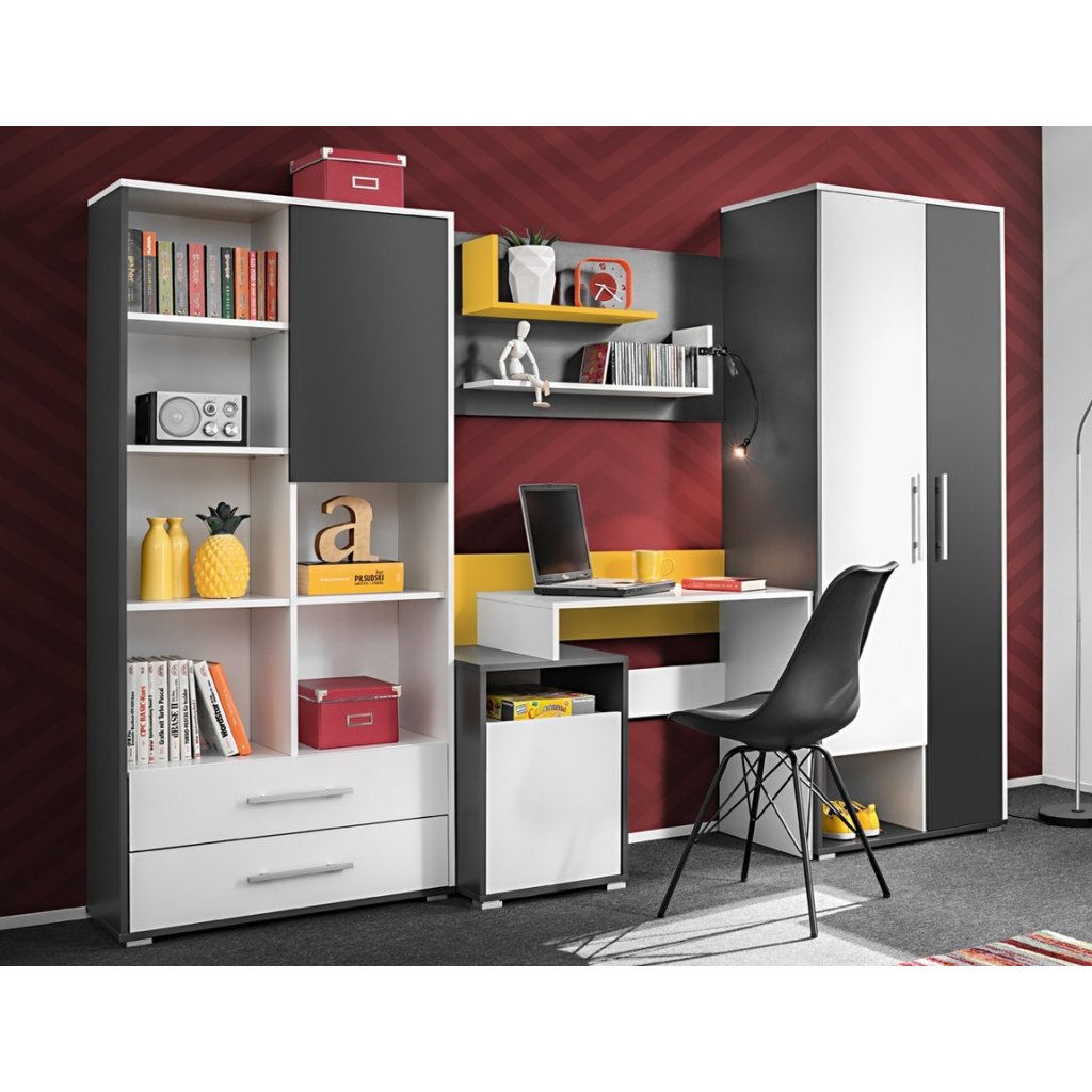 Dětská sestava je navržena v moderním provedení a má takové univerzální barevné zpracování, že se hodí jak pro holky, tak i pro kluky a to do každého interiéru. Kombinace bílého matu a šedé barvy je lehce oživena energickou žlutou barvou. Tato dětská sestava se skládá ze 4 dílů (š/v/h) - šatní skříň 70 x 190 x 50 cm, PC stolek 100 x 75,5 x 50 cm, panel s policemi 100 x 50 cm a regál se zásuvkami 80 x 173 x 33 cm. Sestavu jde koupit pouze celou, jednotlivé díly nelze koupit zvlášť. Celá sestava je vyrobena z kvalitního lamina. Nabízíme také možnost dokoupení komody ze stejné kolekce ve stejném barevném provedení.