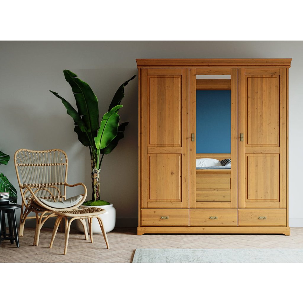 Šatní skříň z borovice nejen krásně vypadá, ale má doslova schopnost přizpůsobit se vašim potřebám. Díky nastavitelným policím na obou stranách můžete ovlivnit, jak vypadá zevnitř. Na tyč uprostřed můžete pověsit košile, šaty nebo svrchní oděvy. Prostor pod hrazdičkou nebo police nad ní může být ideálním místem pro uložení tašek . Další prostor poskytují tři zásuvky umístěné ve spodní části nábytku. Na Meblekatmandu.pl najdete i další barevné varianty šatních skříní a velikostí (např. dvoudveřové skříně a mnohem větší 4dveřové skříně ). Velkou výhodou šatní skříně je zrcadlo umístěné ve střední části výrobku. Doporučujeme i ostatním Toskánský nábytek z naší kolekce Tuscany.
