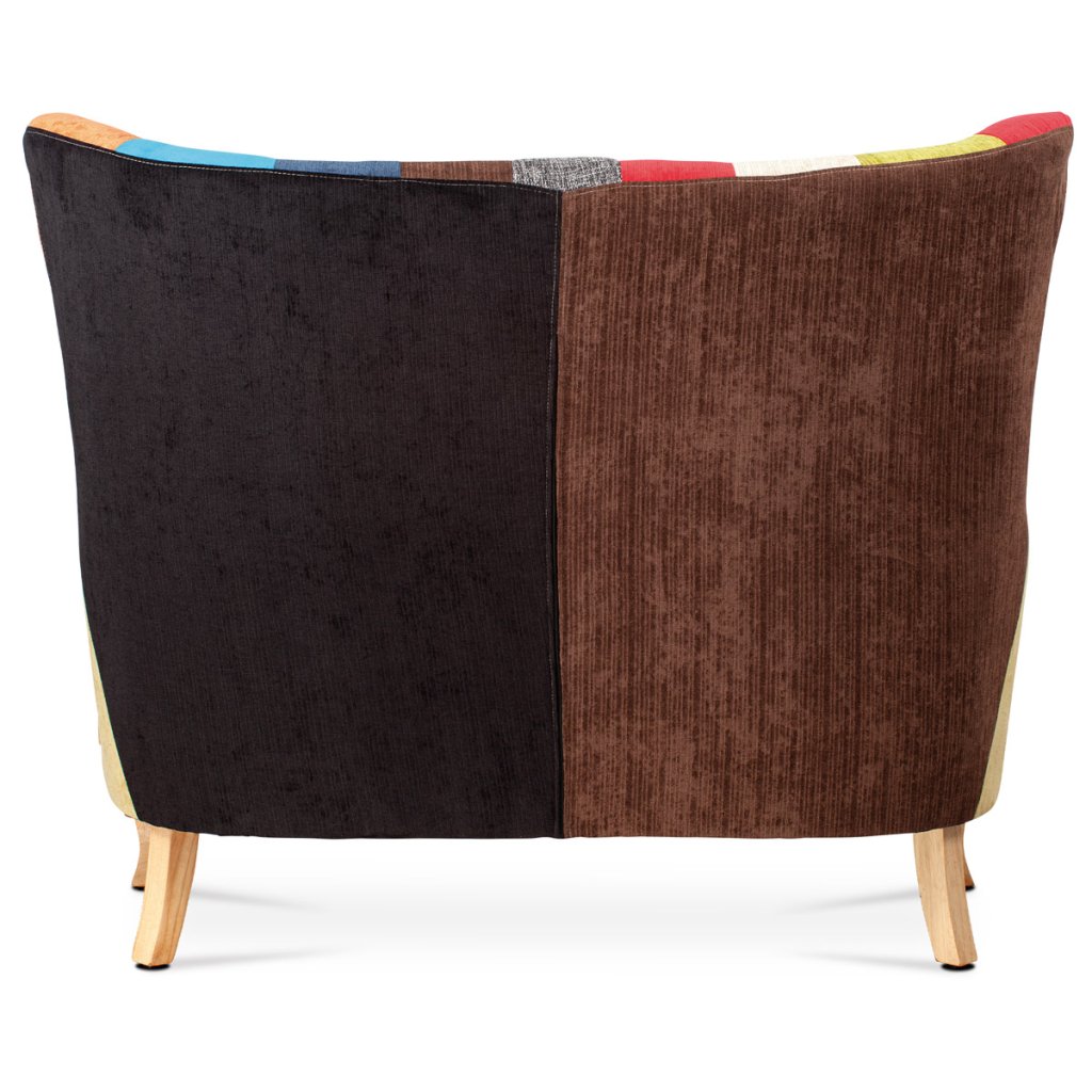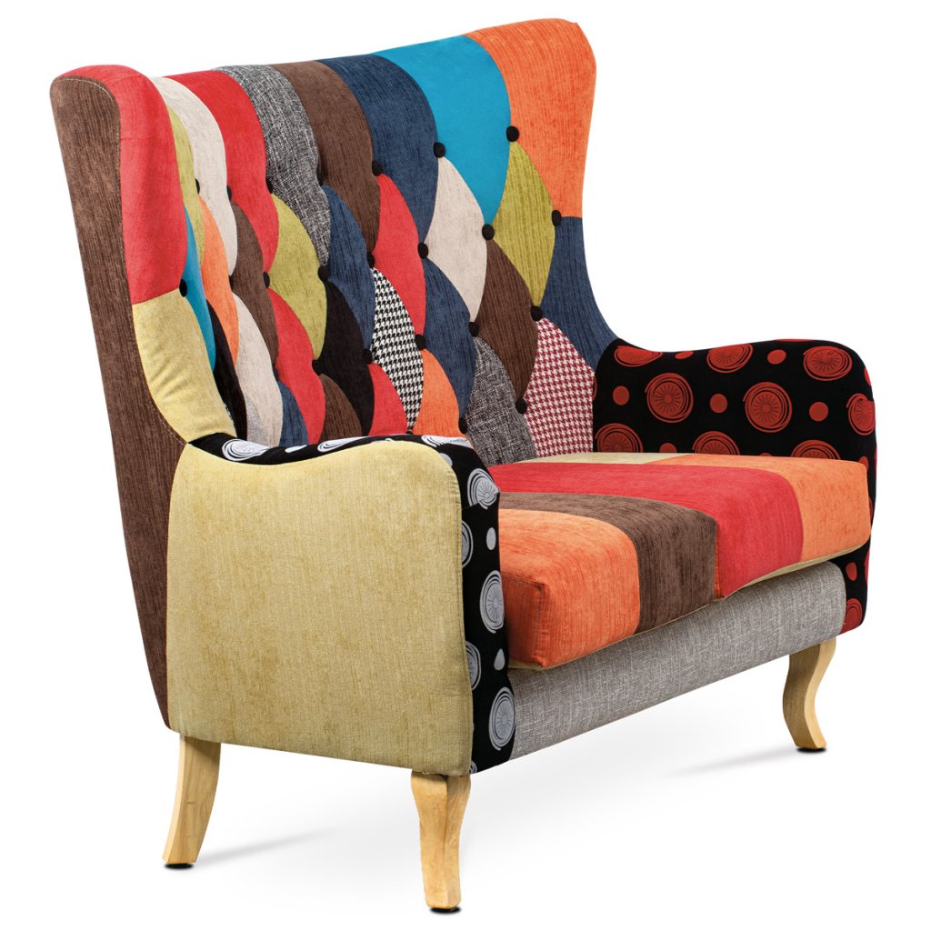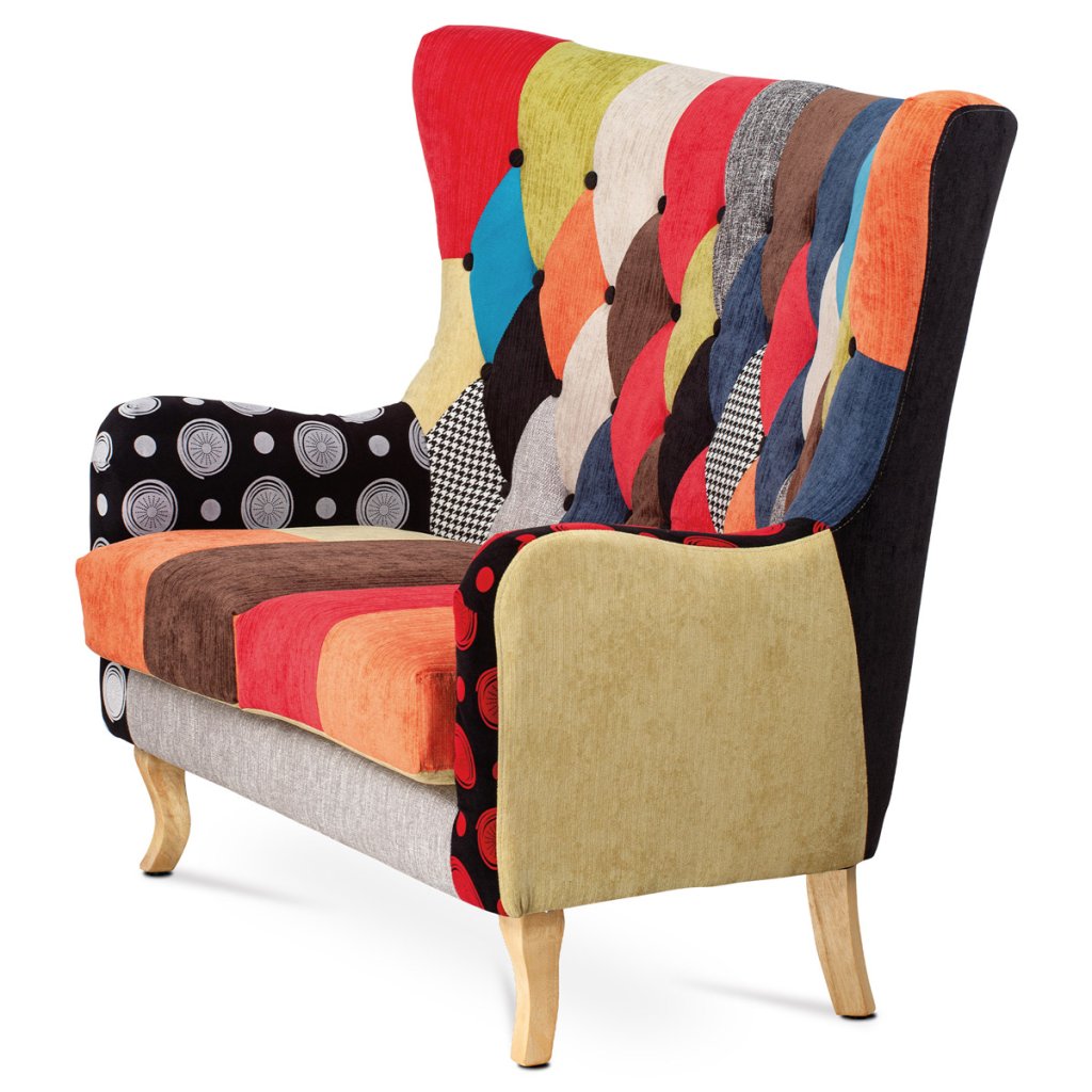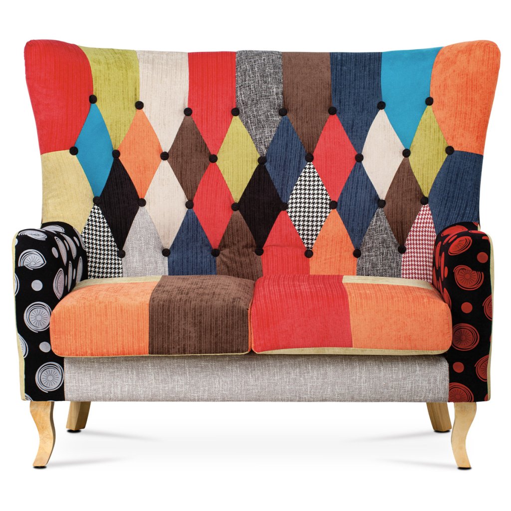 Dvojsedačka, potah látka patchwork, dřevěné nohy, masiv kaučukovník AK-100 PW2