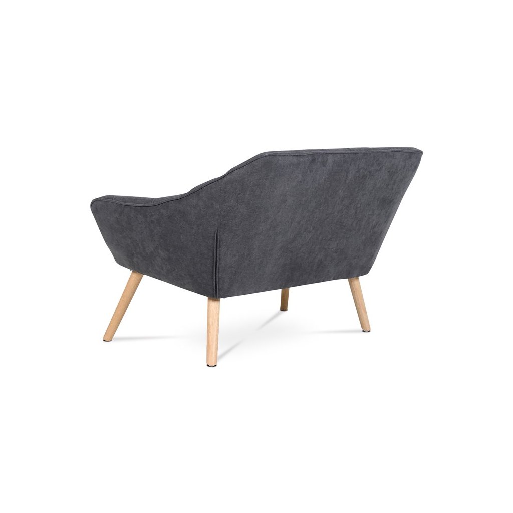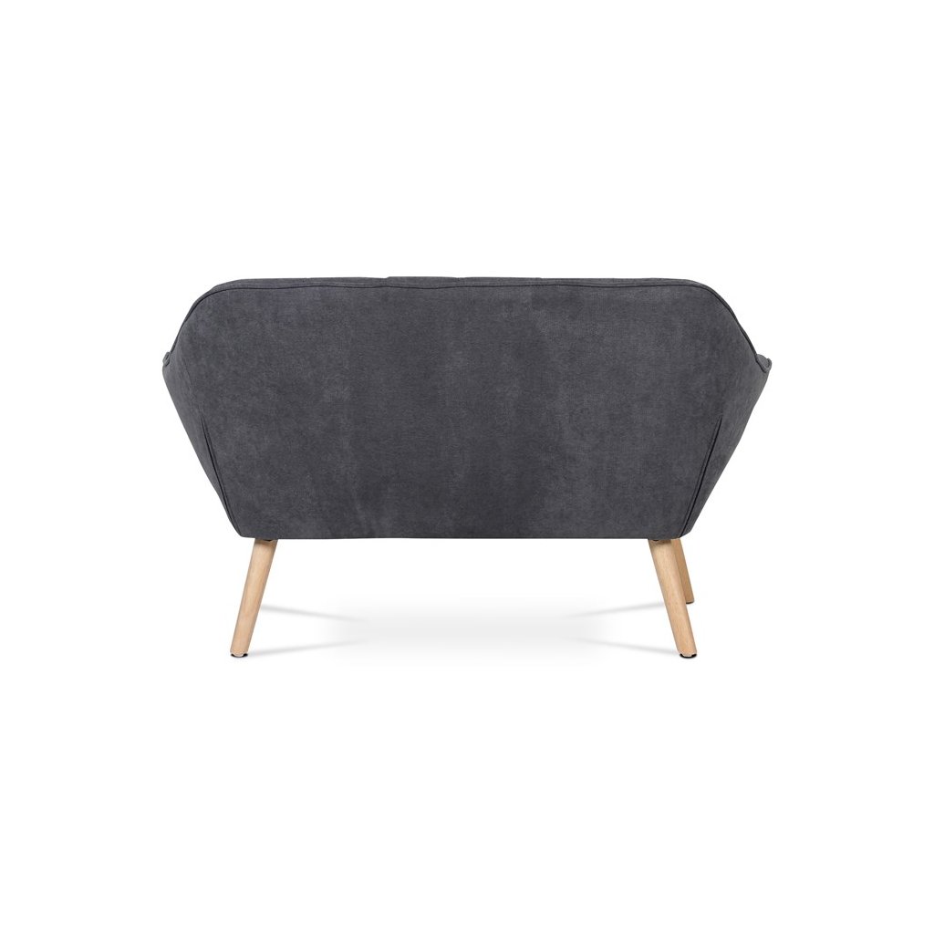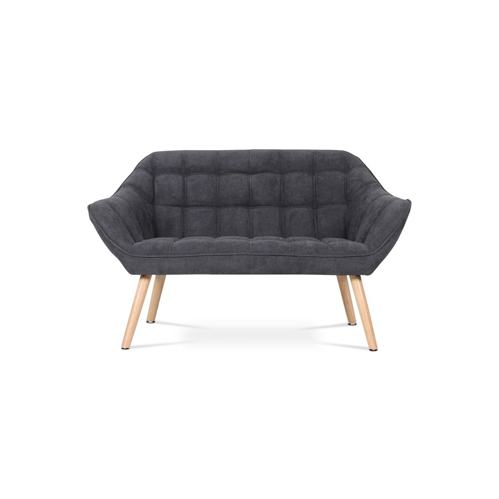 Dvousedačka, potah tmavě šedá látka, dřevěné nohy, masiv kaučukovník, přírodní odstín a lak