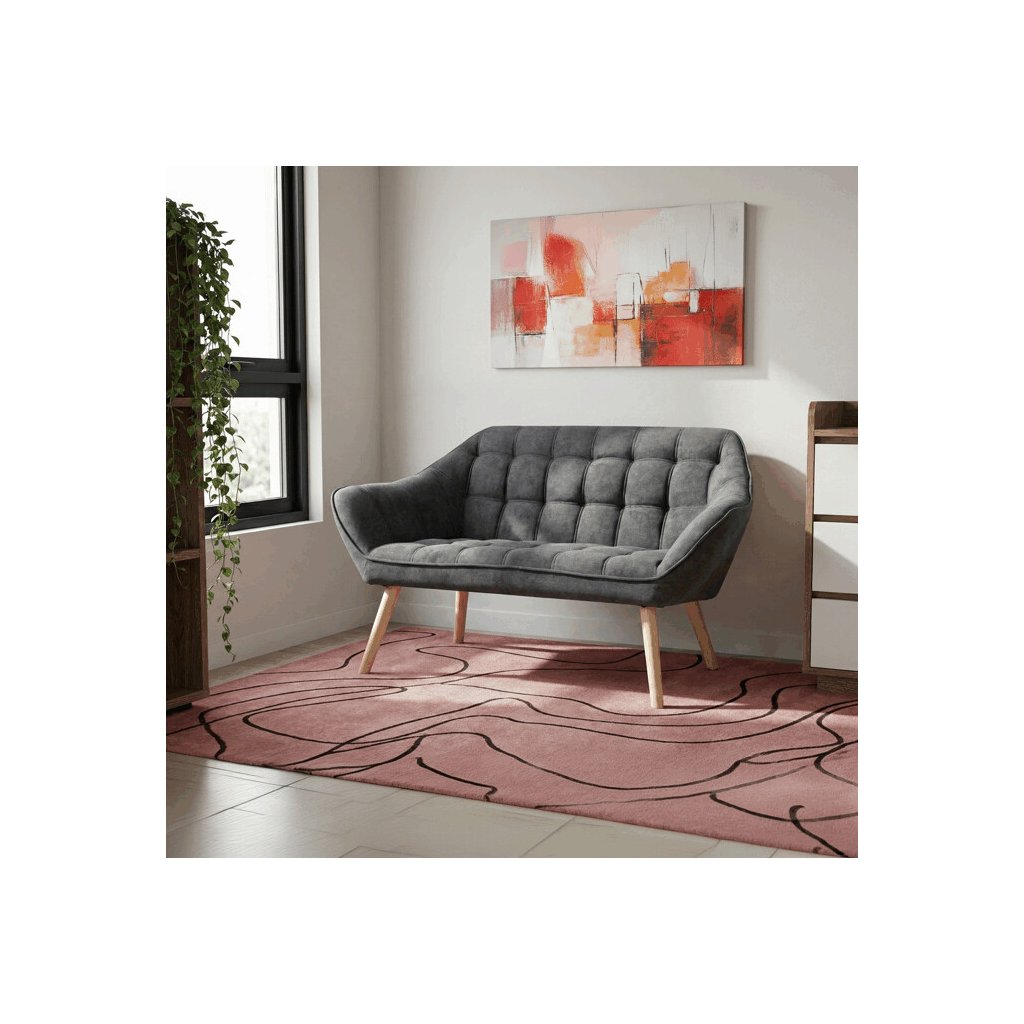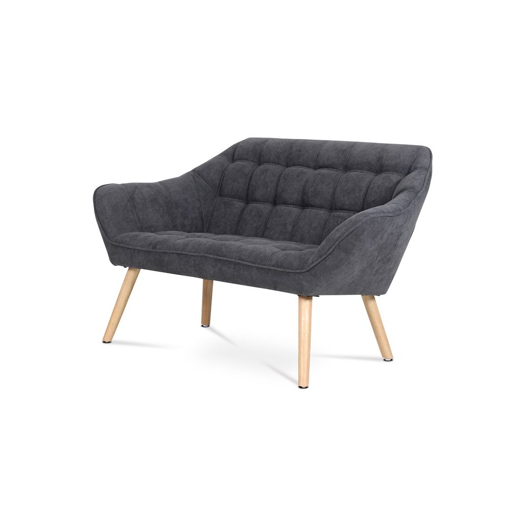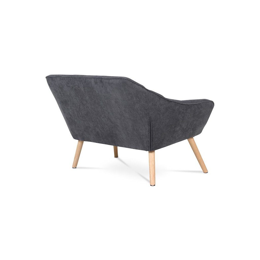 Dvousedačka, potah tmavě šedá látka, dřevěné nohy, masiv kaučukovník, přírodní odstín a lak