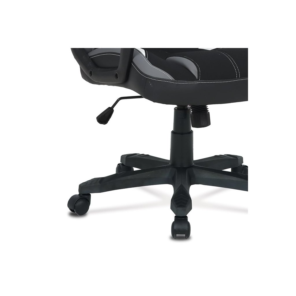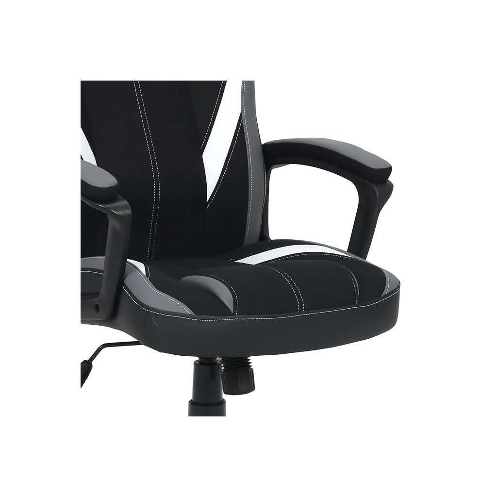 Herní křeslo HM s potahem kombinujícím šedou a černou látku s bílými prvky z ekokůže nabízí komfortní sezení díky vysokému polstrování sedáku a opěradla. Čalouněné pevné područky přispívají k pohodlí během dlouhých herních sezení, zatímco houpací mechanika umožňuje mírný pohyb a uvolnění. Plastový kříž zajišťuje stabilitu a lehkost celé židle. Design křesla je laděn do moderních barevných tónů, které se hodí do herních i pracovních prostor. Produkt neobsahuje bederní opěrku ani opěrku hlavy, což zachovává jednoduchost a čistotu tvaru.