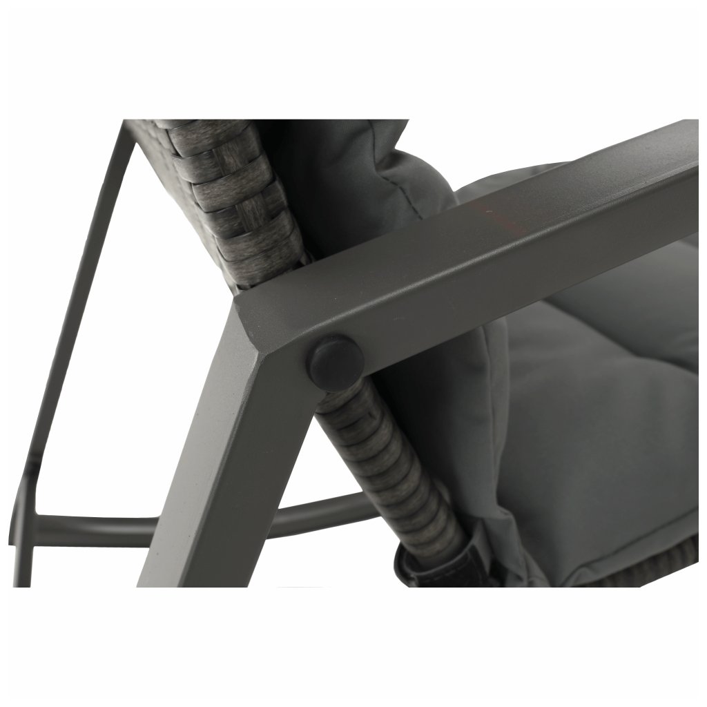 Elegantní zahradní křeslo s pevnou kovovou konstrukcí a látkovým výpletem v černé barvě. Ošetřeno práškovým lakem proti rzi. Křeslo je dodáváno včetně světlého podsedáku z pol...