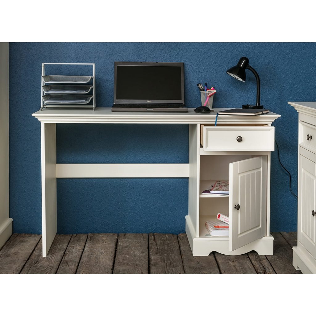 Psací stůl z borovice se skládá z jedné skříňky a zásuvek na vodících se systémem tichého dovírání . Eleganci dodávají detaily jako kliky v barvě starého stříbra, ale i zdobený vršek a sokl. Dřevěná deska stolu je obehnána hlubokým frézováním a sokl, na kterém stůl spočívá, je nejen dekorativním prvkem, ale také zajišťuje pevnost celé konstrukce. Bílý psací stůl pochází z nejoblíbenější z našich kolekcí - nábytkové sestavy Belluno Elegante, kde naleznete další barevné varianty psacích stolů: bílé psací stoly s dřevěnou deskou v barvě dub nebo ořech. S pomocí Belluno Elegante zařídíte fantastický obývací pokoj, halu a kancelář v provensálském stylu .