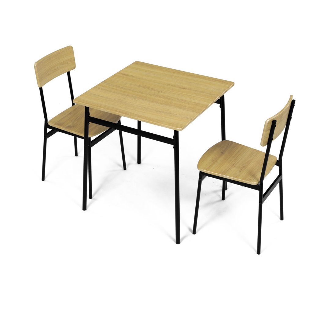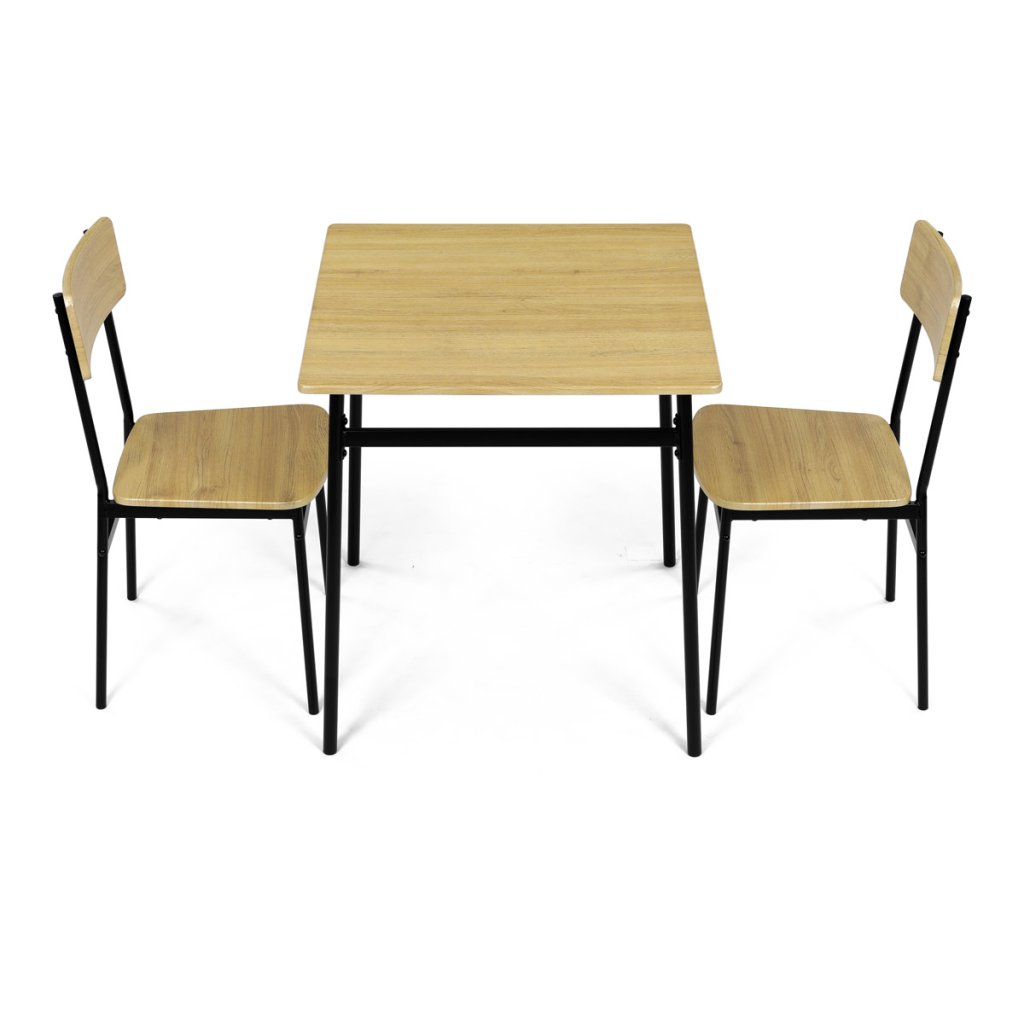 Tento jídelní set značky je ideální volbou pro menší prostory. Set obsahuje čtvercový stůl a dvě židle, které se svým industriálním designem dokonale hodí do moderních interiérů. Deska stolu i sedáky jsou vyrobeny z odolného MDF s dekorem divokého dubu. Černé kovové nohy dodávají sestavě stabilitu a moderní kontrast. Tento set je ideální pro dvě osoby a je vhodný zejména do menších jídelen nebo kuchyní. Montáž je snadná a rychlá, ideální řešení pro moderní bydlení.