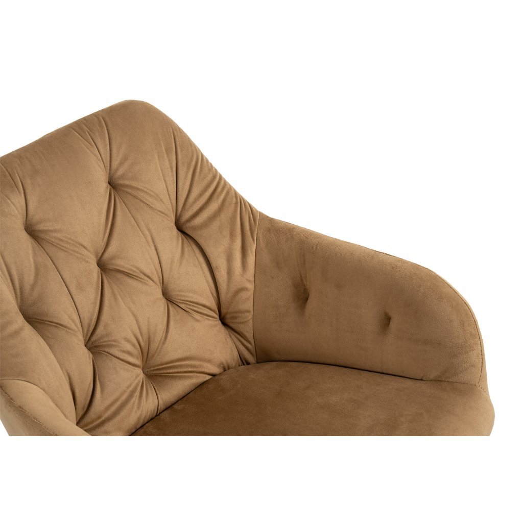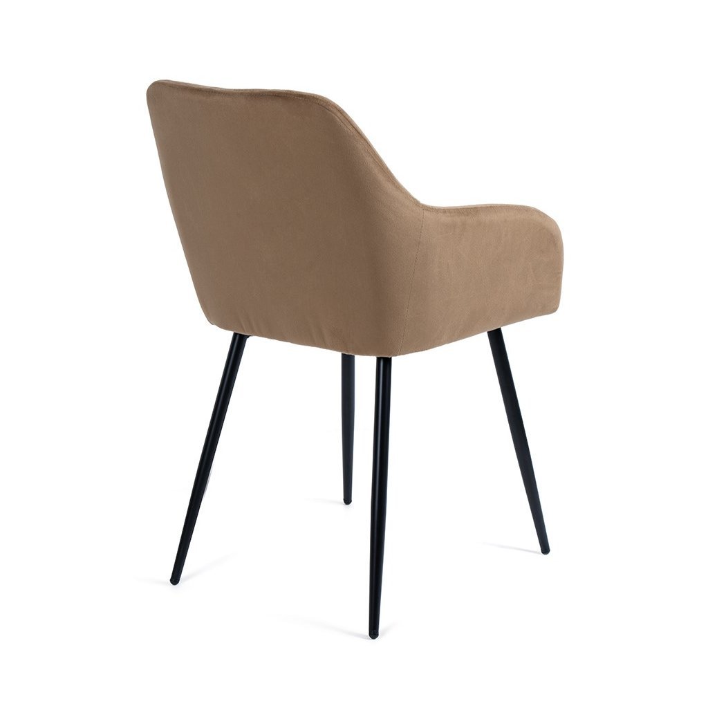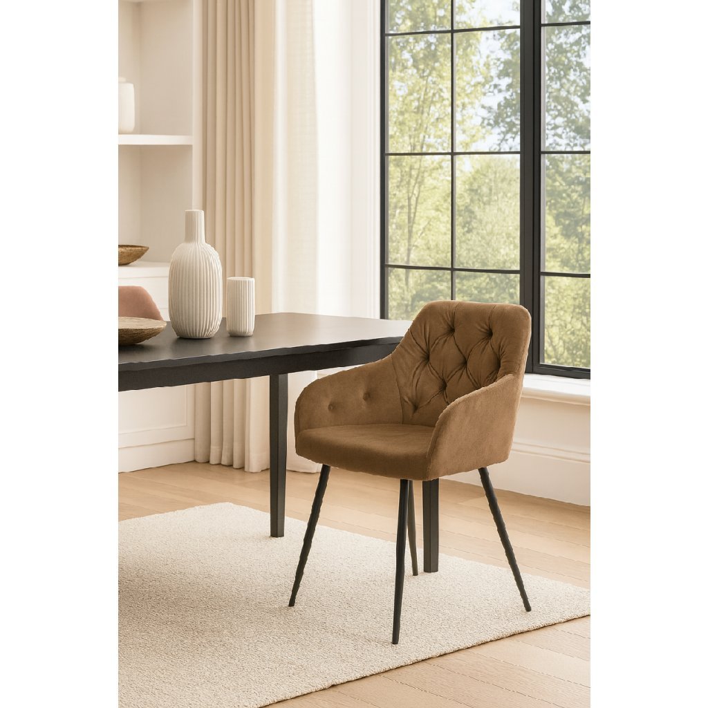 Elegantní židle s područkami a moderním designem. Pohodlné čalounění v béžovém sametu s dekorativním prošíváním. Stabilní kovové nohy v černém provedení. Skvěle doplní jídelnu, pracovnu či obývací pokoj. Spojuje komfort, styl a luxusní vzhled.