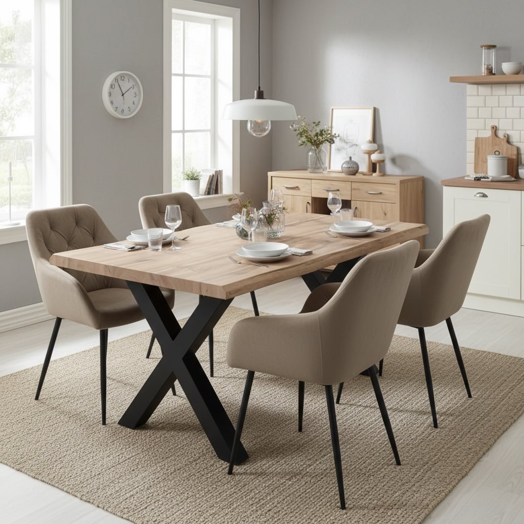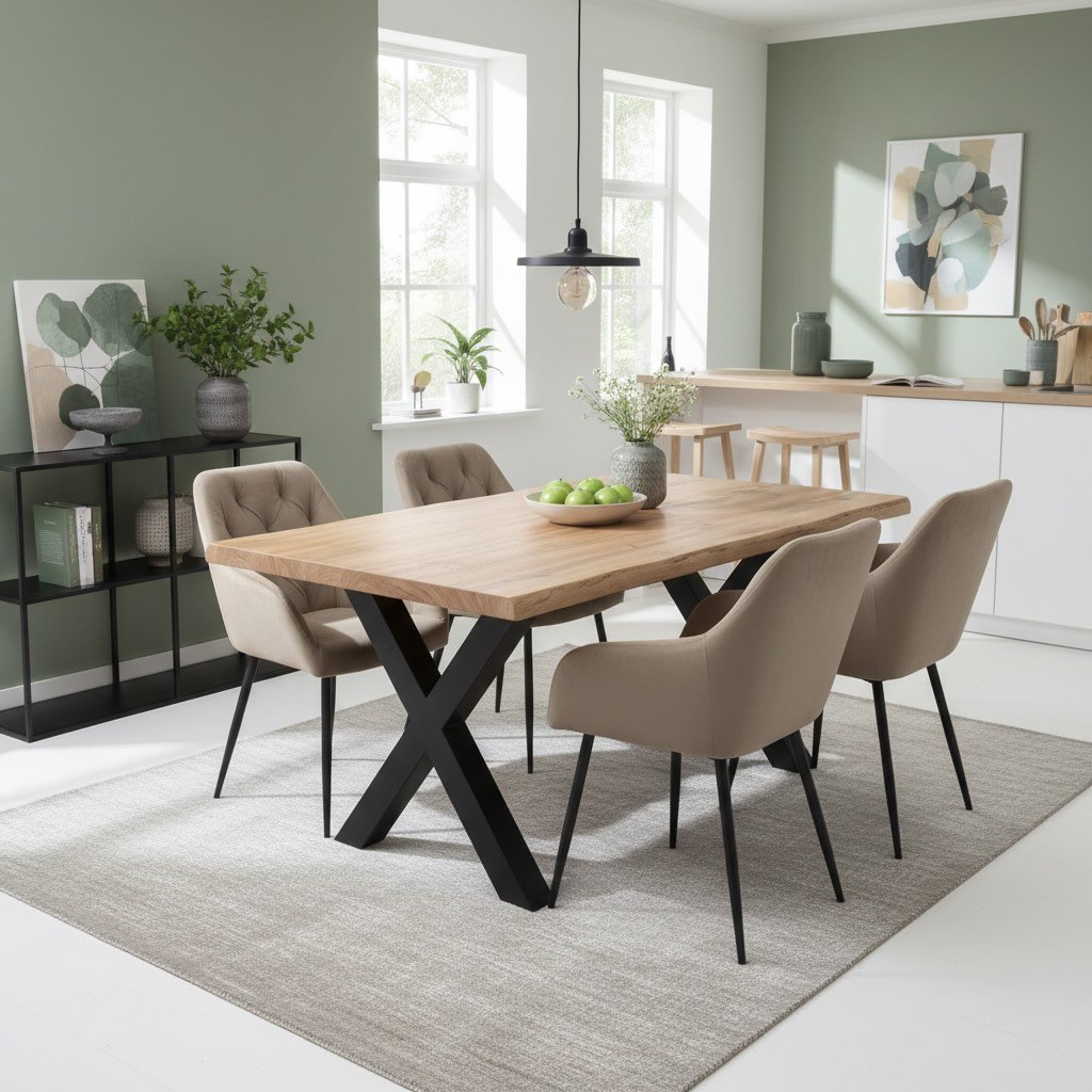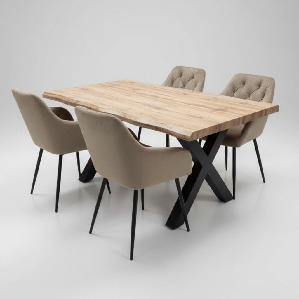 Jídelní stůl VJS100D-160 spojuje dekor dubu s kovovou konstrukcí do X v černém matu. Velkorysý rozměr 160×90×75,5 cm pohodlně pojme 6 osob a poskytuje dostatek prostoru pro každodenní stolování. Povrchová úprava z MDF desky imituje masivní dřevo a je snadno udržovatelná. Ideální volba do moderní jídelny, loftu nebo minimalistického interiéru. Podívejte se na naši nabídku jídelních stolů.