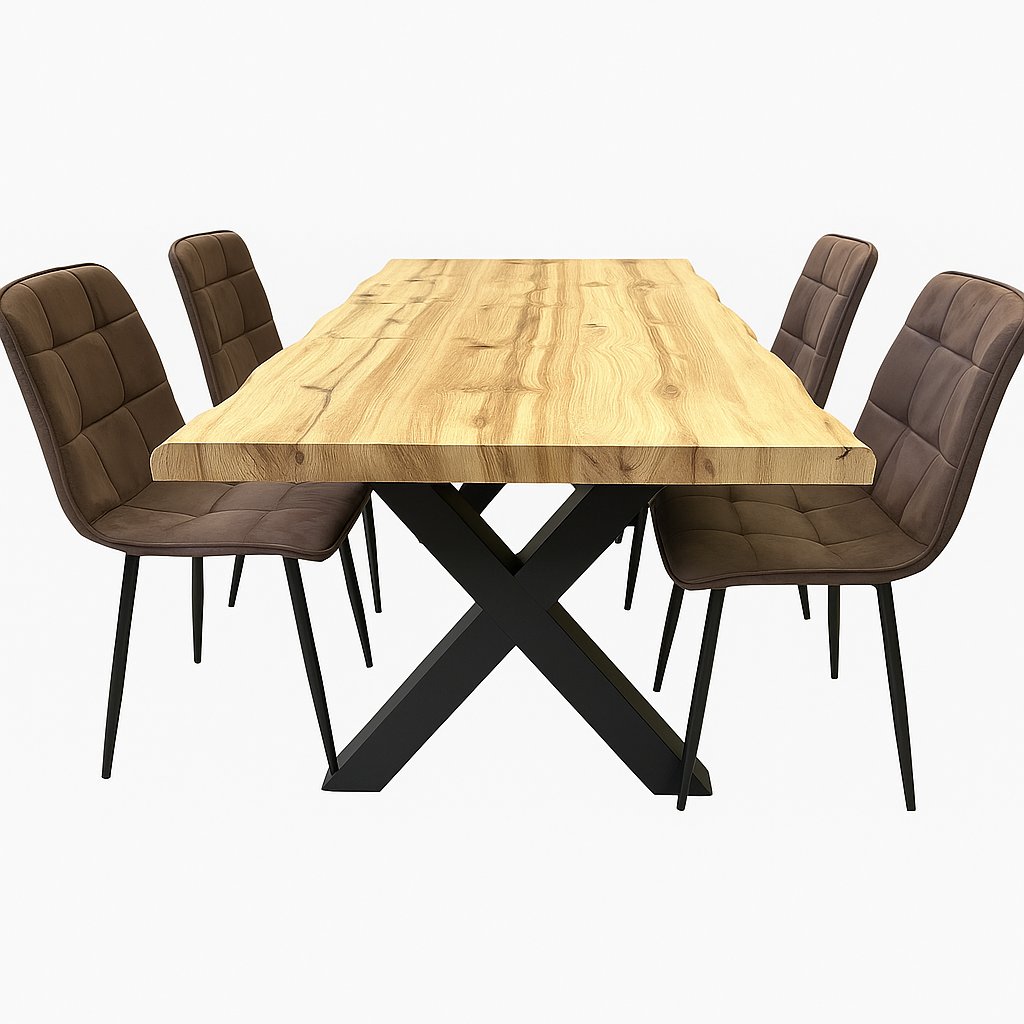 Jídelní set pro 4 osoby 1+4, stůl 160x90 cm, masivní MDF deska se speciální hranou, dekor dub, podnož ve tvaru X kov - černý lak, židle potah hnědá látka v dekoru broušené kůže s elegantním prošitím, nohy kov černé. Toto spojení tvoří pevný celek stolu a zajišťuje výbornou stabilitu. Nohy mají ve spodní části rektifikační kluzáky, kterými můžete vyrovnat případné nerovnosti podlahy a současně slouží jako účinná zábrana proti jejímu poškození. Nohy mají stolu mají čtvercový průřez. Povrchová úprava je kvalitním práškovým lakem v matné černé barvě. použité materiály jsou velmi odolné, výborně se udržují a čistí. Potah židle je zkvalitní odolné látky v elegantním hnědém odstínu imitující broušenou kůži. Zajímavým dekorativním prvkem je prošití látky. Sedák je tvarovaný pro maximální pohodlí. Polstrování je z kvalitní PU pěny. Nohy jsou kruhového průřezu mírně rozevřené. Svařená konstrukce přidává židli na atraktivitě i stabilitě. Na dotykových plochách s podlahou jsou opatřeny plastovými kluzáky zabraňující její poškození. Celá podnož v povrchové úpravě práškovým nástřikem v černé matné barvě. je částečně svařena. Toto vše působí nejen jako stylový designový prvek, ale dělá židli velmi pevnou, pohodlnou a praktickou na kratší i delší posezení. Nosnost židle je až 120 kg.