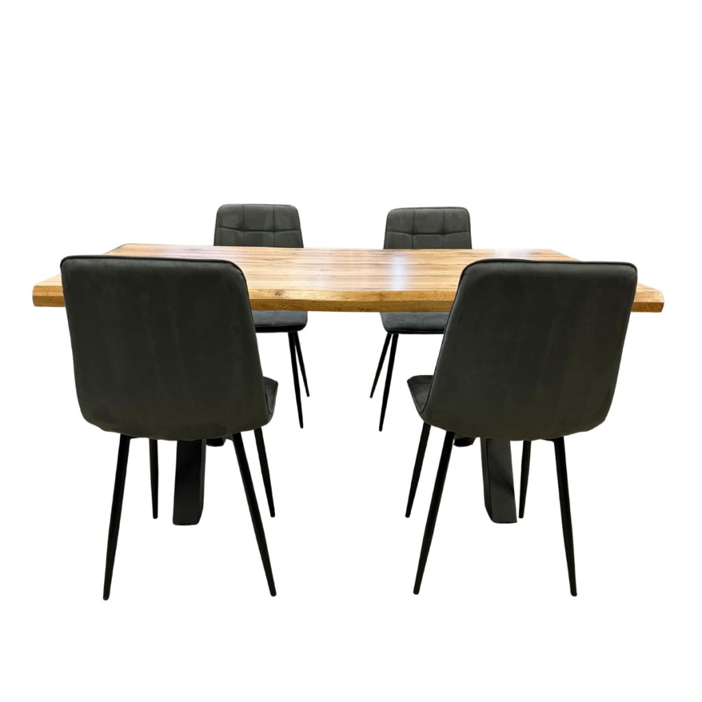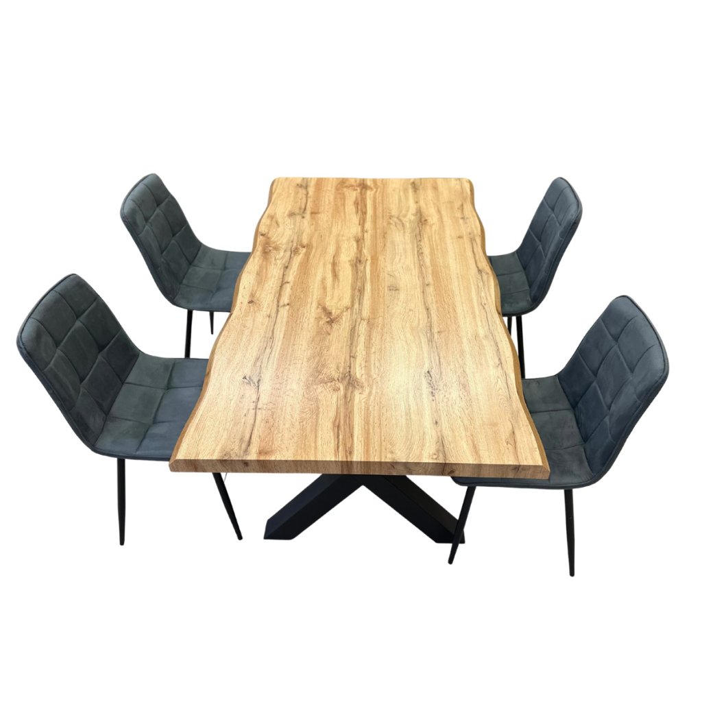 Jídelní set pro 4 osoby 1+4, stůl 160x90 cm, masivní MDF deska se speciální hranou, dekor dub, podnož ve tvaru X kov - černý lak, židle potah šedá látka v dekoru broušené kůže s elegantním prošitím, nohy kov černé. Toto spojení tvoří pevný celek stolu a zajišťuje výbornou stabilitu. Nohy mají ve spodní části rektifikační kluzáky, kterými můžete vyrovnat případné nerovnosti podlahy a současně slouží jako účinná zábrana proti jejímu poškození. Nohy mají stolu mají čtvercový průřez. Povrchová úprava je kvalitním práškovým lakem v matné černé barvě. použité materiály jsou velmi odolné, výborně se udržují a čistí. Potah židle je zkvalitní odolné látky v elegantním šedém odstínu imitující broušenou kůži. Zajímavým dekorativním prvkem je prošití látky. Sedák je tvarovaný pro maximální pohodlí. Polstrování je z kvalitní PU pěny. Nohy jsou kruhového průřezu mírně rozevřené. Svařená konstrukce přidává židli na atraktivitě i stabilitě. Na dotykových plochách s podlahou jsou opatřeny plastovými kluzáky zabraňující její poškození. Celá podnož v povrchové úpravě práškovým nástřikem v černé matné barvě. je částečně svařena. Toto vše působí nejen jako stylový designový prvek, ale dělá židli velmi pevnou, pohodlnou a praktickou na kratší i delší posezení. Nosnost židle je až 120 kg.