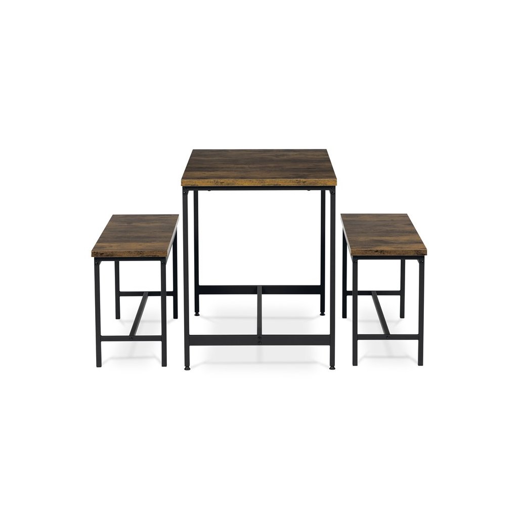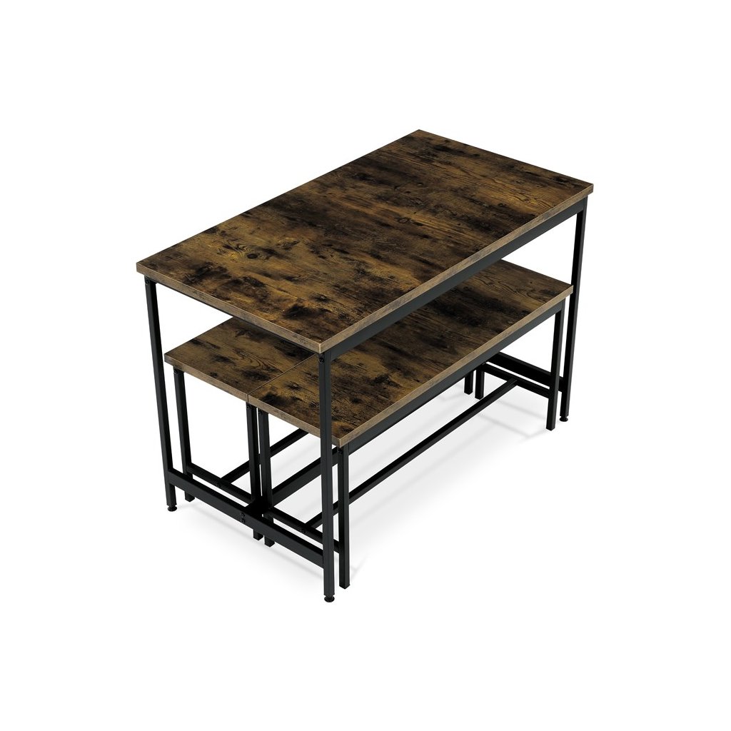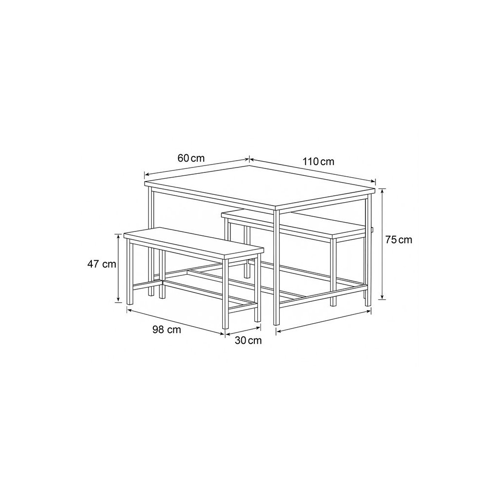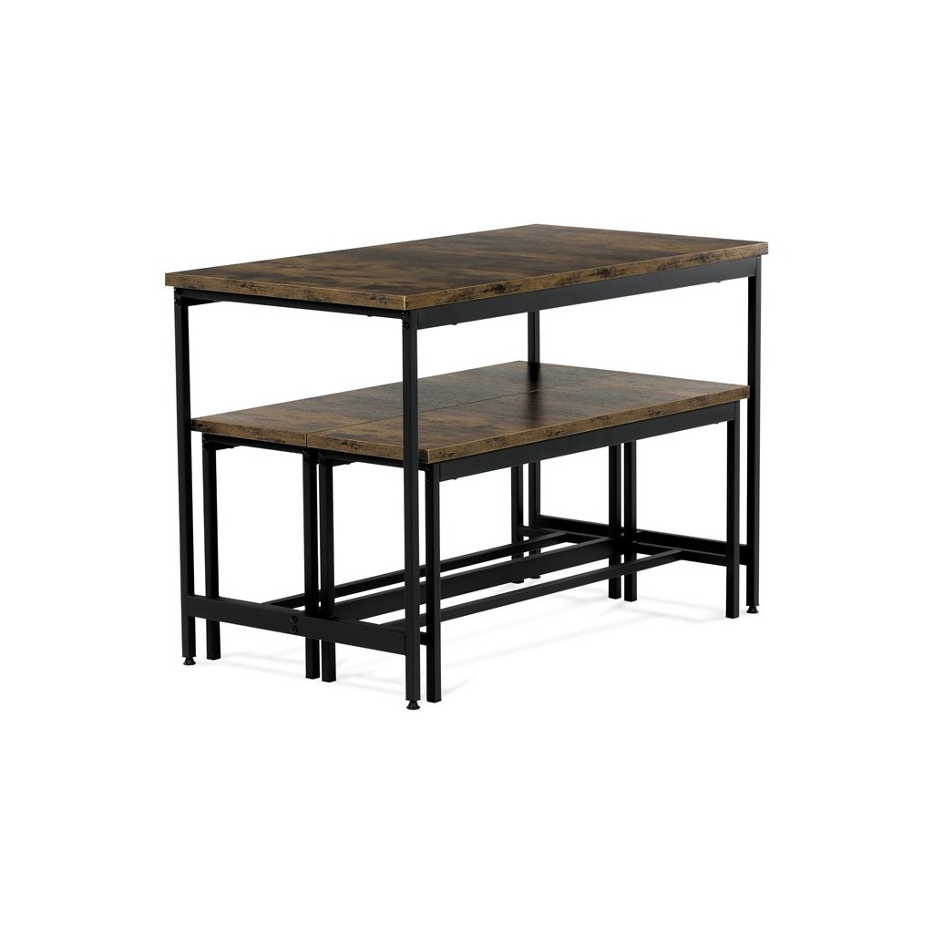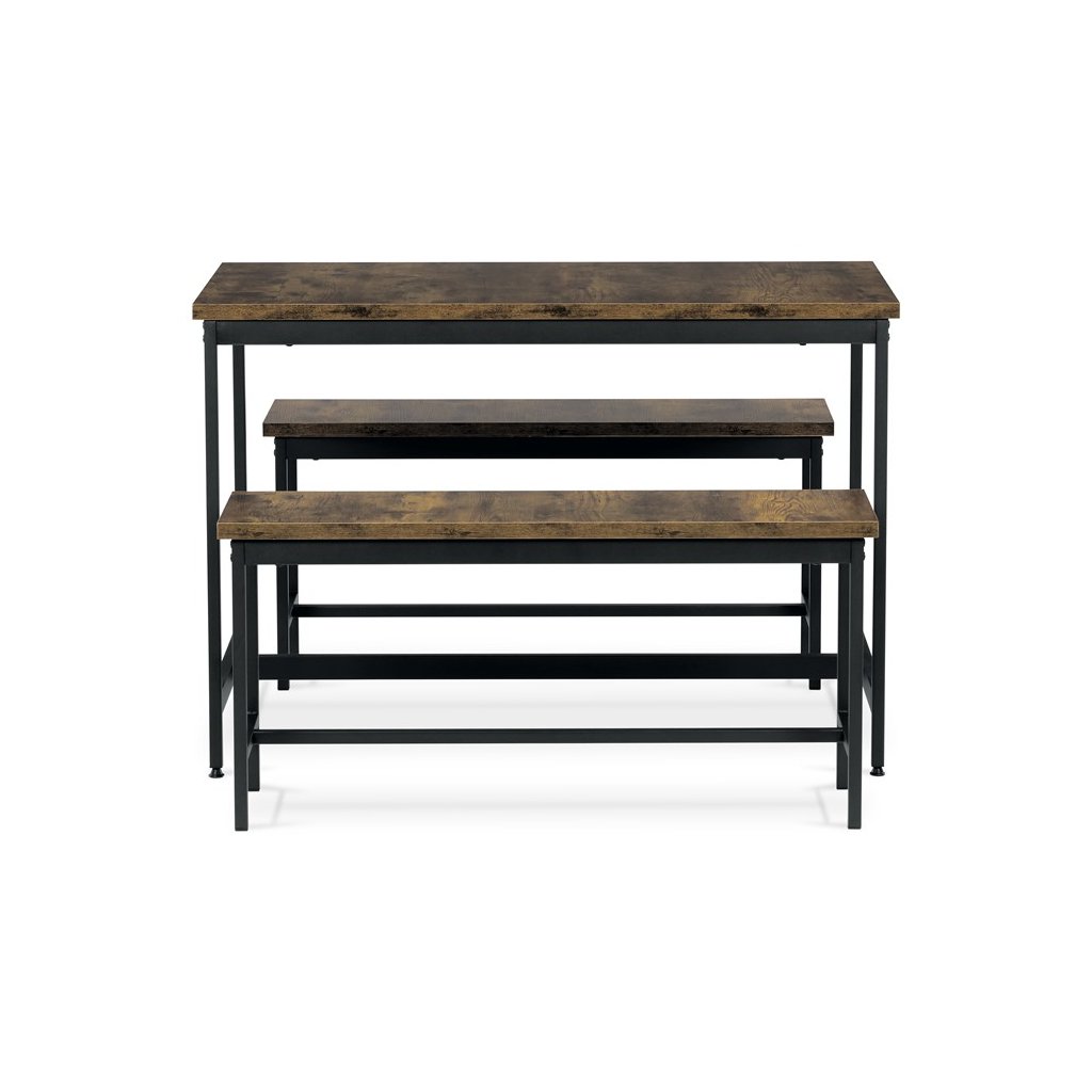 Jídelní set značky v industriálním stylu je praktickým a stylovým řešením pro vaši jídelnu či kuchyň. Sestava obsahuje obdélníkový stůl a dvě lavice, které lze snadno zasunout pod stůl a ušetřit tak místo. Desky v dekoru starého dřeva dodávají příjemnou přírodní atmosféru, zatímco černé kovové nohy zajišťují stabilitu a moderní kontrast.