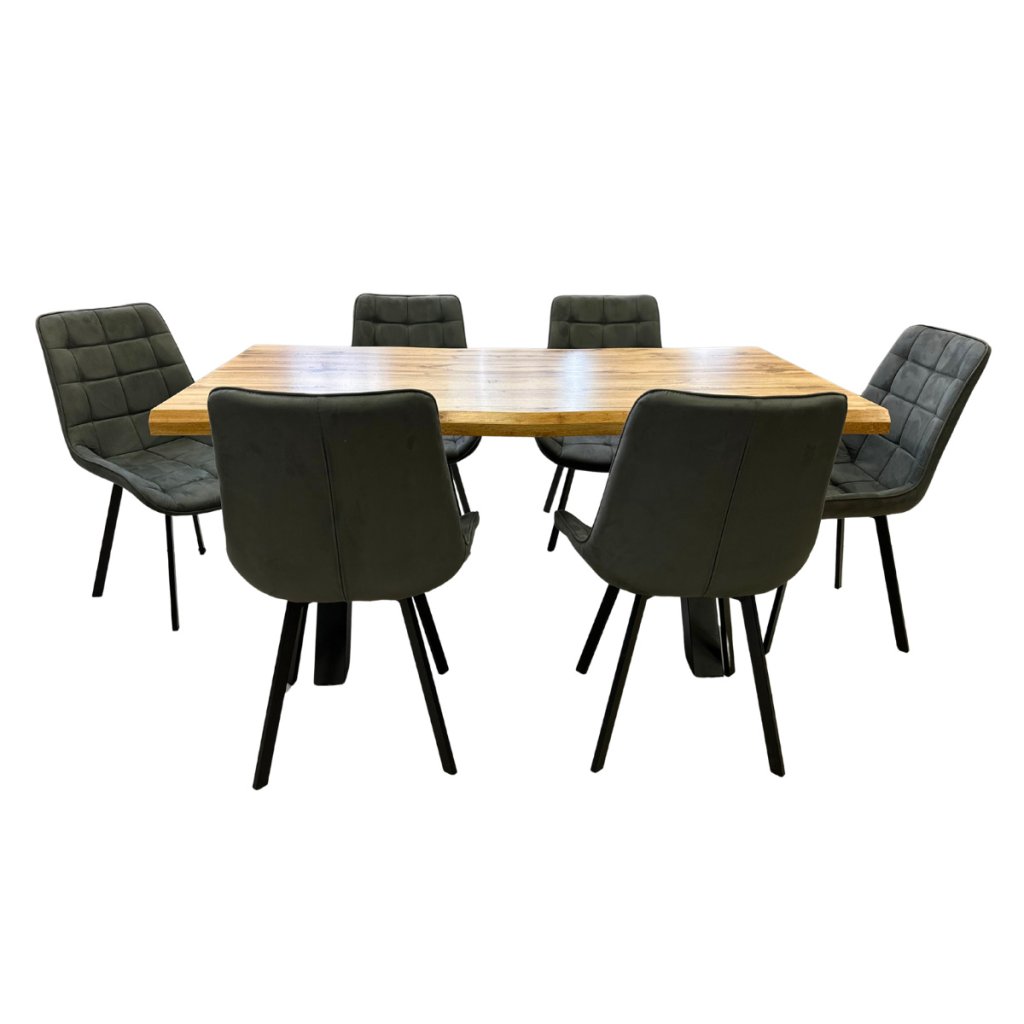 Jídelní set pro 6 osob VJS116-61S-S propojuje přírodní dekor dubu s výrazem moderní elegance. Dominantní stůl o rozměru 160 × 90 cm doplňuje šest pohodlných židlí AJZ130S-S v šedém provedení se sametovým látkovým potahem. Výsledkem je stylový a přitom praktický celek, který se přirozeně začlení mezi jídelní sety a dodá interiéru osobitý charakter.