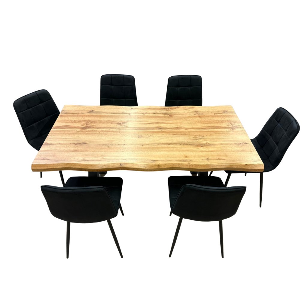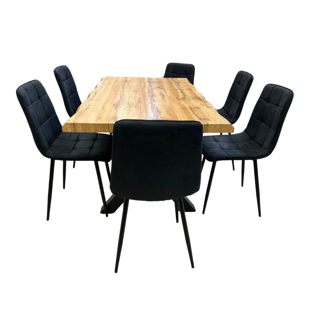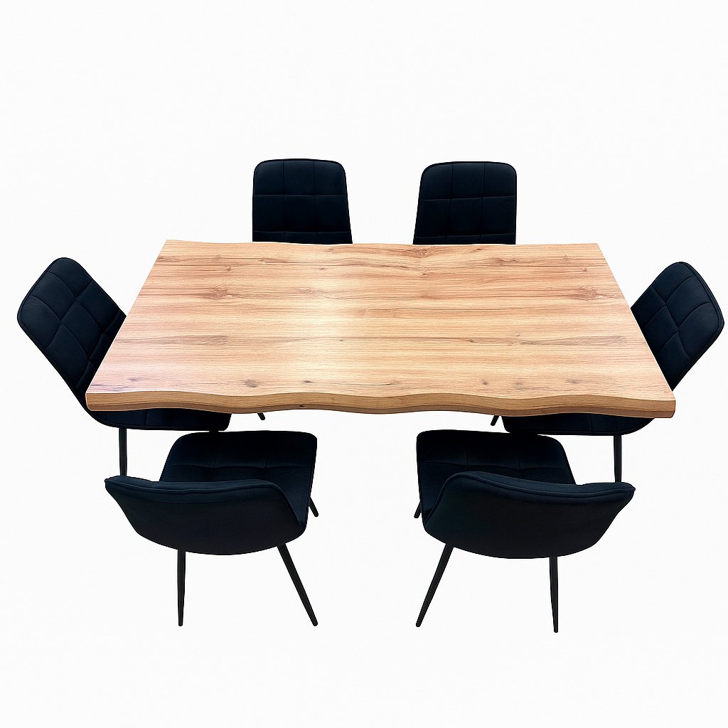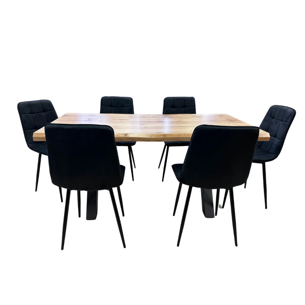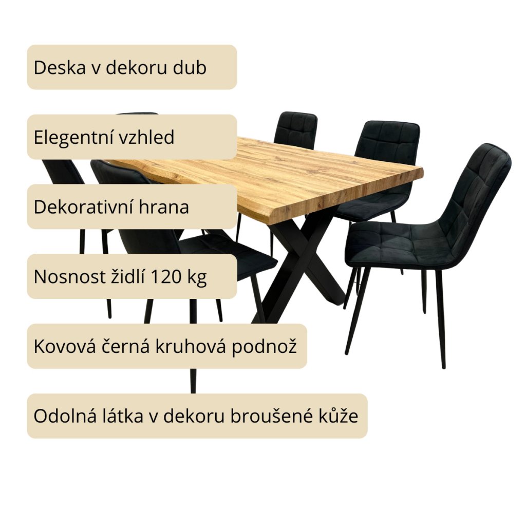 Jídelní set pro 6 osob 1+6, stůl 160x90 cm, masivní MDF deska se speciální hranou, dekor dub, podnož ve tvaru X kov - černý lak, židle potah černá látka v dekoru broušené kůže s elegantním prošitím, nohy kov černé. Toto spojení tvoří pevný celek stolu a zajišťuje výbornou stabilitu. Nohy mají ve spodní části rektifikační kluzáky, kterými můžete vyrovnat případné nerovnosti podlahy a současně slouží jako účinná zábrana proti jejímu poškození. Nohy mají stolu mají čtvercový průřez. Povrchová úprava je kvalitním práškovým lakem v matné černé barvě. použité materiály jsou velmi odolné, výborně se udržují a čistí. Potah židle je zkvalitní odolné látky v elegantním černém odstínu imitující broušenou kůži. Zajímavým dekorativním prvkem je prošití látky. Sedák je tvarovaný pro maximální pohodlí. Polstrování je z kvalitní PU pěny. Nohy jsou kruhového průřezu mírně rozevřené. Svařená konstrukce přidává židli na atraktivitě i stabilitě. Na dotykových plochách s podlahou jsou opatřeny plastovými kluzáky zabraňující její poškození. Celá podnož v povrchové úpravě práškovým nástřikem v černé matné barvě. je částečně svařena. Toto vše působí nejen jako stylový designový prvek, ale dělá židli velmi pevnou, pohodlnou a praktickou na kratší i delší posezení. Nosnost židle je až 120 kg.