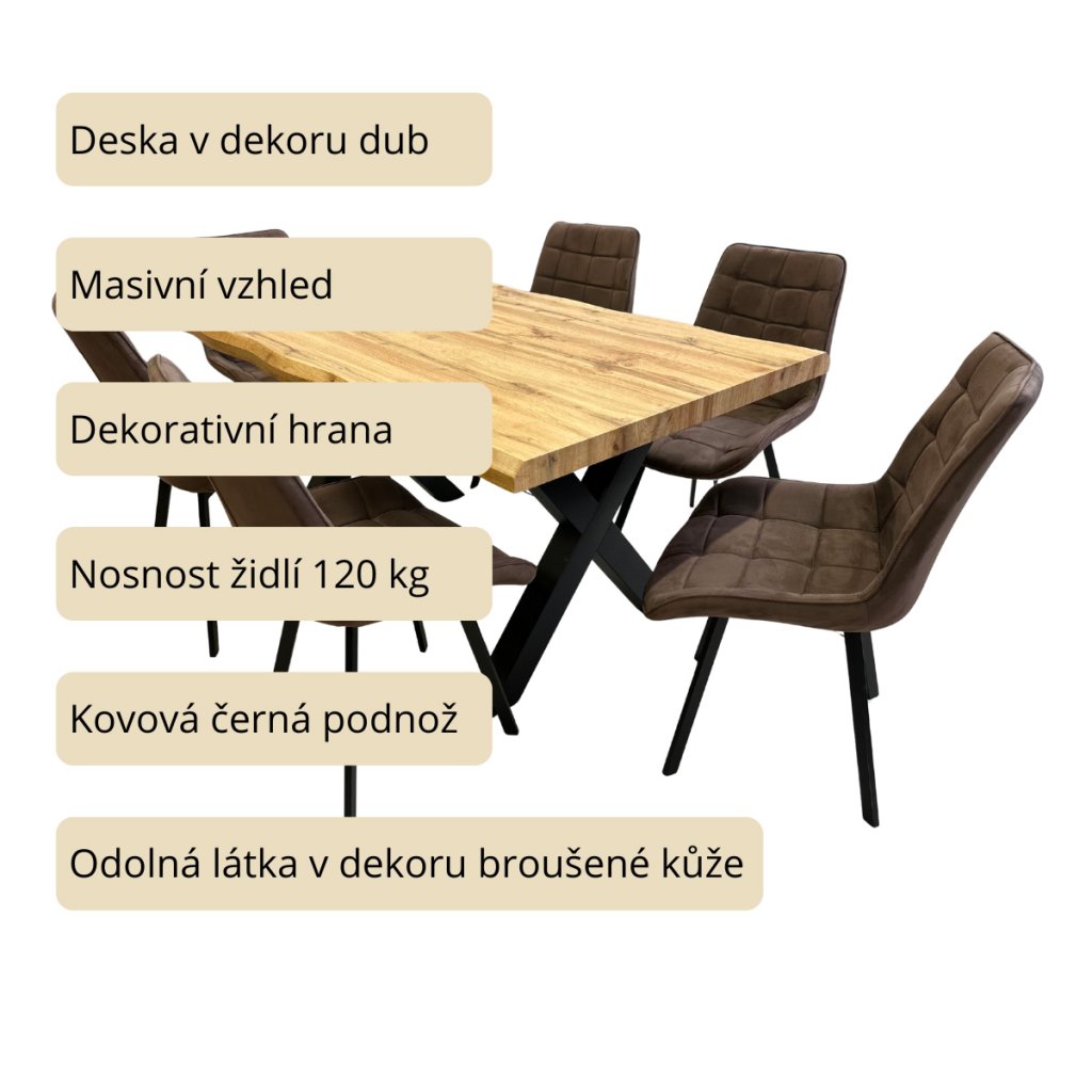 Jídelní set pro 6 osob 1+6, stůl 160x90 cm, masivní MDF deska se speciální hranou, dekor dub, podnož ve tvaru X kov - černý lak, židle potah hnědá látka v dekoru broušené kůže s elegantním prošitím a masivním ergonomicky tvarovaným sedákem, nohy kov černé. Toto spojení tvoří pevný celek stolu a zajišťuje výbornou stabilitu. Nohy mají ve spodní části rektifikační kluzáky, kterými můžete vyrovnat případné nerovnosti podlahy a současně slouží jako účinná zábrana proti jejímu poškození. Nohy mají stolu mají čtvercový průřez. Povrchová úprava je kvalitním práškovým lakem v matné černé barvě. použité materiály jsou velmi odolné, výborně se udržují a čistí. Potah židle je zkvalitní odolné látky v elegantním hnědém odstínu imitující broušenou kůži. Zajímavým dekorativním prvkem je prošití látky. Sedák je mohutný a ergonomicky tvarovaný pro maximální pohodlí. Polstrování je z kvalitní PU pěny. Nohy jsou obdelníkového průřezu mírně rozevřené. To vše přidává židli na atraktivitě i stabilitě. Na dotykových plochách s podlahou jsou opatřeny plastovými kluzáky zabraňující její poškození. Celá podnož v povrchové úpravě práškovým nástřikem v černé matné barvě. je částečně svařena. Toto vše působí nejen jako stylový designový prvek, ale dělá židli velmi pevnou, pohodlnou a praktickou na kratší i delší posezení. Nosnost židle je až 120 kg.