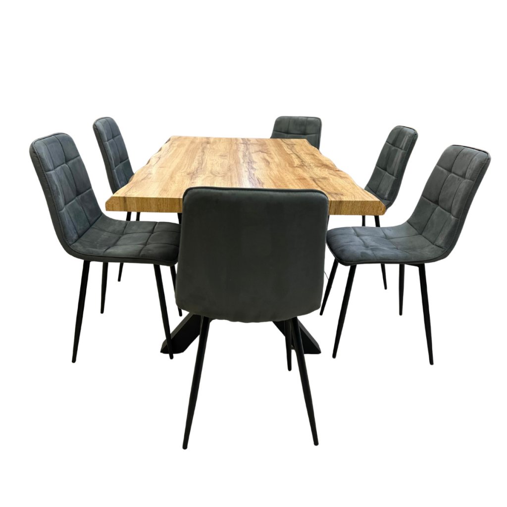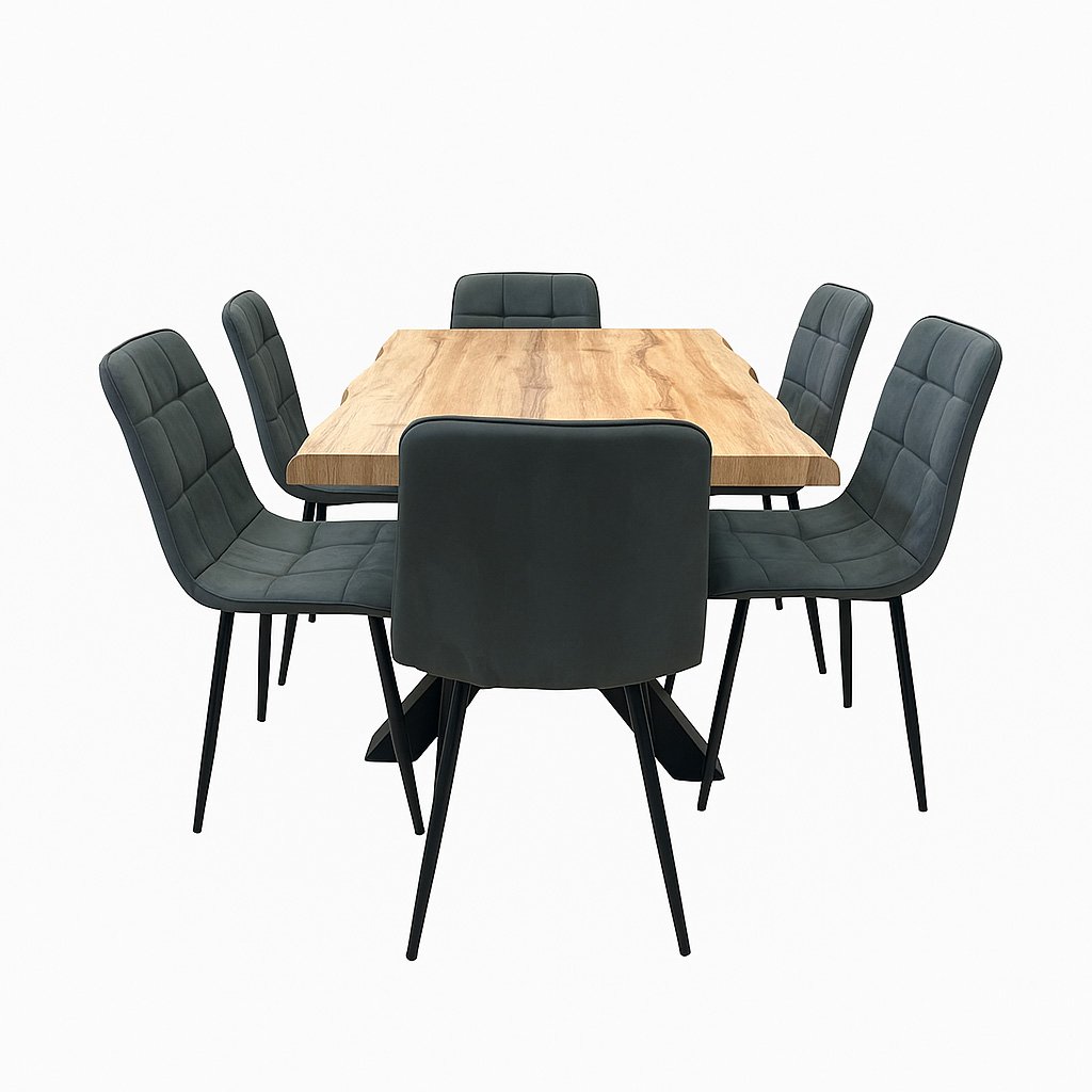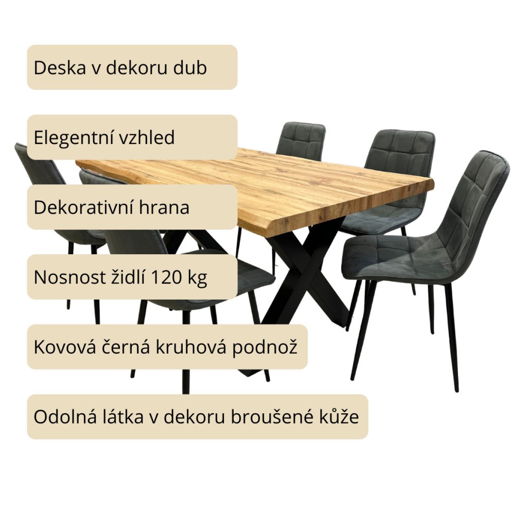 Jídelní set pro 6 osob 1+6, stůl 160x90 cm, masivní MDF deska se speciální hranou, dekor dub, podnož ve tvaru X kov - černý lak, židle potah šedá látka v dekoru broušené kůže s elegantním prošitím, nohy kov černé. Toto spojení tvoří pevný celek stolu a zajišťuje výbornou stabilitu. Nohy mají ve spodní části rektifikační kluzáky, kterými můžete vyrovnat případné nerovnosti podlahy a současně slouží jako účinná zábrana proti jejímu poškození. Nohy mají stolu mají čtvercový průřez. Povrchová úprava je kvalitním práškovým lakem v matné černé barvě. použité materiály jsou velmi odolné, výborně se udržují a čistí. Potah židle je zkvalitní odolné látky v elegantním šedém odstínu imitující broušenou kůži. Zajímavým dekorativním prvkem je prošití látky. Sedák je tvarovaný pro maximální pohodlí. Polstrování je z kvalitní PU pěny. Nohy jsou kruhového průřezu mírně rozevřené. Svařená konstrukce přidává židli na atraktivitě i stabilitě. Na dotykových plochách s podlahou jsou opatřeny plastovými kluzáky zabraňující její poškození. Celá podnož v povrchové úpravě práškovým nástřikem v černé matné barvě. je částečně svařena. Toto vše působí nejen jako stylový designový prvek, ale dělá židli velmi pevnou, pohodlnou a praktickou na kratší i delší posezení. Nosnost židle je až 120 kg.