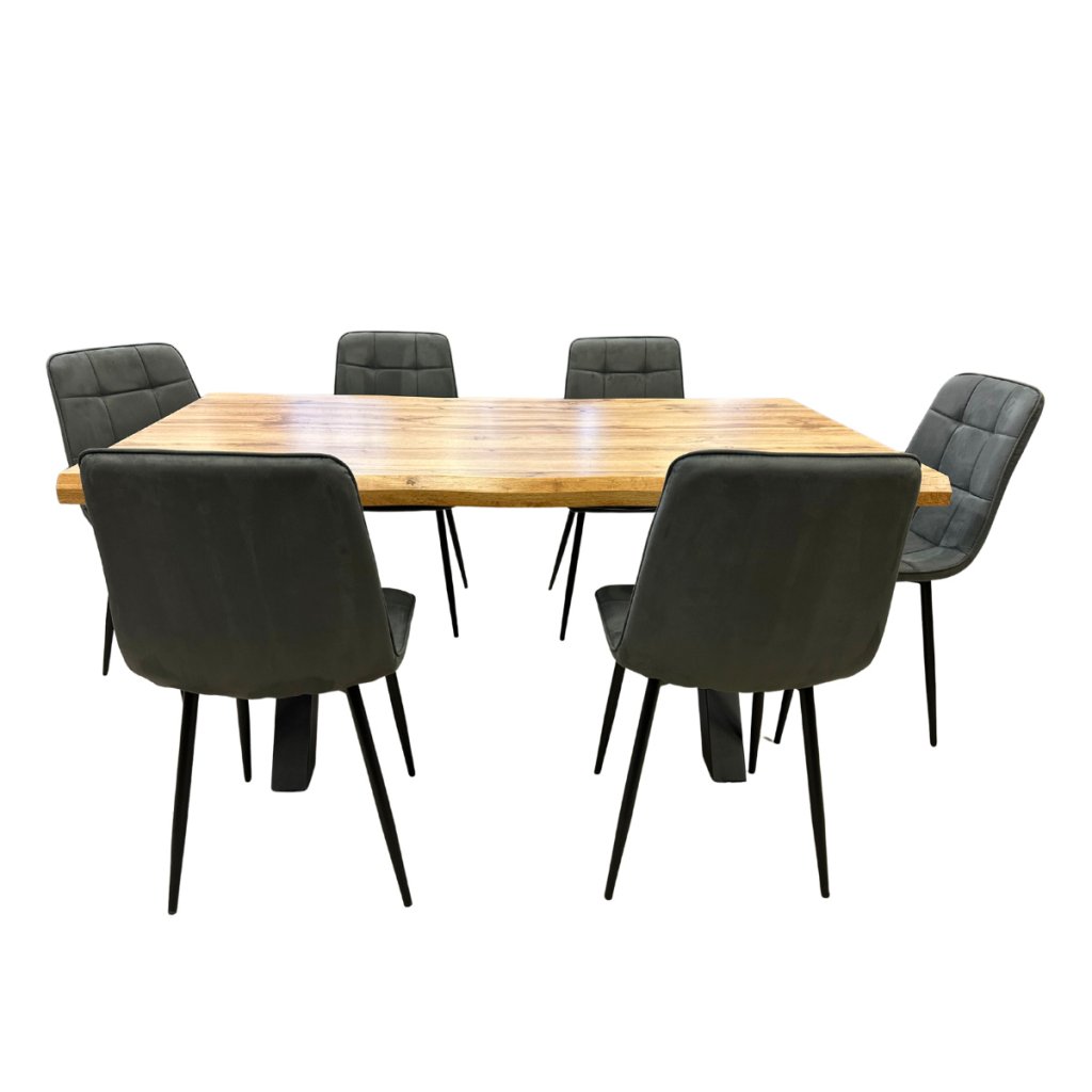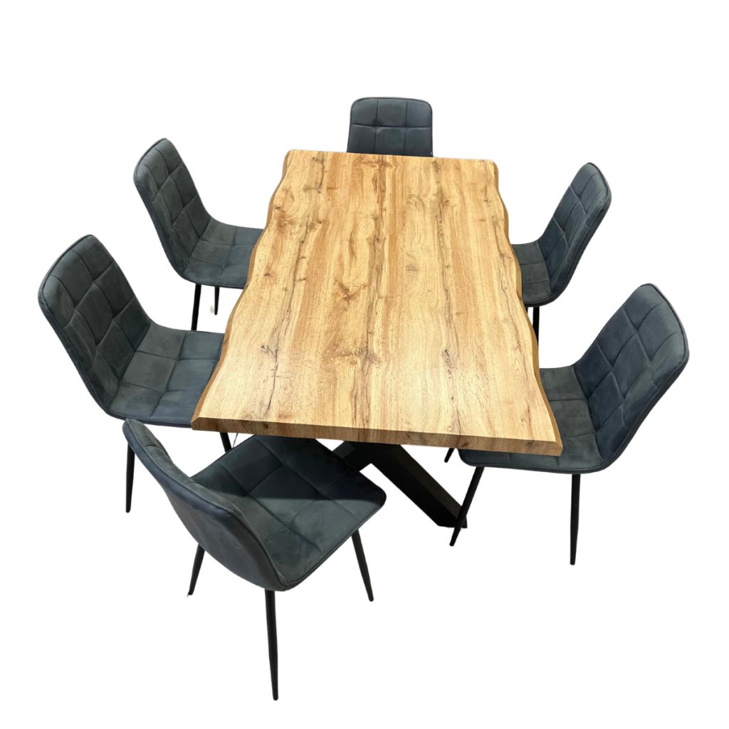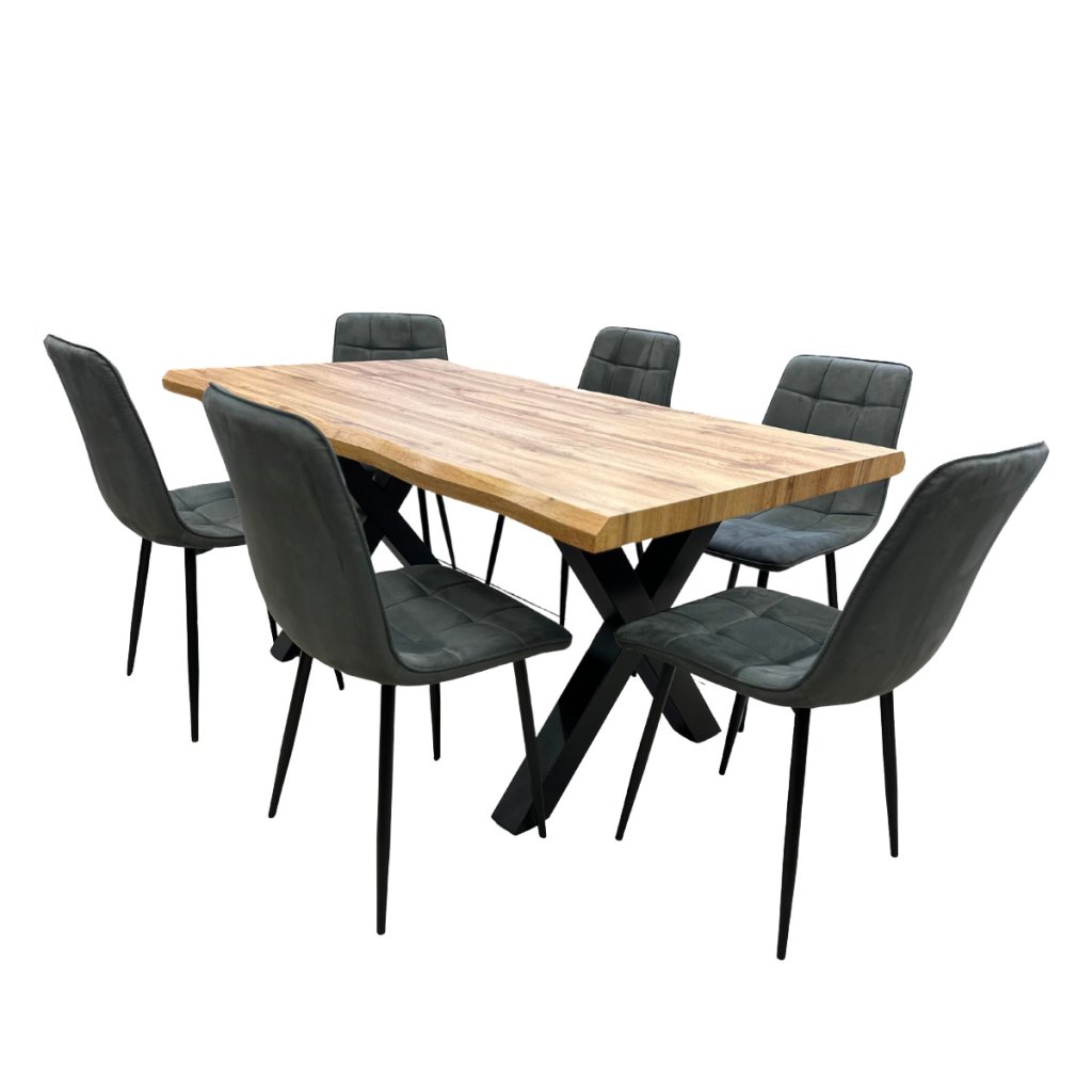 Jídelní set pro 6 osob 1+6, stůl 160x90 cm, masivní MDF deska se speciální hranou, dekor dub, podnož ve tvaru X kov - černý lak, židle potah šedá látka v dekoru broušené kůže s elegantním prošitím, nohy kov černé. Toto spojení tvoří pevný celek stolu a zajišťuje výbornou stabilitu. Nohy mají ve spodní části rektifikační kluzáky, kterými můžete vyrovnat případné nerovnosti podlahy a současně slouží jako účinná zábrana proti jejímu poškození. Nohy mají stolu mají čtvercový průřez. Povrchová úprava je kvalitním práškovým lakem v matné černé barvě. použité materiály jsou velmi odolné, výborně se udržují a čistí. Potah židle je zkvalitní odolné látky v elegantním šedém odstínu imitující broušenou kůži. Zajímavým dekorativním prvkem je prošití látky. Sedák je tvarovaný pro maximální pohodlí. Polstrování je z kvalitní PU pěny. Nohy jsou kruhového průřezu mírně rozevřené. Svařená konstrukce přidává židli na atraktivitě i stabilitě. Na dotykových plochách s podlahou jsou opatřeny plastovými kluzáky zabraňující její poškození. Celá podnož v povrchové úpravě práškovým nástřikem v černé matné barvě. je částečně svařena. Toto vše působí nejen jako stylový designový prvek, ale dělá židli velmi pevnou, pohodlnou a praktickou na kratší i delší posezení. Nosnost židle je až 120 kg.