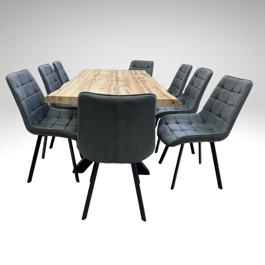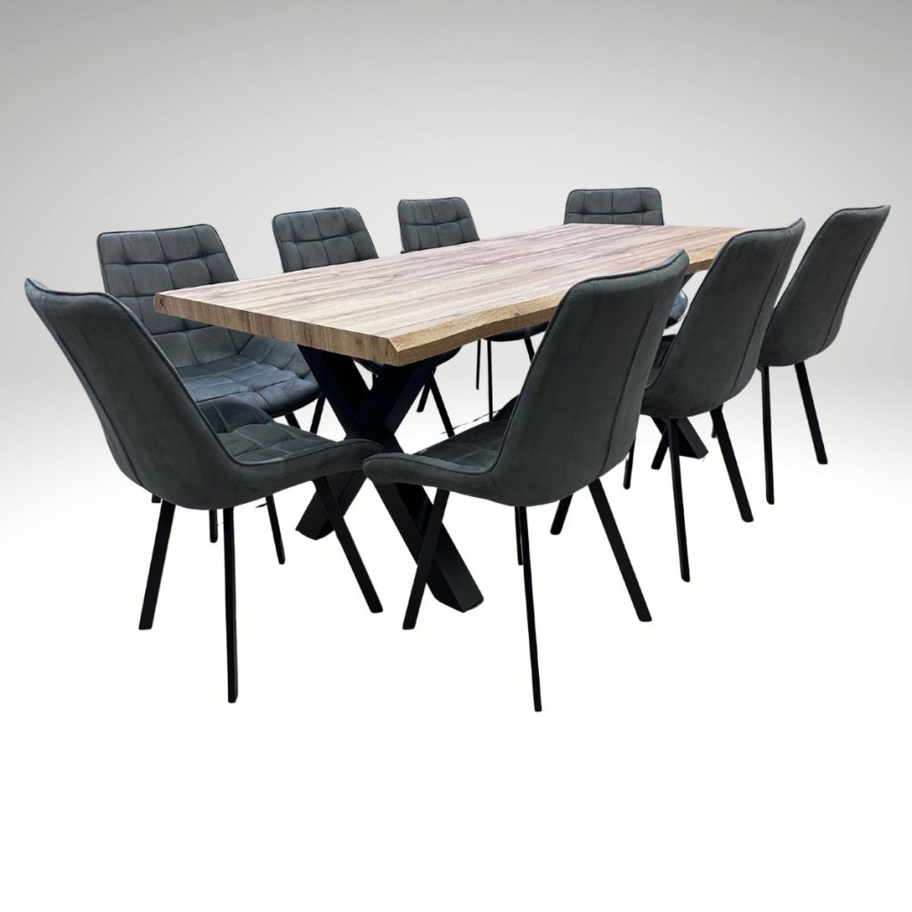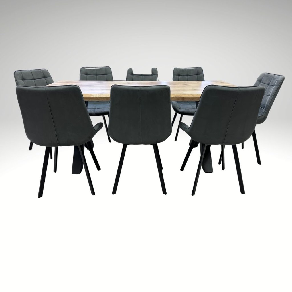 Jídelní set pro 8 osob VJS118-81S propojuje přírodní dekor dubu s výrazem moderní elegance. Dominantní stůl o rozměru 180 × 90 cm doplňuje osm pohodlných židlí AJZ130C v černém provedení s látkovým potahem v dekoru broušené kůže. Výsledkem je stylový a přitom praktický celek, který se přirozeně začlení mezi jídelní sety a dodá interiéru osobitý charakter.