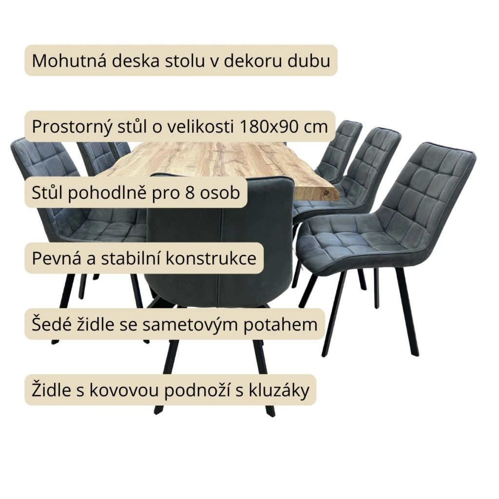Jídelní set pro 8 osob 180x90 cm dub, šedá samet VJS118-81S-S ZA AKČNÍ CENU