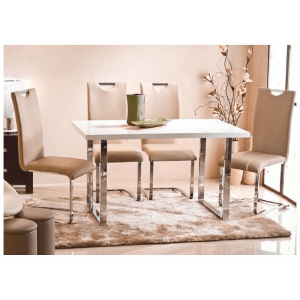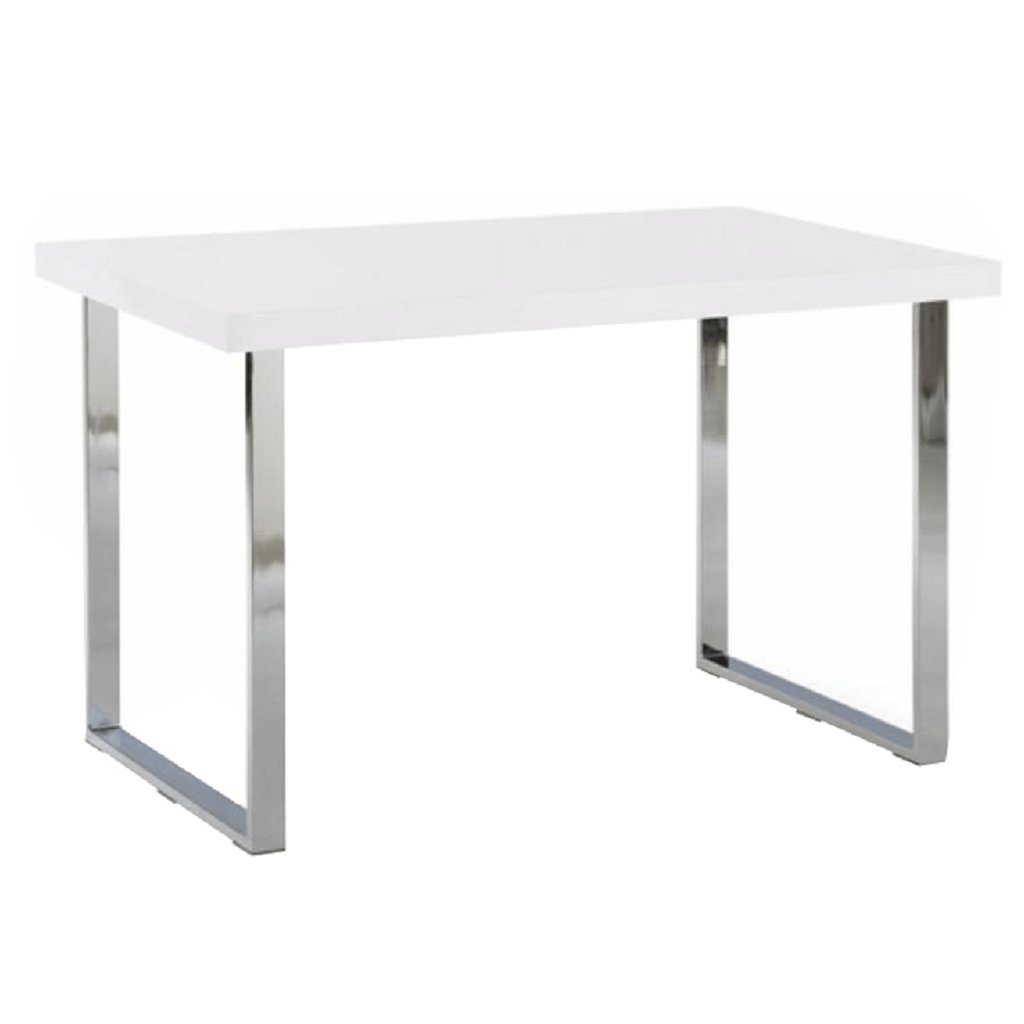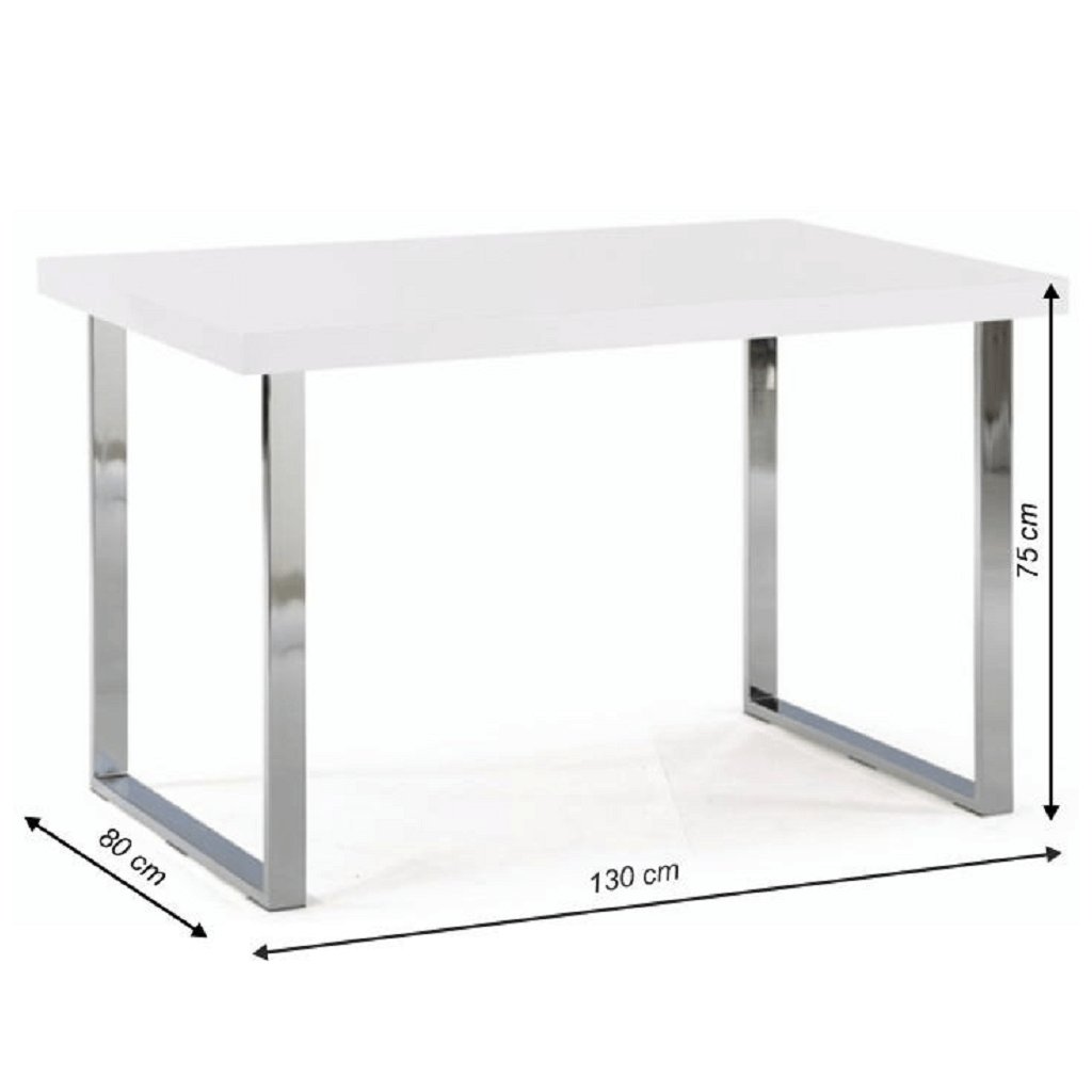 Jídelní stůl v bílé barvě s vysokým leskem a spojenou chromovou podstavou TK236