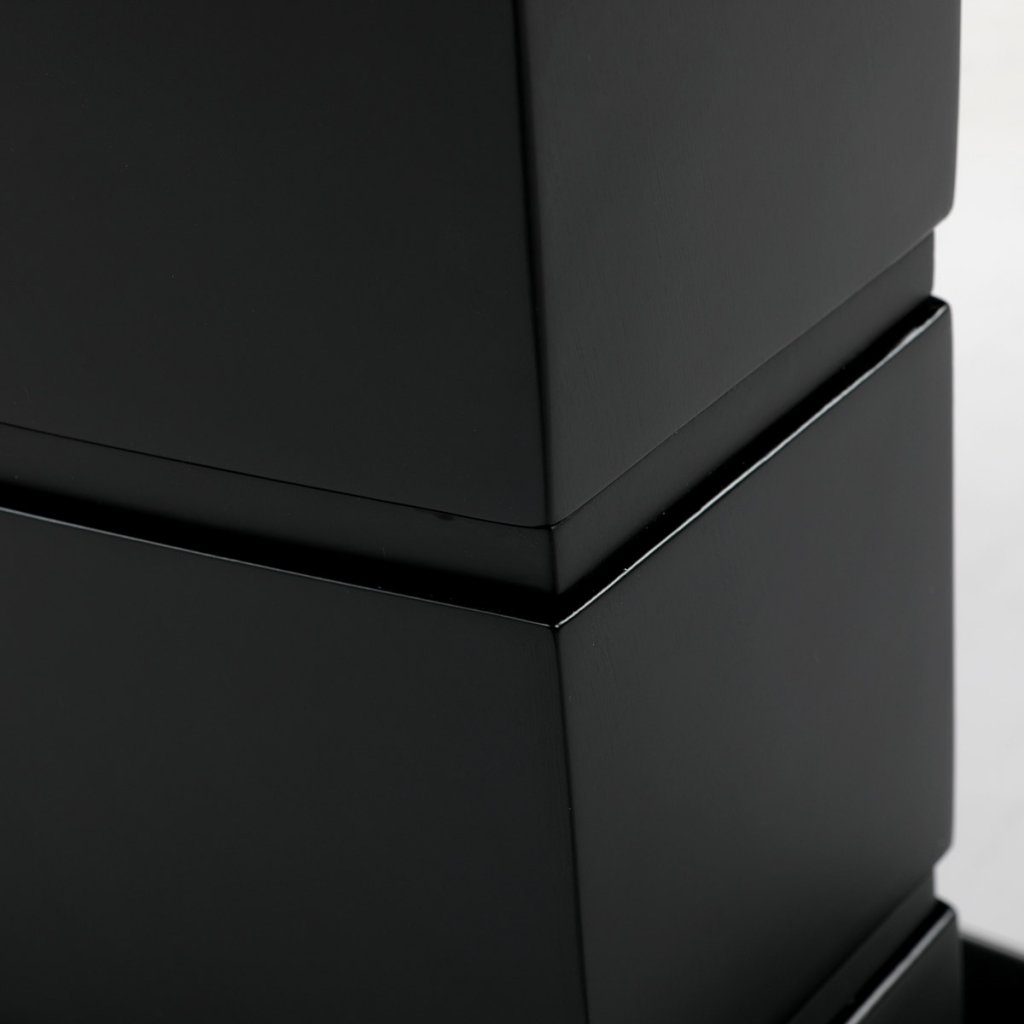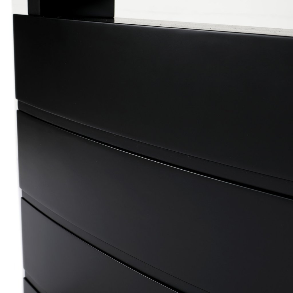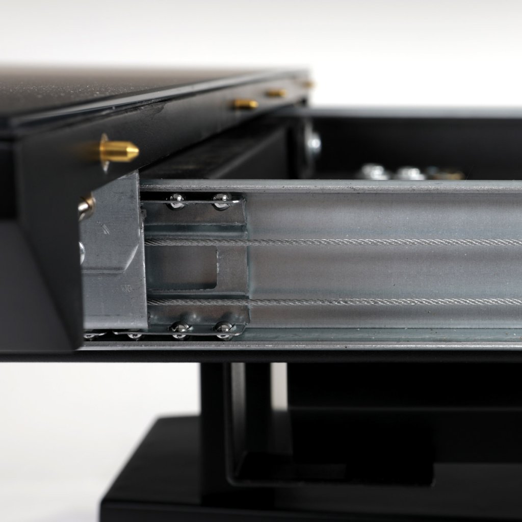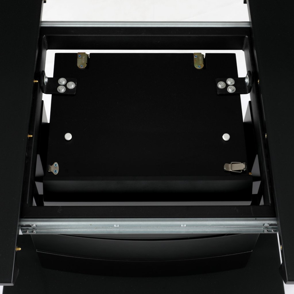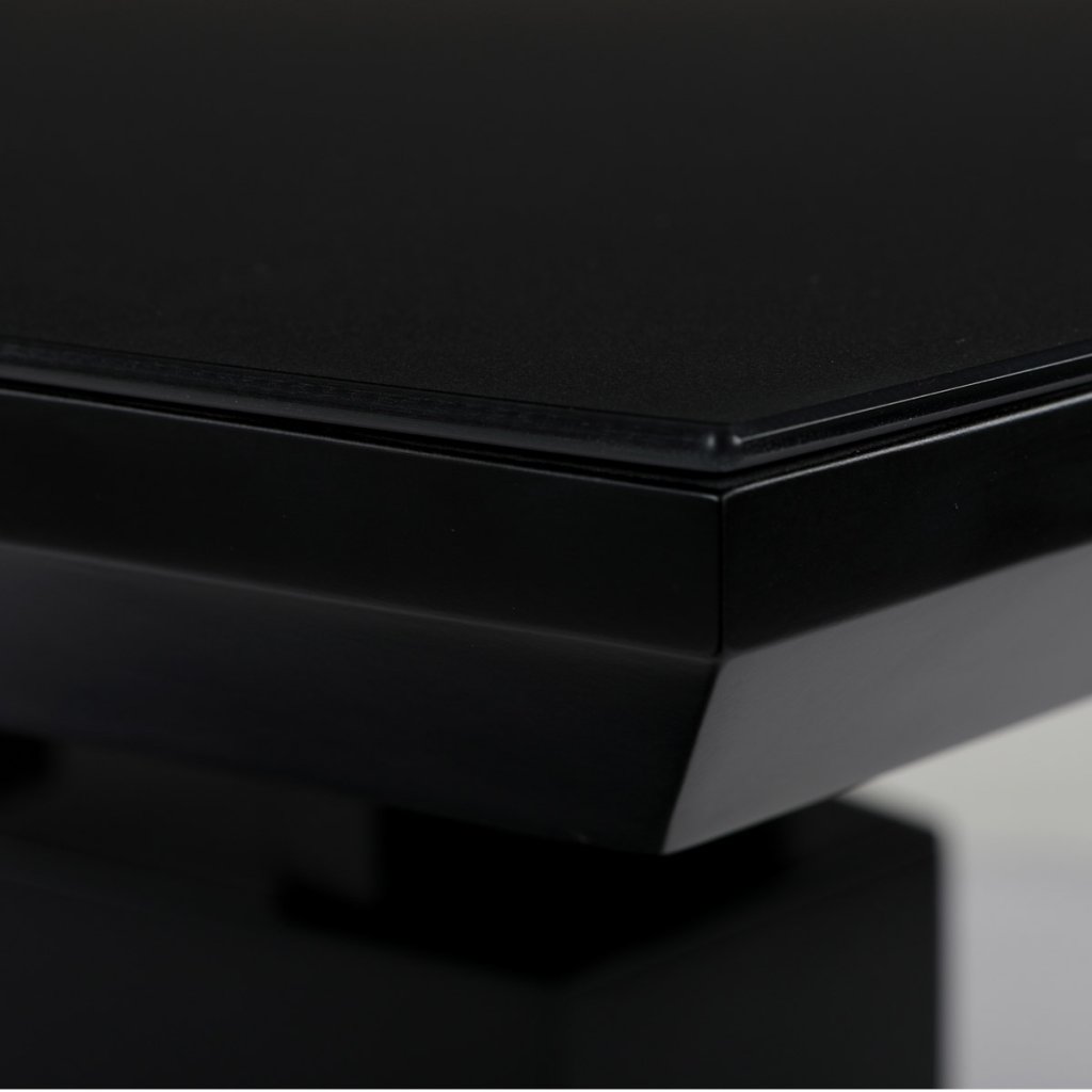 Designový jídelní rozkládací stůl o rozměru 110 + 40 x 70 cm. Vrchní stolová deska je tvrzeného skla tl. 4 mm v černé barvě.Deska je elipsovitého tvaru a na krajích je zúžena ze 70cm na 60,5cm. Podkladová deska, centrální noha a díl rozkladu je z MDF ve slušivé černé matné barvě. Podesta je z také z MDF a krytá černým sklem. Ze spodní části opatřená plastovými kluzáky, eleminujícími poškození povrchů tvrdých podlah. Mechanické součásti jsou kovové. Stůl jistě zaujme svým nadčasovým designem i skvělým zpracováním detailu a v neposlední řadě i barvou a stane se elegantním prvkem v moderních i klasicky laděných jídelnách, kuchyních a obývacích prostorách. Výška stolu je 76 cm. Ke stolu je možné umístit až 6 židlí. Rozměry podnože: podstava - 80 x 40 cm, noha 60 x 18 cm.