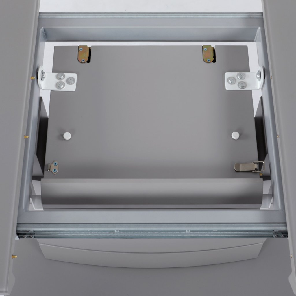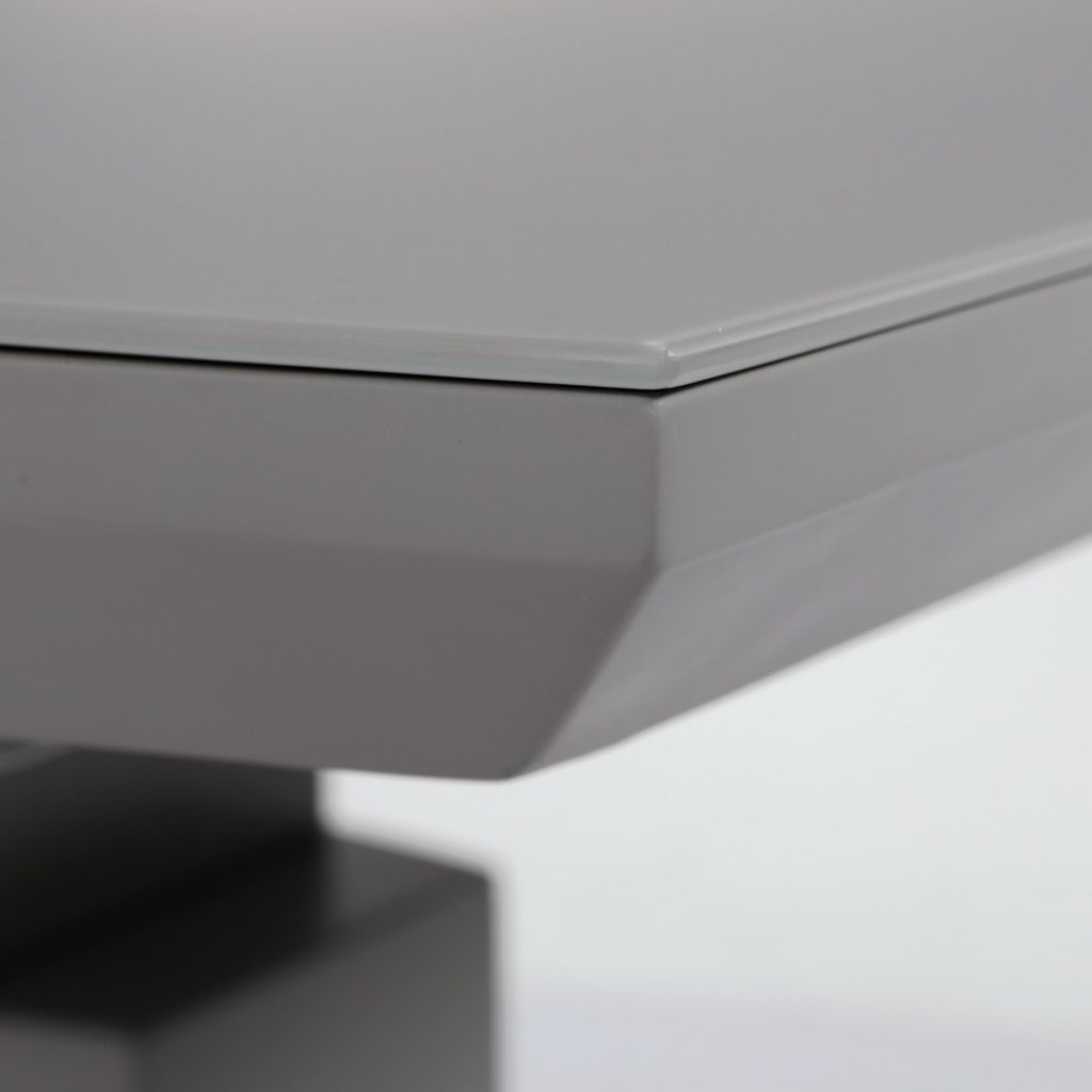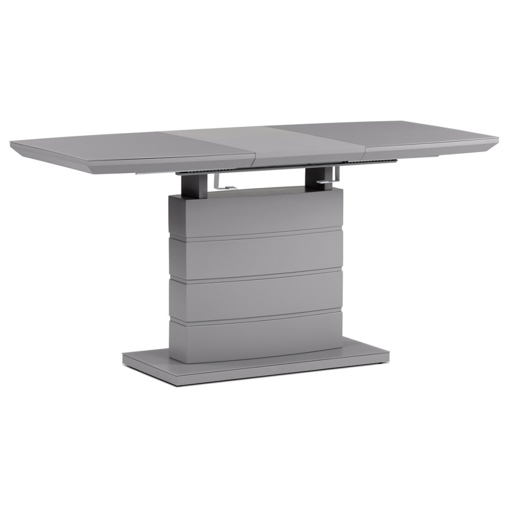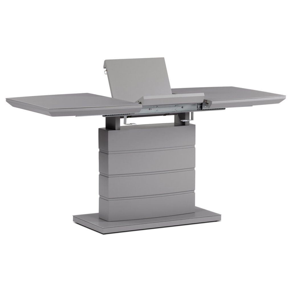 Designový jídelní rozkládací stůl o rozměru 110 + 40 x 70 cm. Vrchní stolová deska je tvrzeného skla tl. 4 mm v šedé barvě.Deska je elipsovitého tvaru a na krajích je zúžena ze 70cm na 60,5cm. Podkladová deska, centrální noha a díl rozkladu je z MDF v šedé matné barvě. Podesta je z také z MDF a krytá šedým sklem. Ze spodní části opatřená plastovými kluzáky, eleminujícími poškození povrchů tvrdých podlah. Mechanické součásti jsou kovové. Stůl jistě zaujme svým nadčasovým designem i skvělým zpracováním detailu a v neposlední řadě i barvou a stane se elegantním prvkem v moderních i klasicky laděných jídelnách, kuchyních a obývacích prostorách. Výška stolu je 76 cm. Ke stolu je možné umístit až 6 židlí. Rozměry podnože: podstava - 80 x 40 cm, noha 60 x 18 cm.