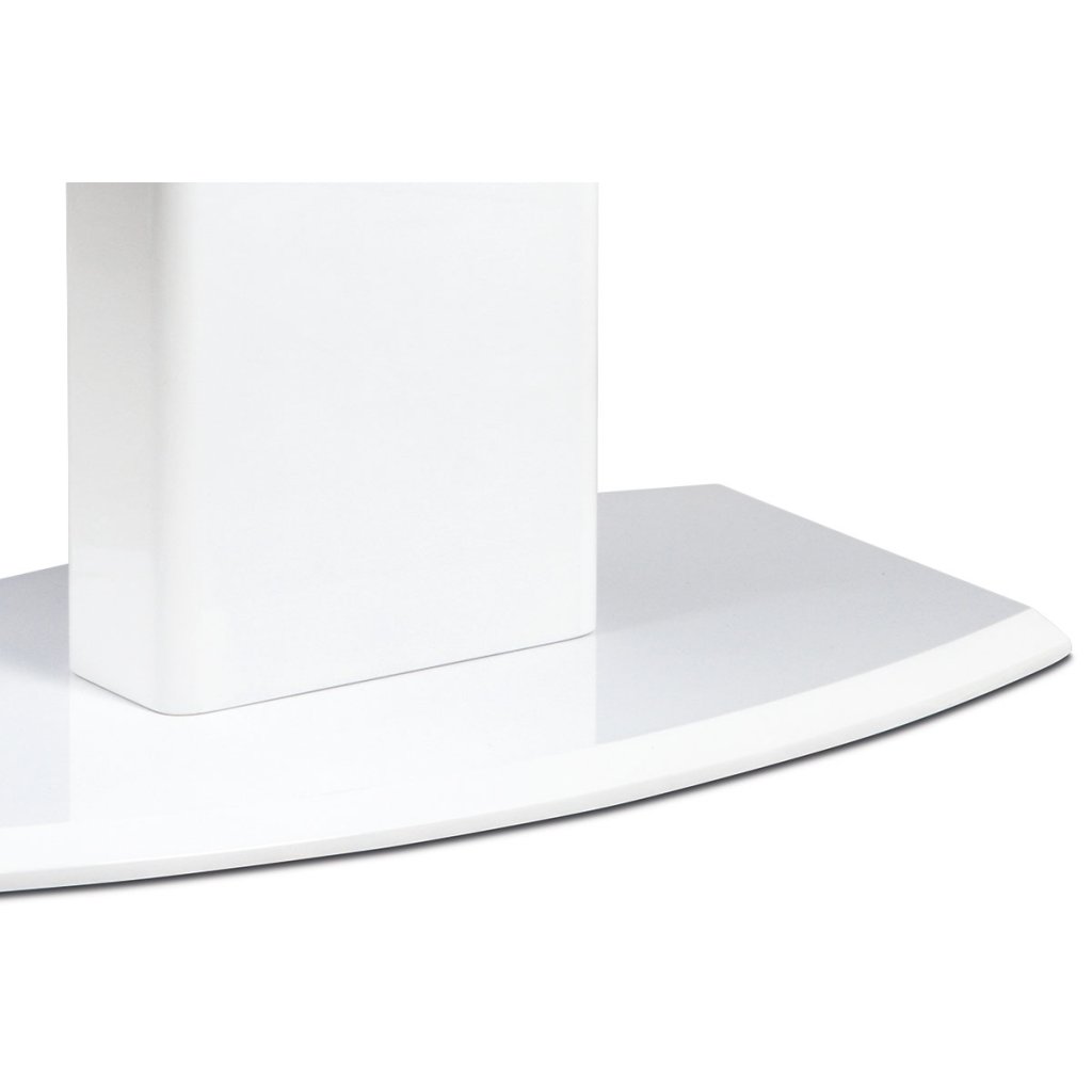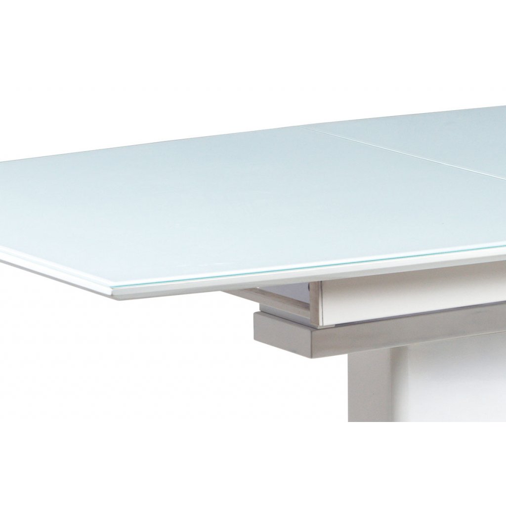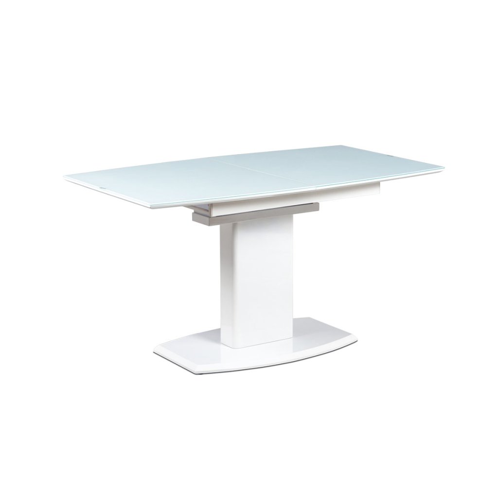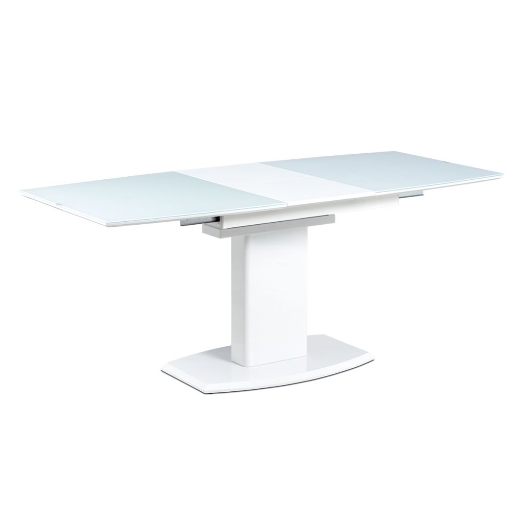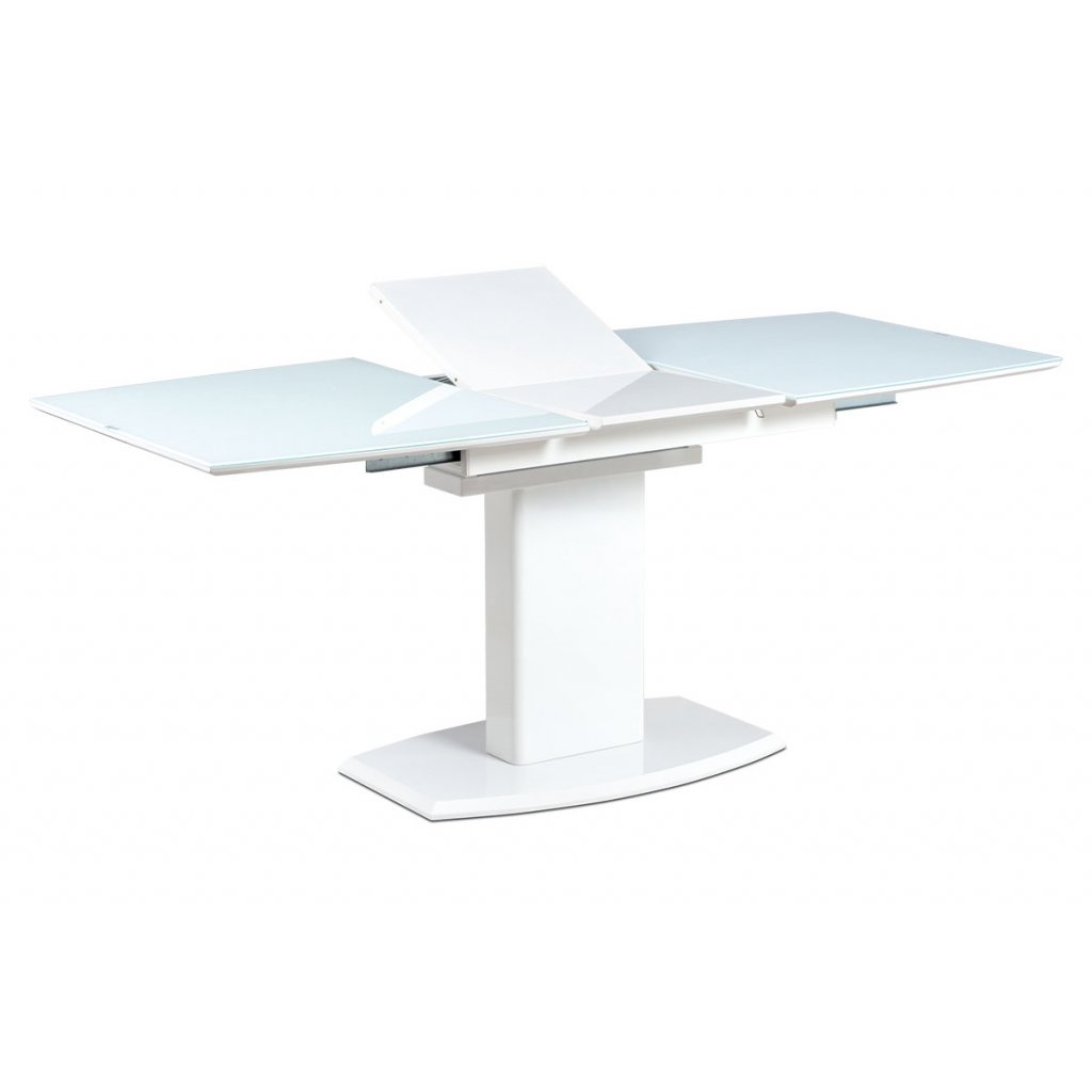 Jídelní stůl 140+40x80 cm, bílé sklo + bílá MDF AT-4012 WT 140+40x80x76 Moderní jídelní stůl s 2 cm vysokou MDF deskou bílé barvy v provedení vysoký lesk se stane skvělou součástí moderní kuchyně či jídelny. Součástí desky stolu, která má lehké oblé tvary, je i 6 mm vysoké temperované mléčné sklo a přídavná, 40 cm široká MDF deska, která je ukryta pod hlavní deskou. Přídavná deska je z MDF bílé barvy ve vysokém lesku a opatřena vyfrézovaným madlem, pro snazší vytažení desky. Centrální noha je z MDF bílé barvy ve vysokém lesku, stejně jako podstavec, který má rozměry 80x50x4 cm.