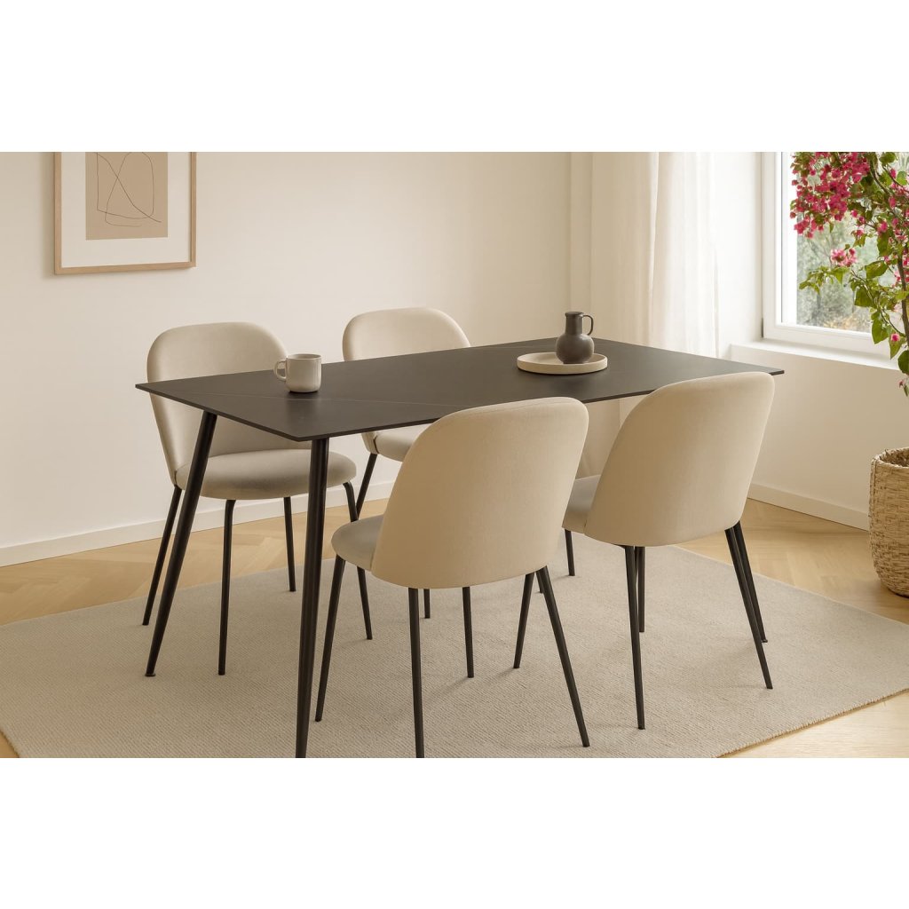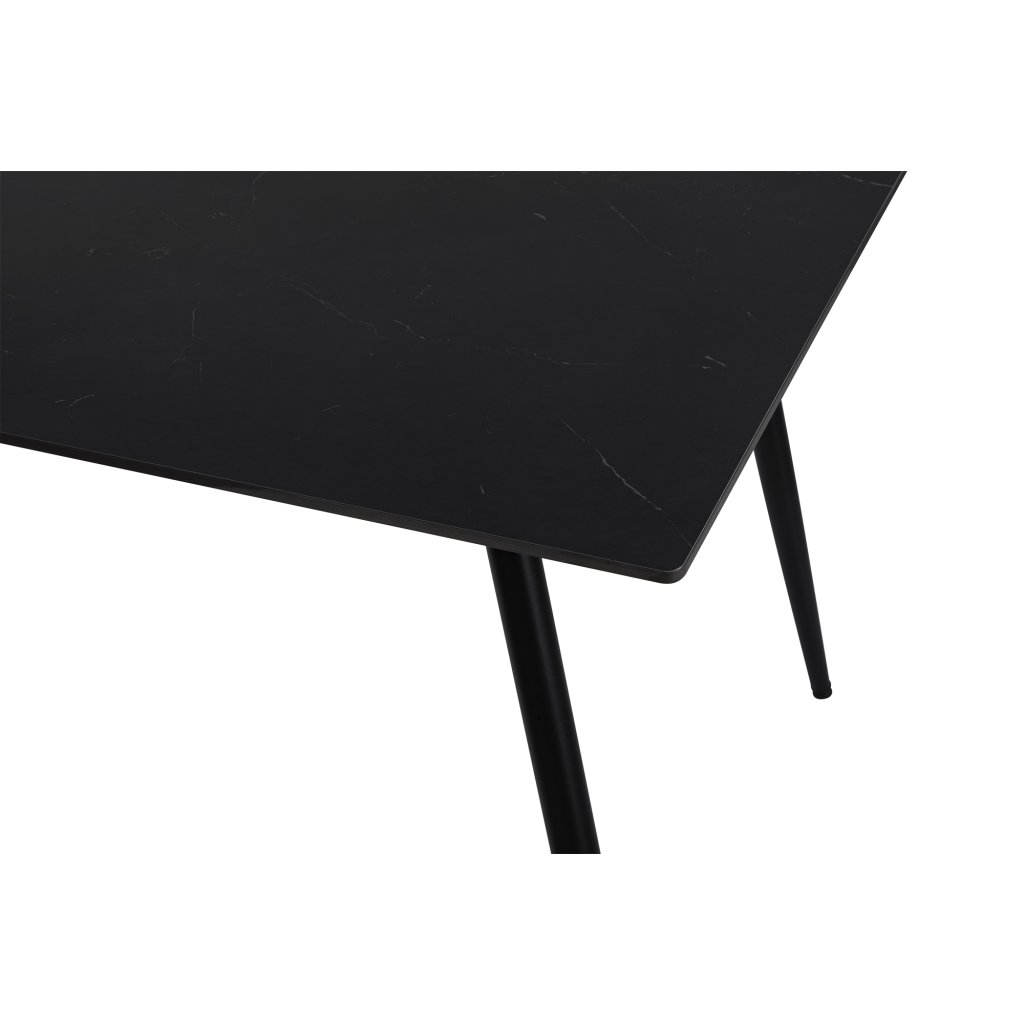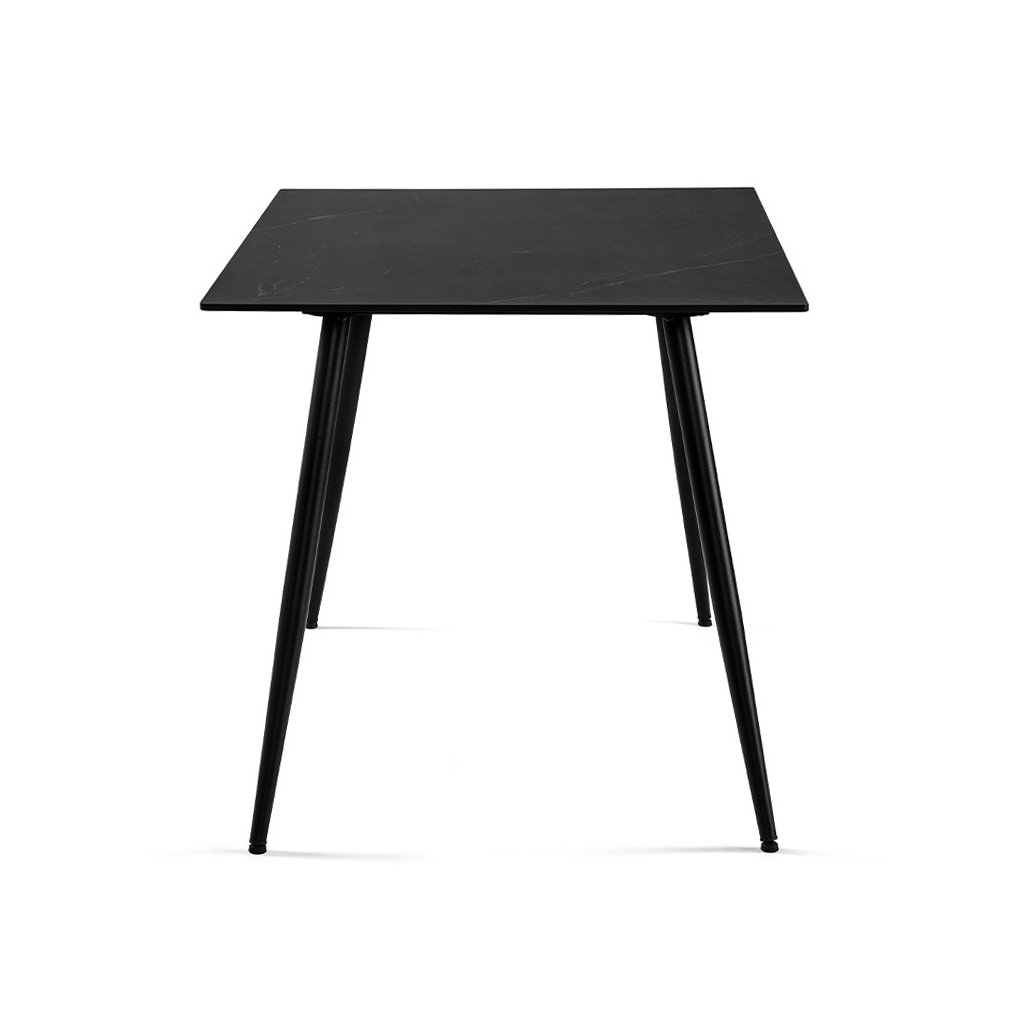 Elegantní jídelní stůl s moderním minimalistickým designem. Deska v černé barvě s mramorovým dekorem působí luxusně a nadčasově. Stabilní kovové nohy v černém provedení. Vhodný do jídelny, kuchyně i menších interiérů. Spojuje praktičnost, odolnost a stylový vzhled.