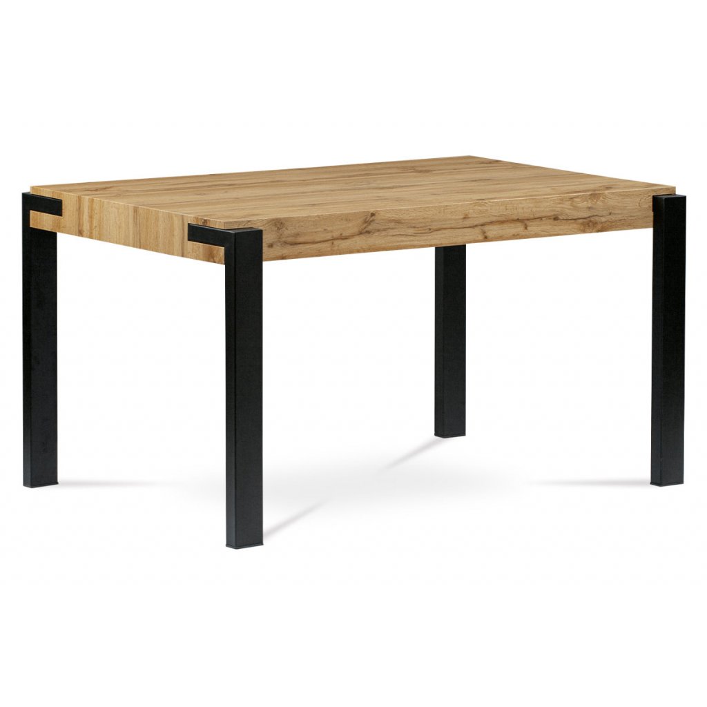 Jídelní stůl 140x88 cm s deskou v dekoru dub divoký v kombinaci s kovovými nohami v černé barvě.
