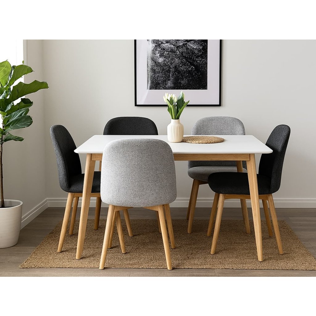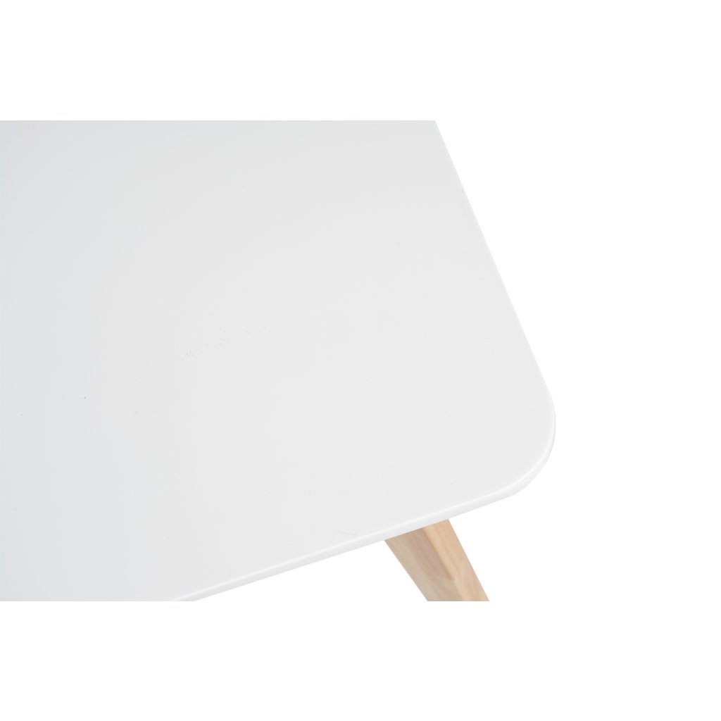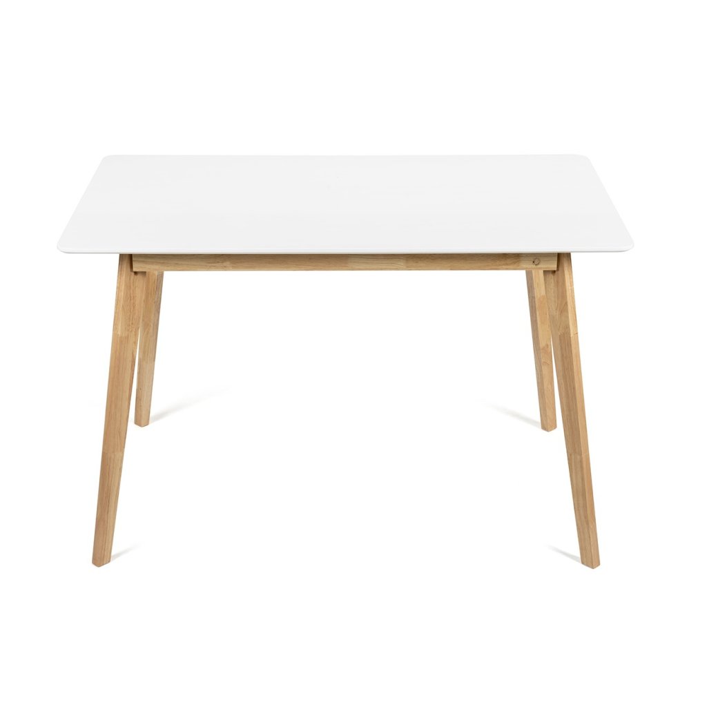 Obdélníkový jídelní stůl s moderním skandinávským designem. Bílá stolová deska dodává interiéru čistý a elegantní vzhled. Stabilní nohy z přírodního dřeva pro hřejivý dojem. Vhodný do jídelny, kuchyně či menších bytových prostor. Spojuje jednoduchost, praktičnost a nadčasový styl