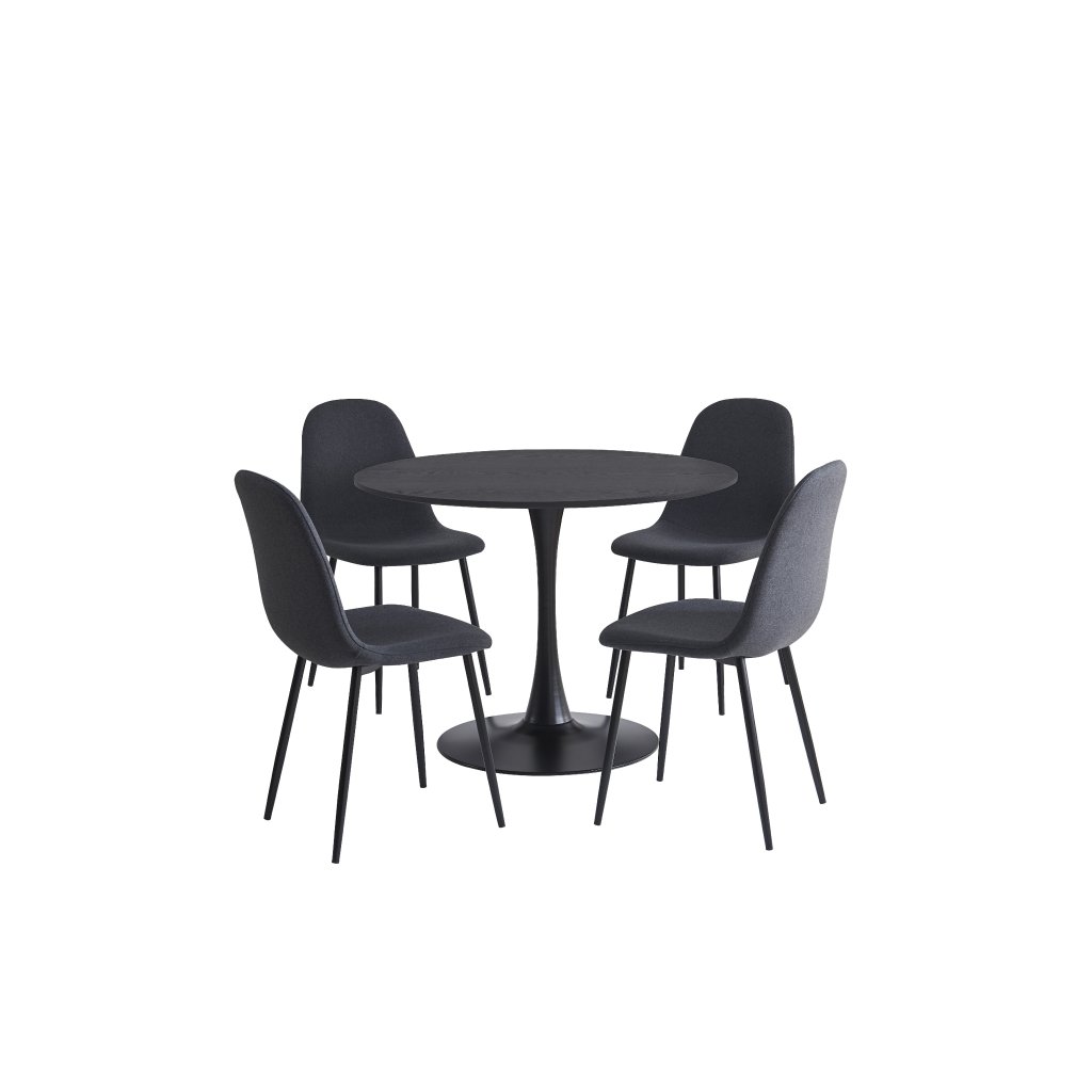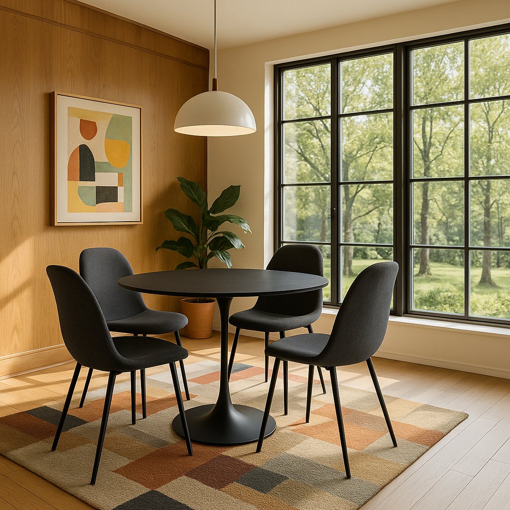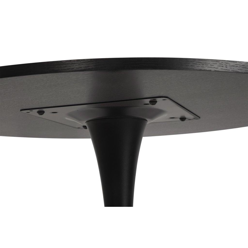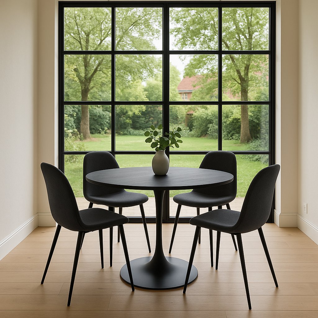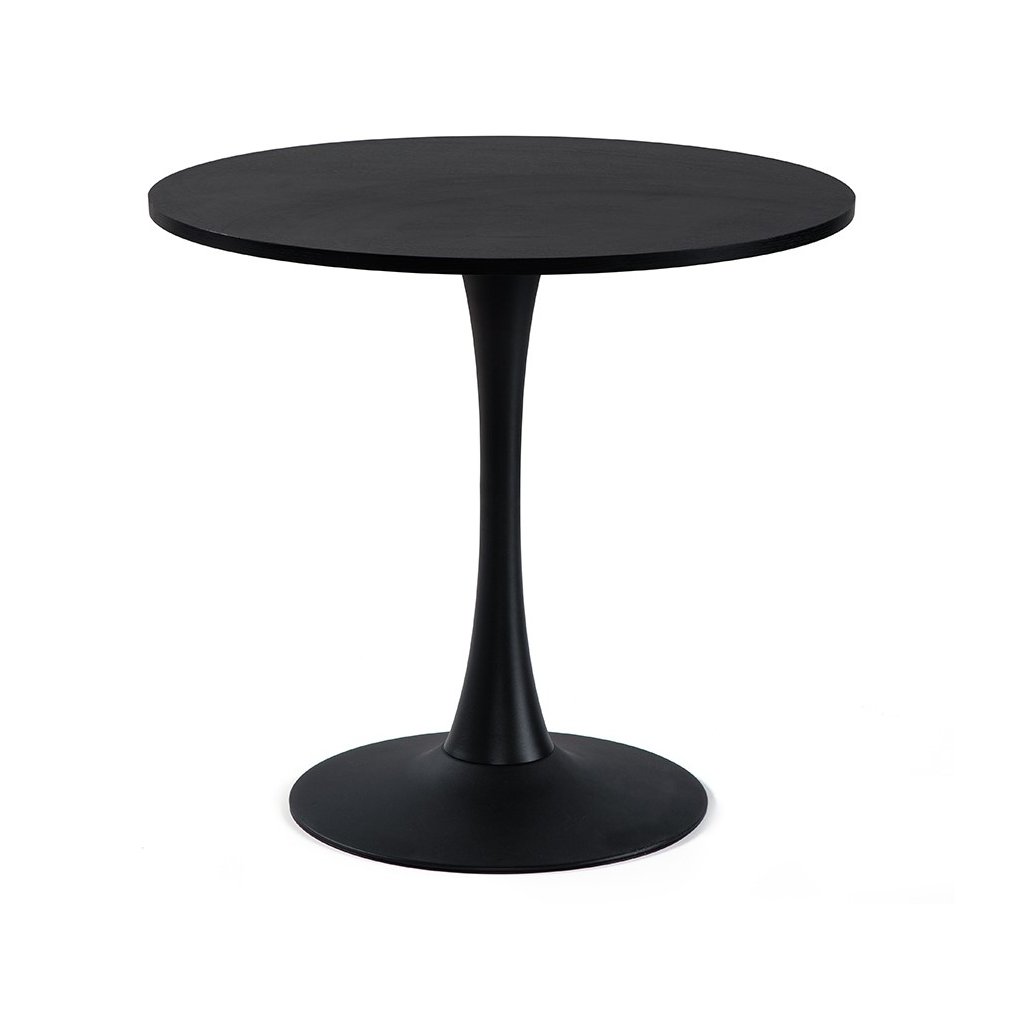 Kulatý jídelní stůl s moderním minimalistickým designem. Černá stolová deska dodává interiéru elegantní a sofistikovaný vzhled. Stabilní centrální noha zajišťuje pohodlné sezení kolem stolu. Vhodný do jídelny, kuchyně či kavárenských prostor. Spojuje styl, praktičnost a nadčasovou eleganci.