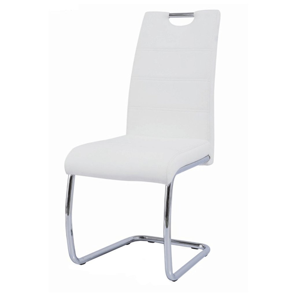 Pohodlná jídelní židle v bílém provedení ekokůže s chromovým rámem a vysokou opěrkou zad, která je zdobena prošitím. Bude se Vám na ní dobře sedět při rodinných obědech či jiných událostech. Jednoduchý a čistý styl se hodí do každé kuchyně nebo jídelny. Moderní vzhled vytváří hlavně spodní řešení židle v podobě oblouku z kovu bez zadní opěry. Pokud máte rádi jinou barvu nabízí se další tlumené odstíny. Materiál židle je nenáročný na údržbu. Dodáváno v demontu.