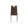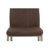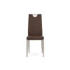 Moderní jídelní židle s jednoduchým designem je čalouněná příjemnou hnědou látkou s prošitím sedáku i opěráku. Kovová podnož je lakovaná lesklou barvou v odstínu cappuccino a součástí jsou i černé plastové kluzáky, které snižují riziko poškození podlahy. Pro snazší manipulaci je židle vybavena kovovým madlem. Nosnost židle je maximálně 110 kg.