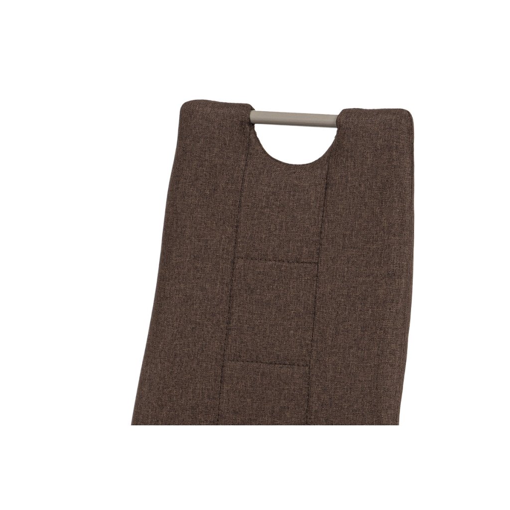 Moderní jídelní židle s jednoduchým designem je čalouněná příjemnou hnědou látkou s prošitím sedáku i opěráku. Kovová podnož je lakovaná lesklou barvou v odstínu cappuccino a součástí jsou i černé plastové kluzáky, které snižují riziko poškození podlahy. Pro snazší manipulaci je židle vybavena kovovým madlem. Nosnost židle je maximálně 110 kg.