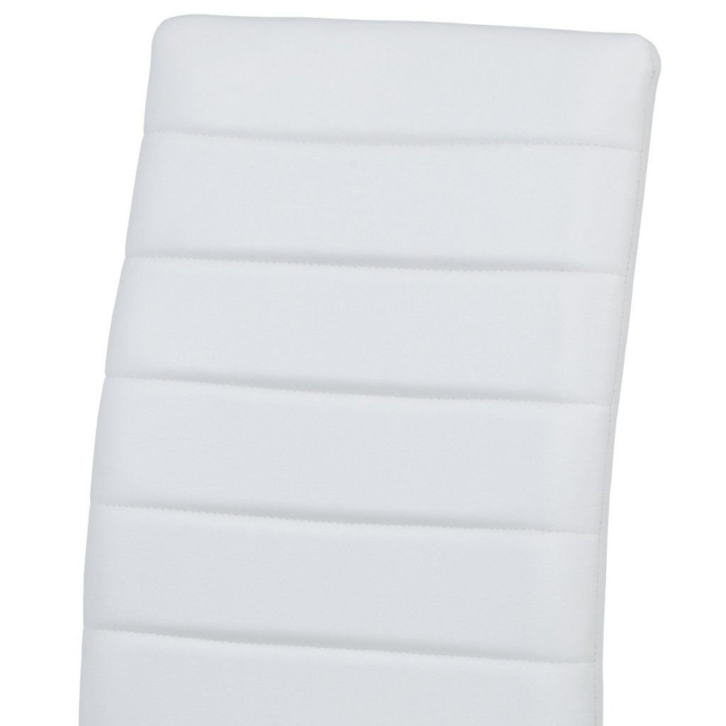 Jídelní židle má sedák a opěrák očalouněn koženkou v bílé barvě. Podnož je v odstínu šedý lak. Opěrák je vodorovně prošitý. Perfektně se díky svému designu hodí k tmavému stolu a jídelně dodá díky své bílé barvě jemný a čistý nádech. Jídelní židle je moderní a zapadne tak lehce do nadčasových kuchyní. Podnož židle je pružná, kovová a upravena šedým lakem. Nosnost je do 110kg. dodáváno v demontovaném stavu.