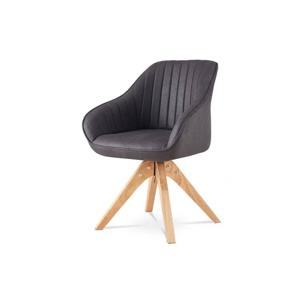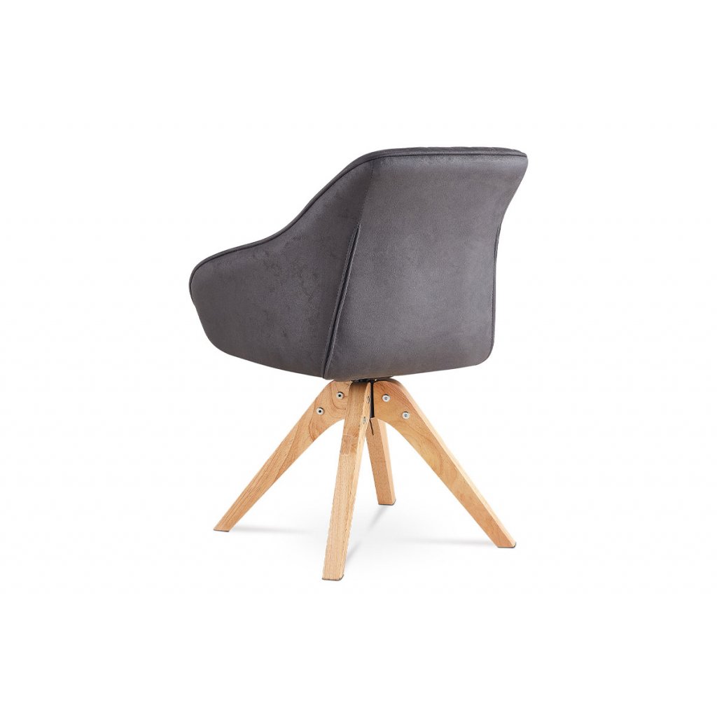 Tato židle / polokřeslo s područkami zaujme milovníky skandinávského a retro stylu. Potah otočné židle je z látky v dekoru broušené kůže v trendové šedé barvě a díky čalounění z PU pěny je i velmi pohodlná. Stabilní podnož je zhotovena z kovového kříže s otočným mechanismem a nohami z masivního kaučukovníku v přírodním odstínu. Dopřejte si do svého bytu originální židli z této kolekce.
