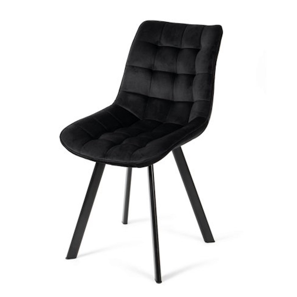 Jídelní židle v černém sametu nabízí kombinaci pohodlí a střídmého designu, který v interiéru působí klidně a elegantně. Sametová látka je měkká na dotek a v kombinaci s prošíváním sedáku vytváří příjemný vizuální i praktický dojem.