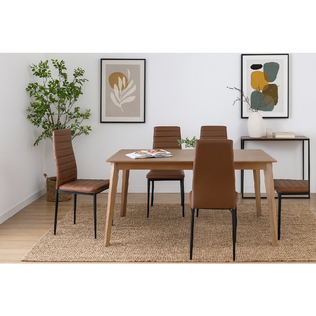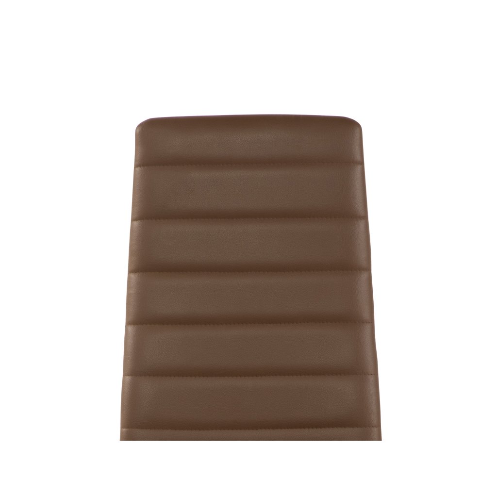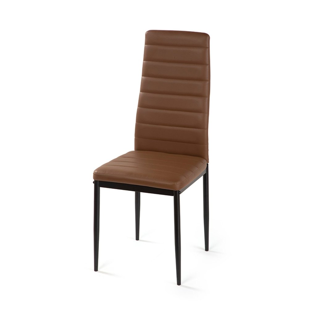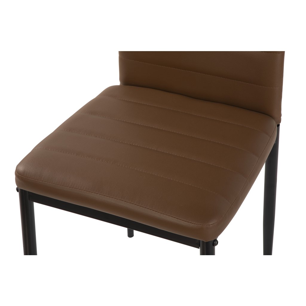 Jídelní židle s čalouněním v hnědé eko kůži nabízí pohodlné a stabilní sezení nejen pro každodenní stolování. Vysoké opěradlo s horizontálním prošitím podporuje správné držení zad, zatímco sedák poskytuje dostatečný komfort.